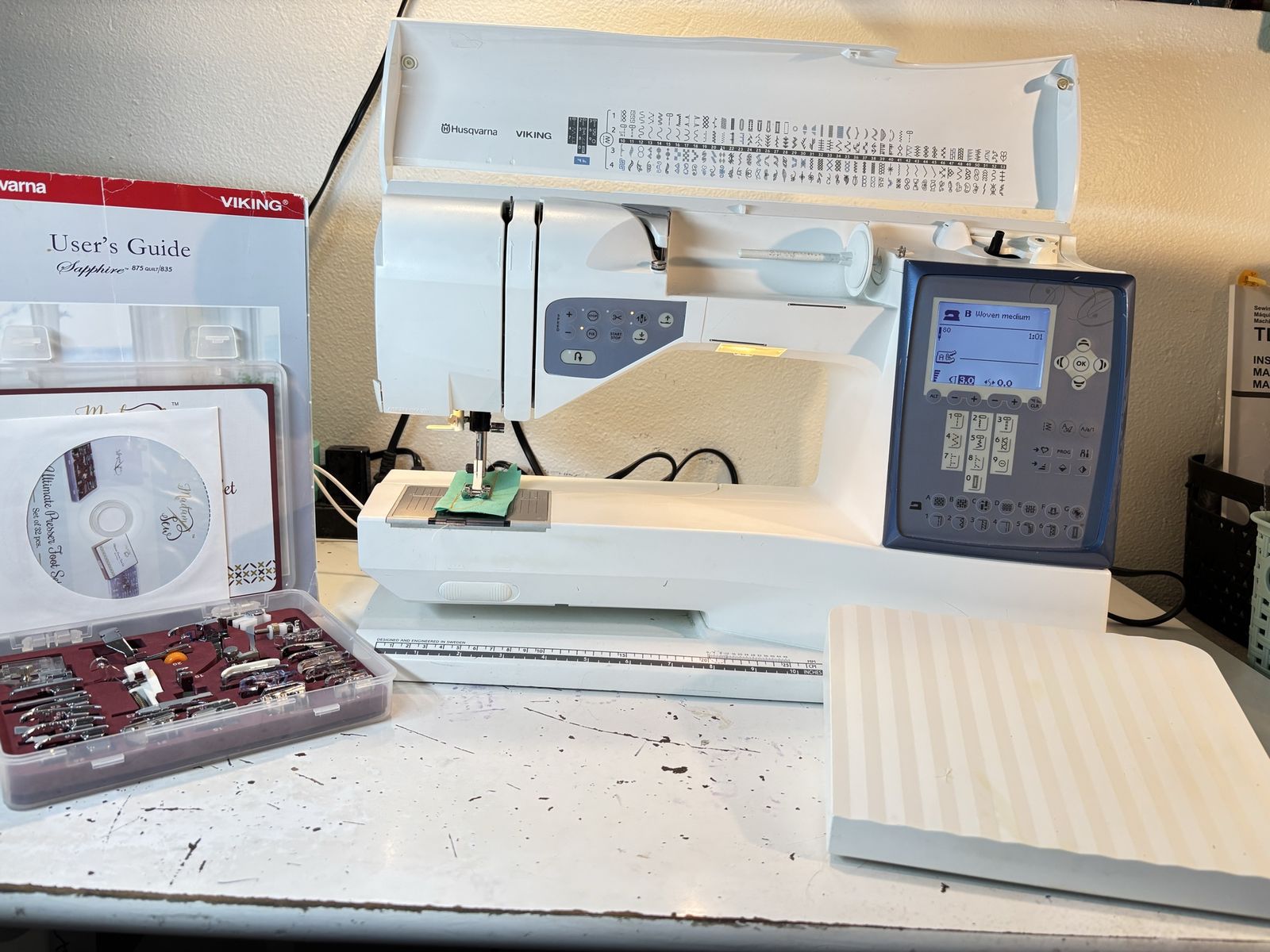 VenmoIn excellent condition Has User’s Guide 32 pcs Ultimate presser foot set with video Accessory box that slides on and off machine All accessories that came with machine Machine has: Needle threader; Automatic thread tension; Sensor foot pressure; Sensor foot lift; Selective thread cutter; Sensor One-Step buttonhole; Decorative stitches, font selection and programming. These are a few things the machine can do
