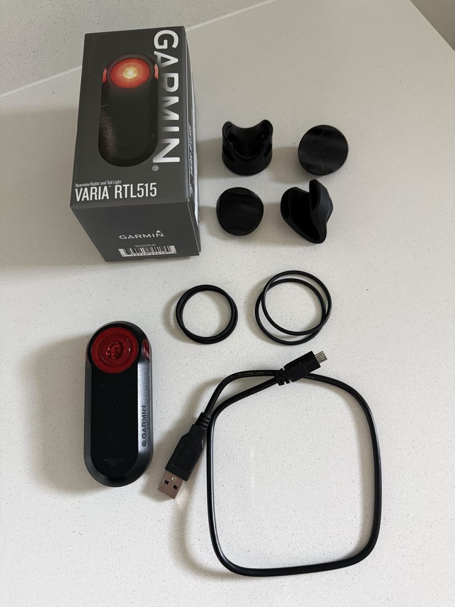 Includes everything from the original box (radar unit, mount, seat post fittings, charging cable, and O-rings).