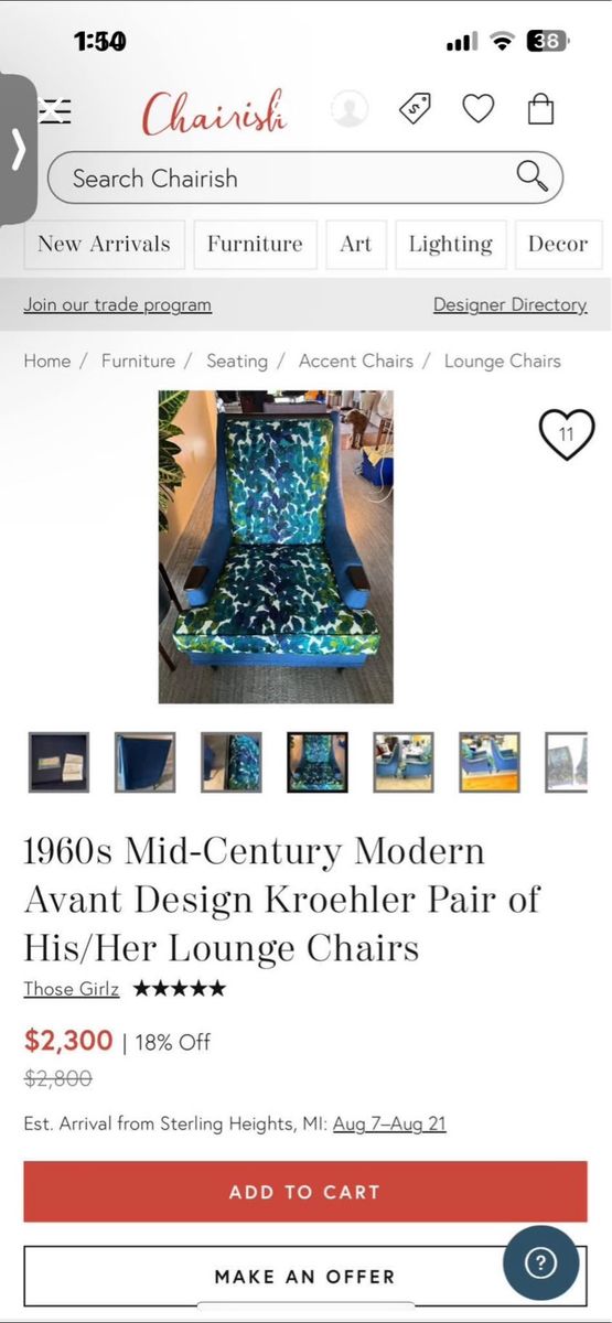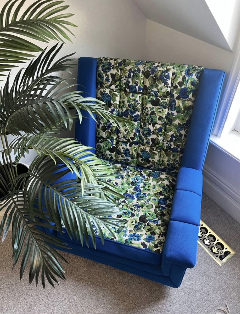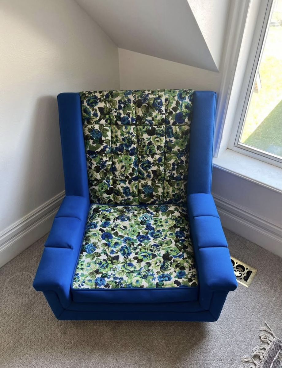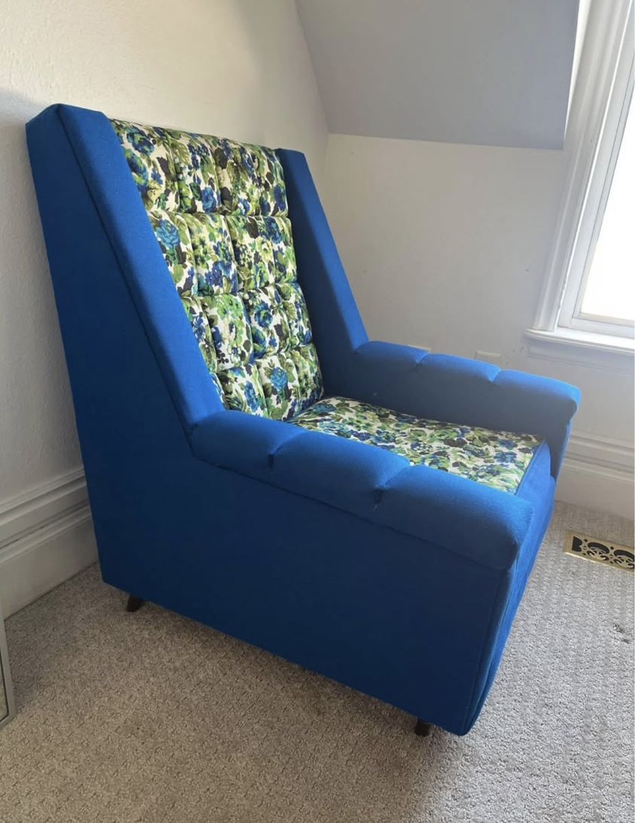 Venmo1960s Mid-Century Modern Chair The guy I purchased this from 10 years ago told me it’s from the 1960’s and if I throw it in Google Search, it also says 1960’s. I can’t find this exact one. The closest I found to it is selling for $1,150 and it’s not nearly as cool as this one. It’s in amazing condition for its age. It has wood legs. It’s such a unique piece. I’ve collected too many amazing furniture pieces over the years and need to let some go. 31 inches wide 31 inches deep Seat is 1 ft tall 33 inches tall at the back Cash or Venmo. Will hold with Venmo payment.
