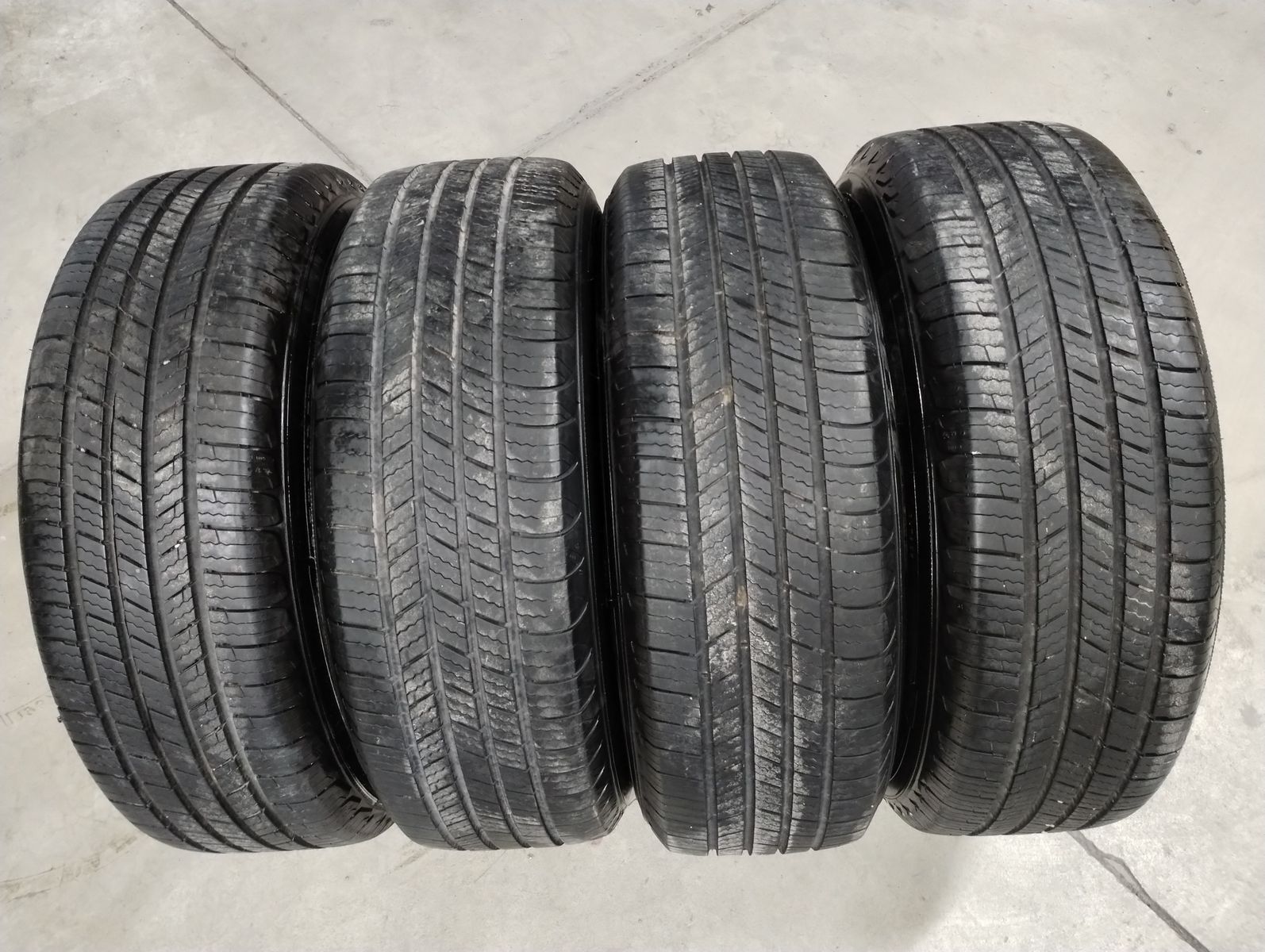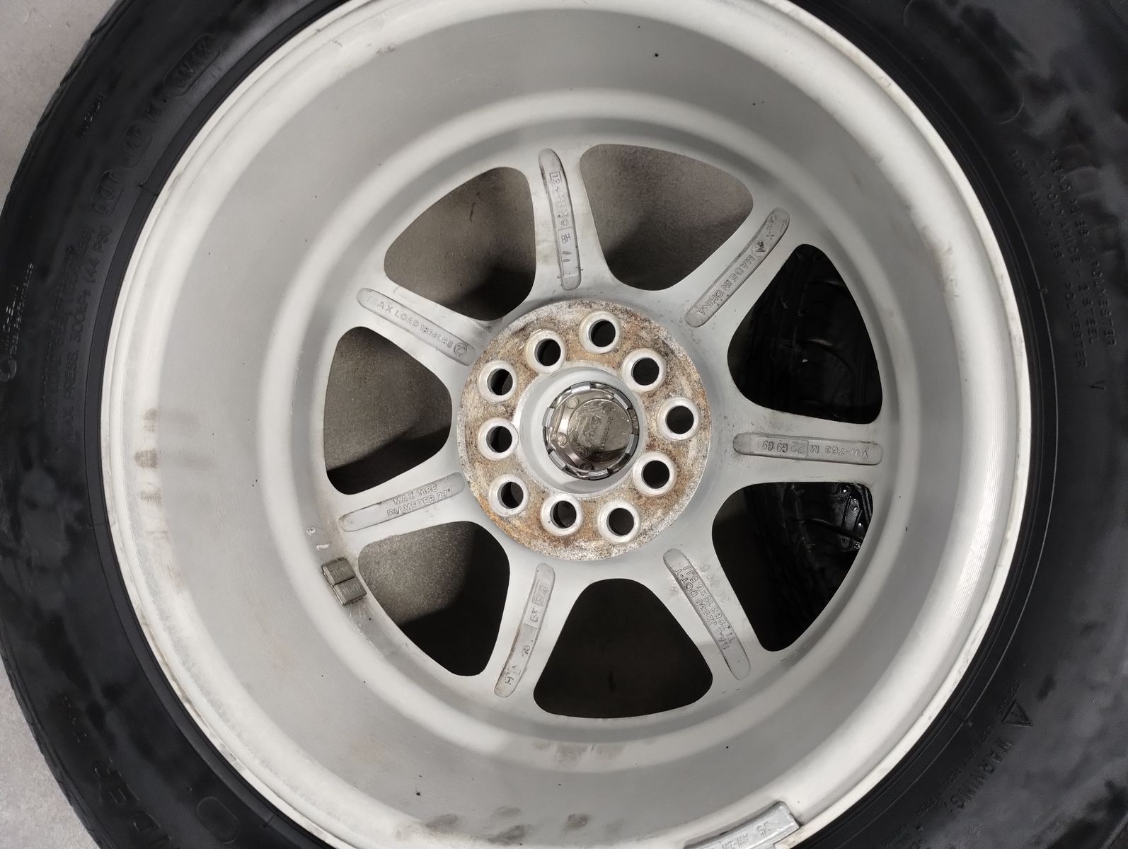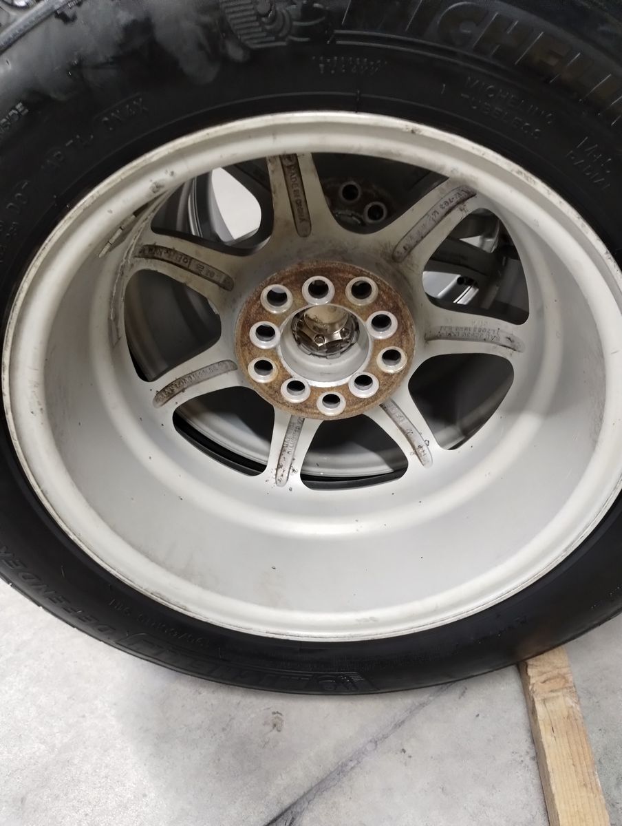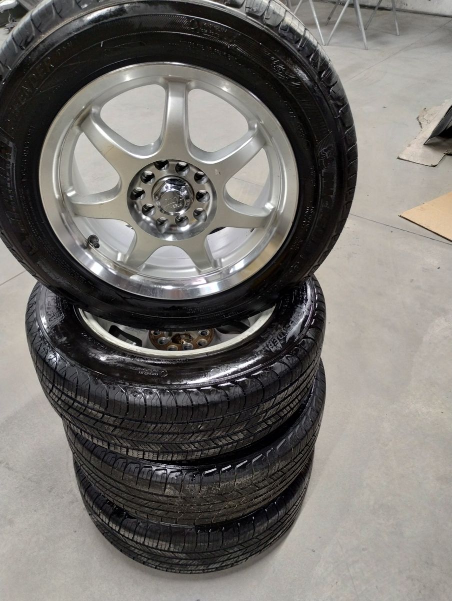 Wheels and tires are all in very good to excellent condition. Tires average 10/32 of tread (brand new is about 11/32), so they have about 95% life left. All center caps included.