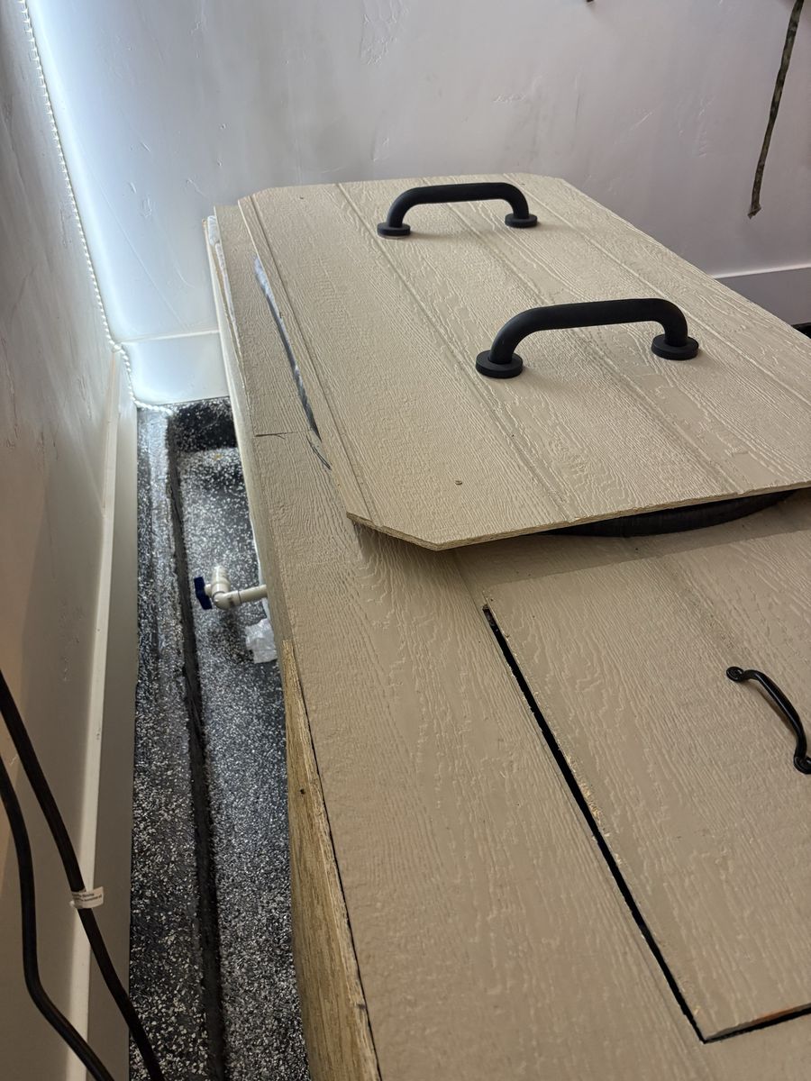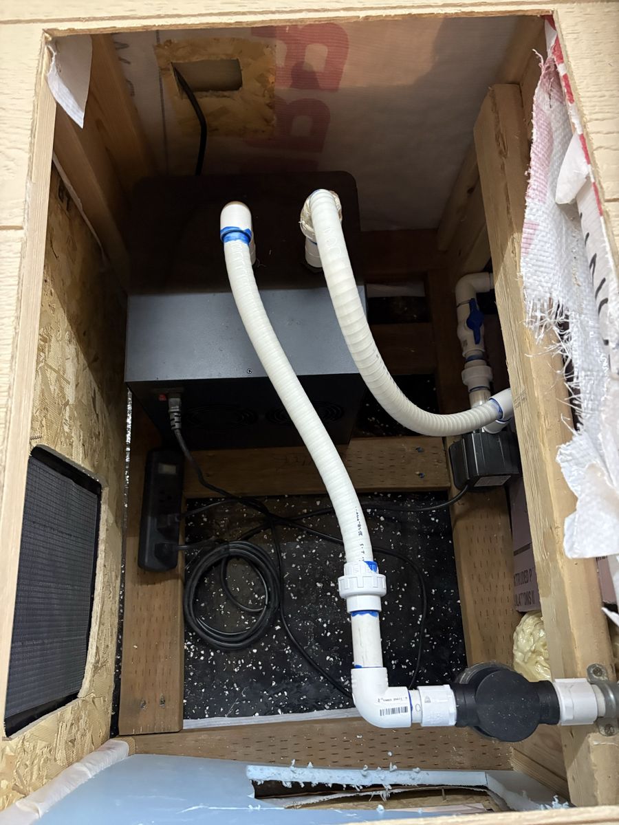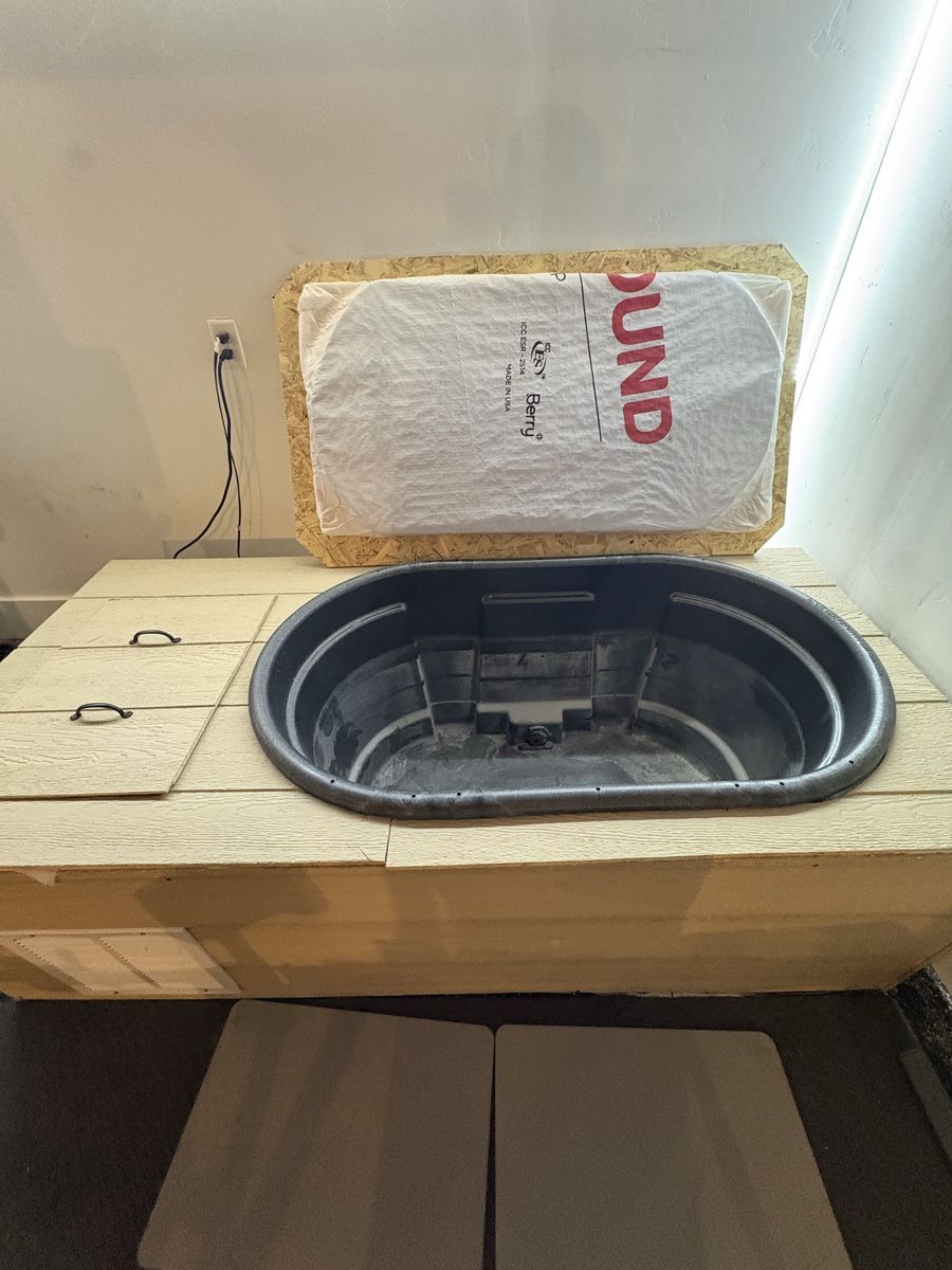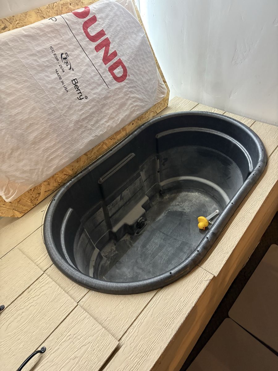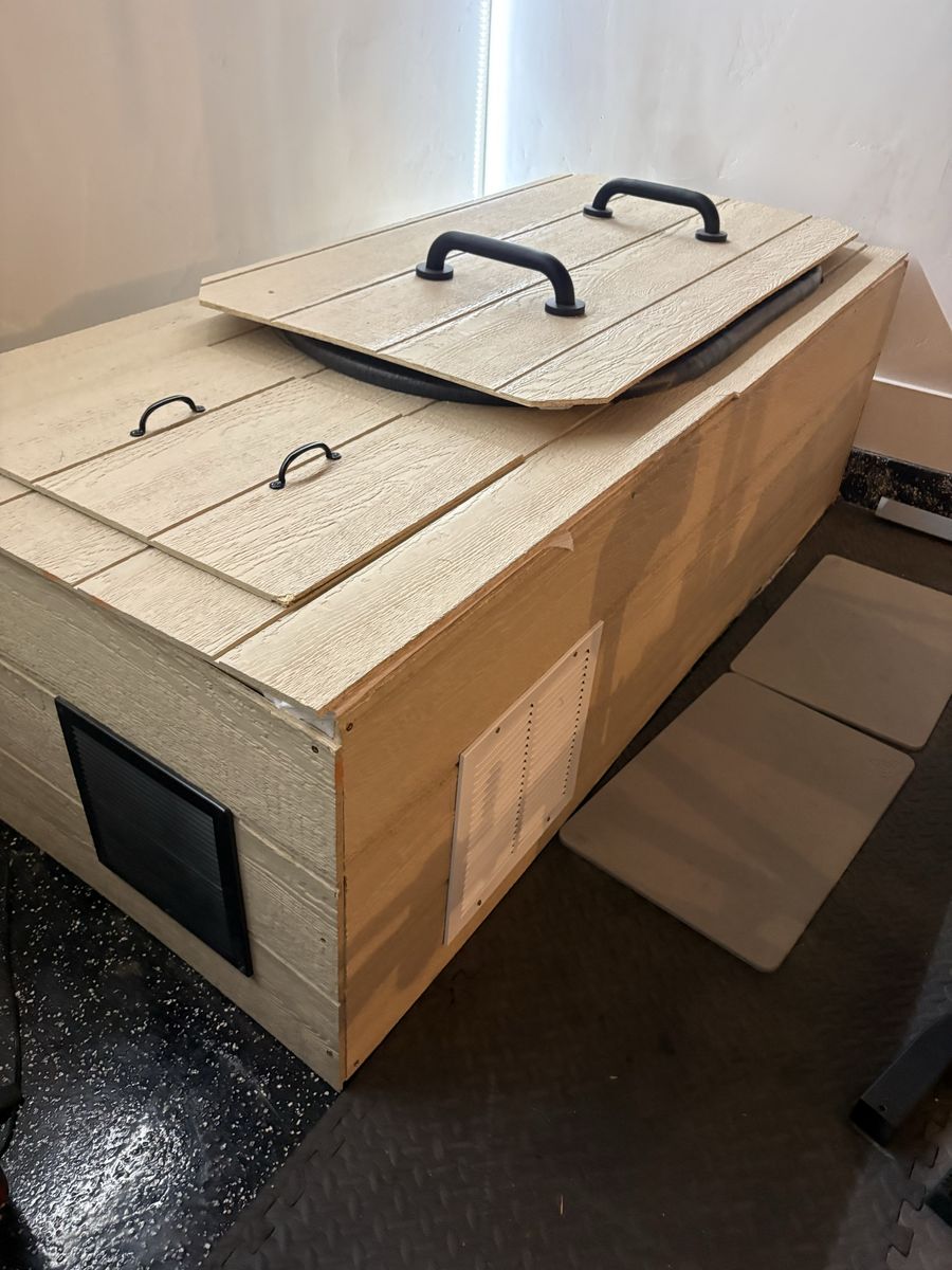 Built this ice bath 2 years ago. Has been great I just don’t use it anymore. Never finished painting it, functionality is great can get down to 30 degrees pretty easily. Everything plugs into a regular outlet. Has in line filter. 100 gallon, has a drain that you can hook up to a hose to drain, spray foam for insulation. Put close to 1000 if not more into it. Let me know if you have questions. Or best offer.