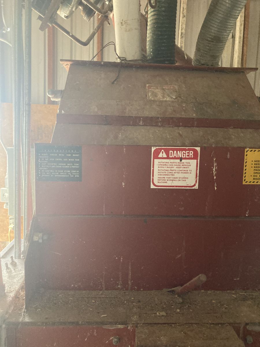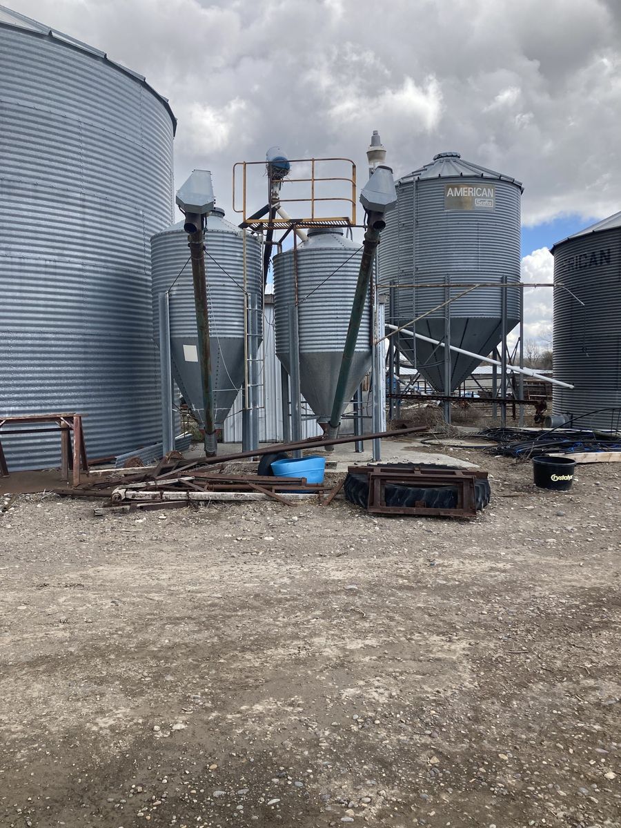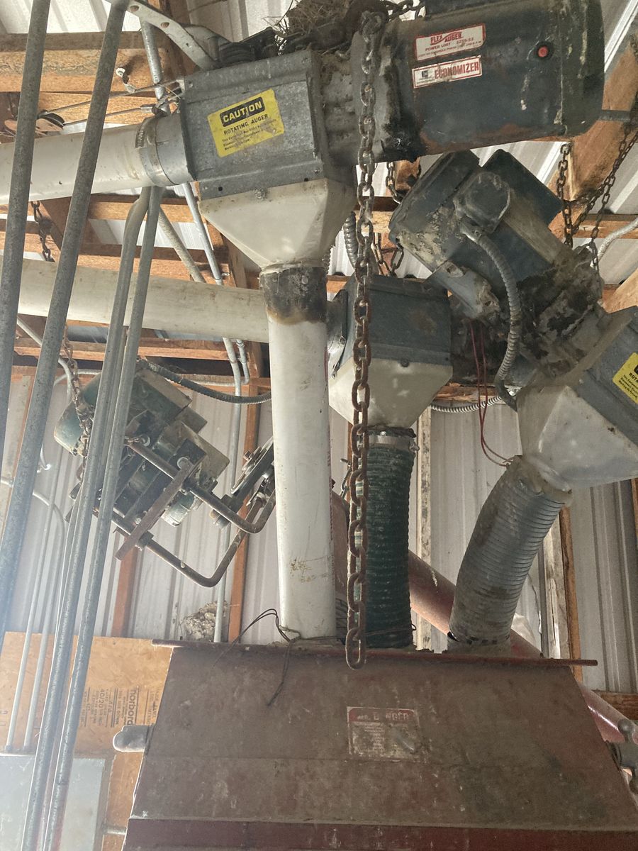 VenmoGrain Roller Mill, peerliss 20in dry roller mill, 7 1/2 HP 1PH single phase, electric motor, with extra regrooved rollers, with rock and trash separator 4 input augers, 1 large cone shaped grain bin, with 2 unloading cone grain bins. With two loading augers.