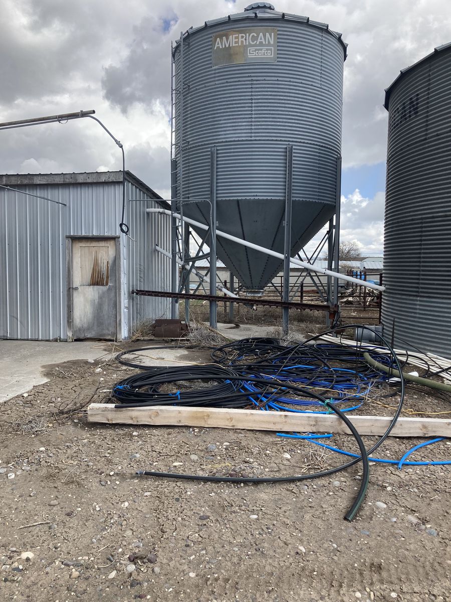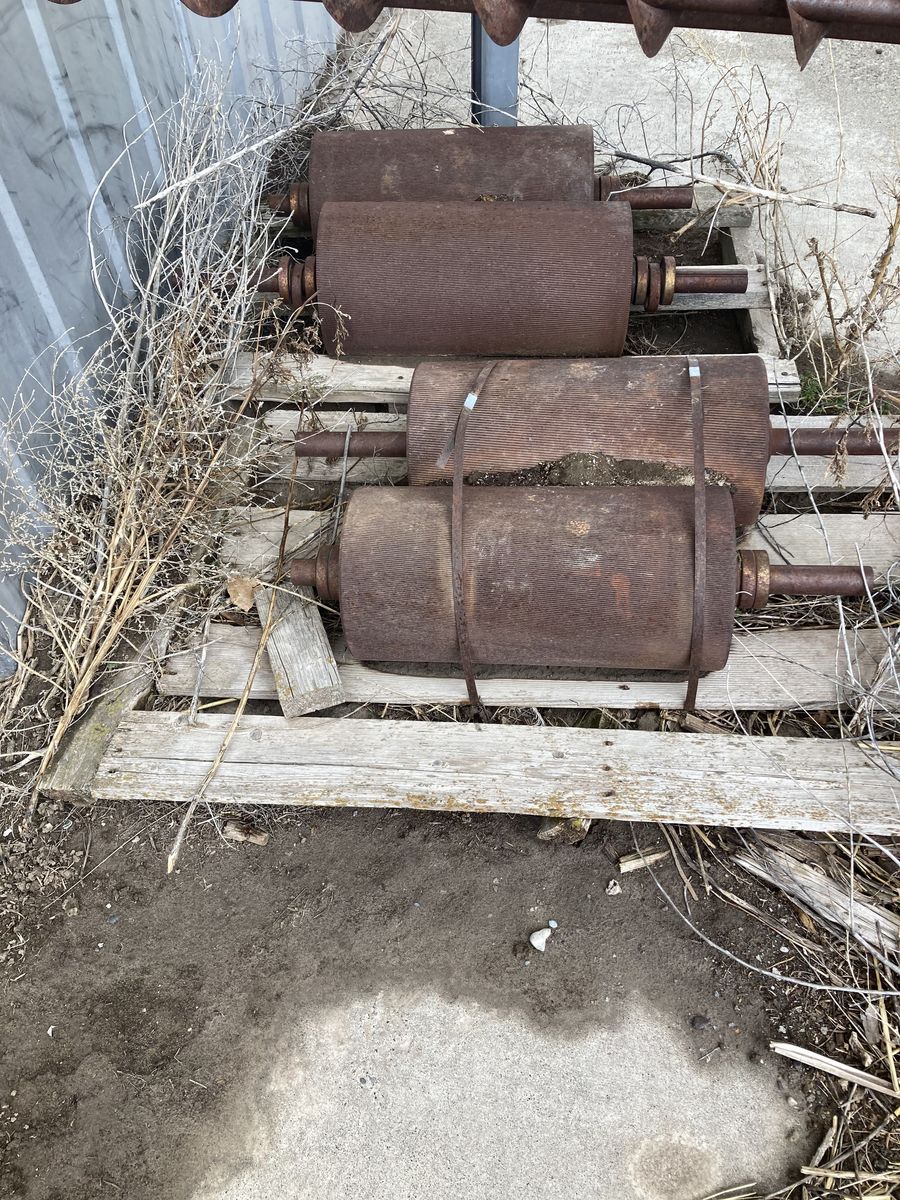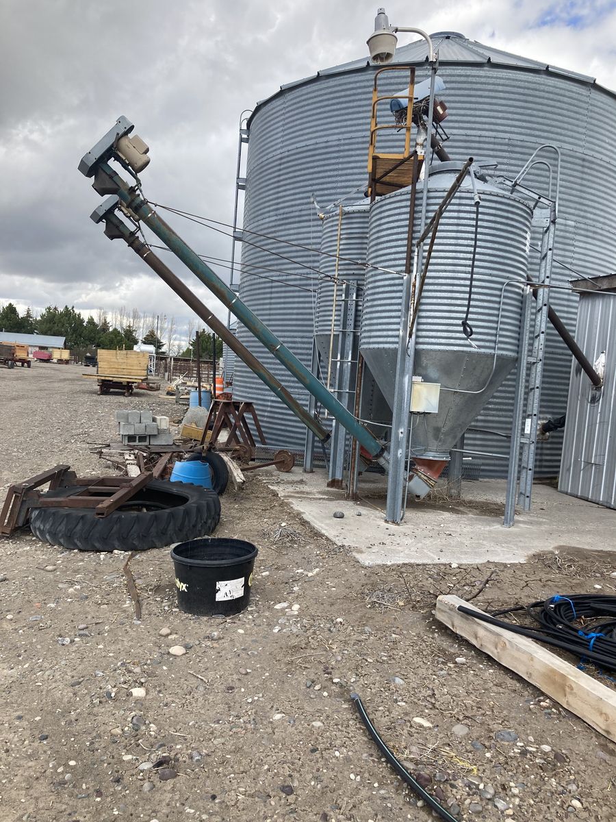 VenmoGrain Roller Mill, peerliss 20in dry roller mill, 7 1/2 HP 1PH single phase, electric motor, with extra regrooved rollers, with rock and trash separator 4 input augers, 1 large cone shaped grain bin, with 2 unloading cone grain bins. With two loading augers.