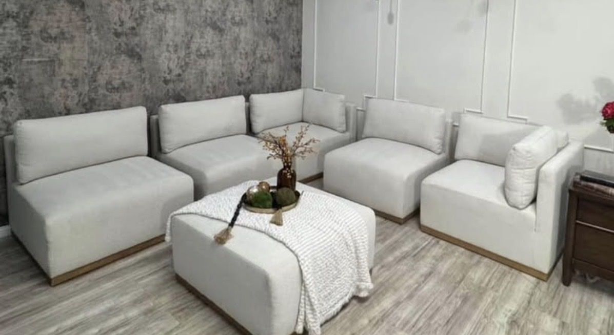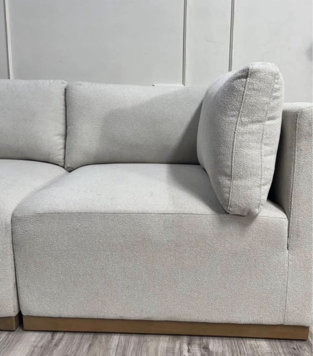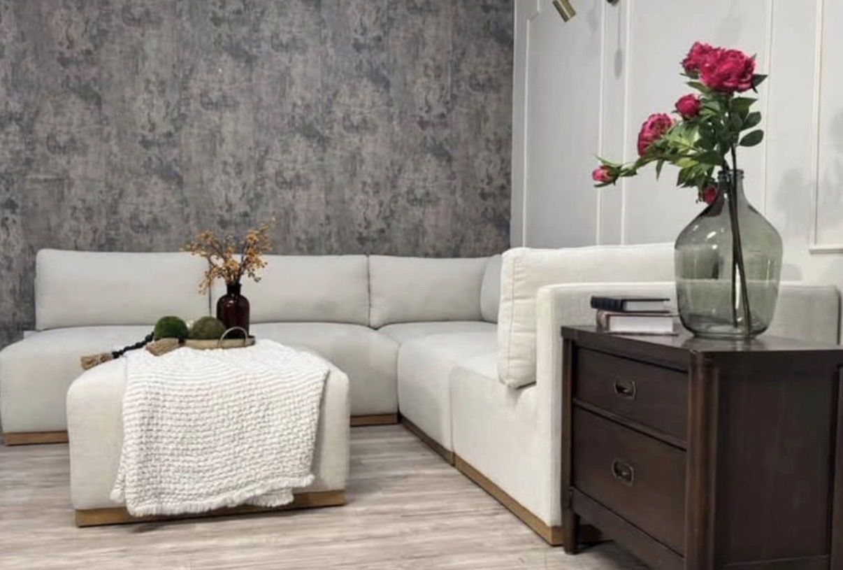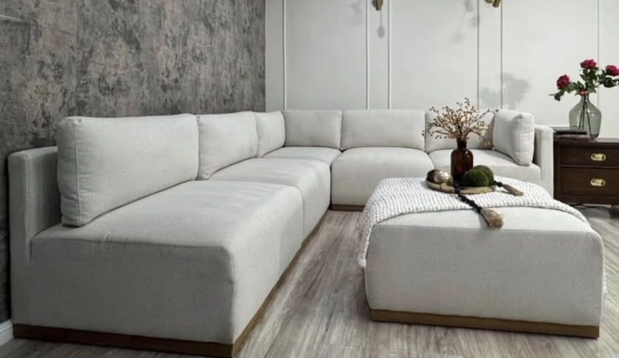 The upscale modular configuration is ideal for comfortably hosting a larger number of guests, ensuring that everyone has a seat to relax. Sit back and relax into the elegant waterfall-style seat cushion designed for maximum comfort and support. Customize and arrange the six modular pieces to fit your unique space and preferences, adapting effortlessly to your evolving lifestyle. The wood trim bases bring a timeless warmth and add a touch of sophistication to any living space. The stylish ottoman serves as a footrest, but its innovative design quickly transforms into a lounger, adding an extra layer of versatility to your space. Indulge in the luxurious softness of boucle fabric. It's not just upholstery; it's a tactile experience.