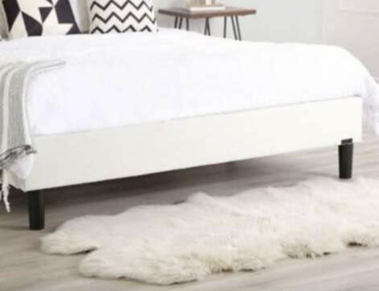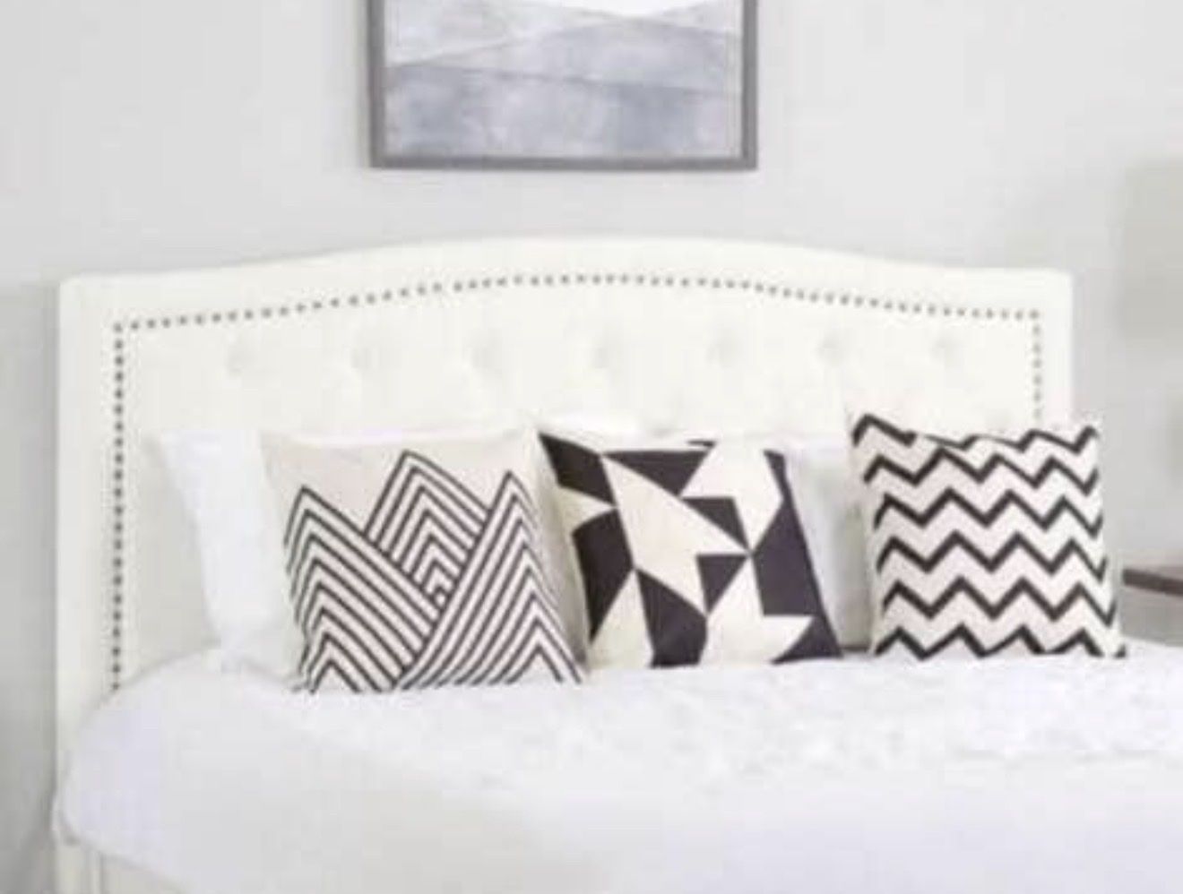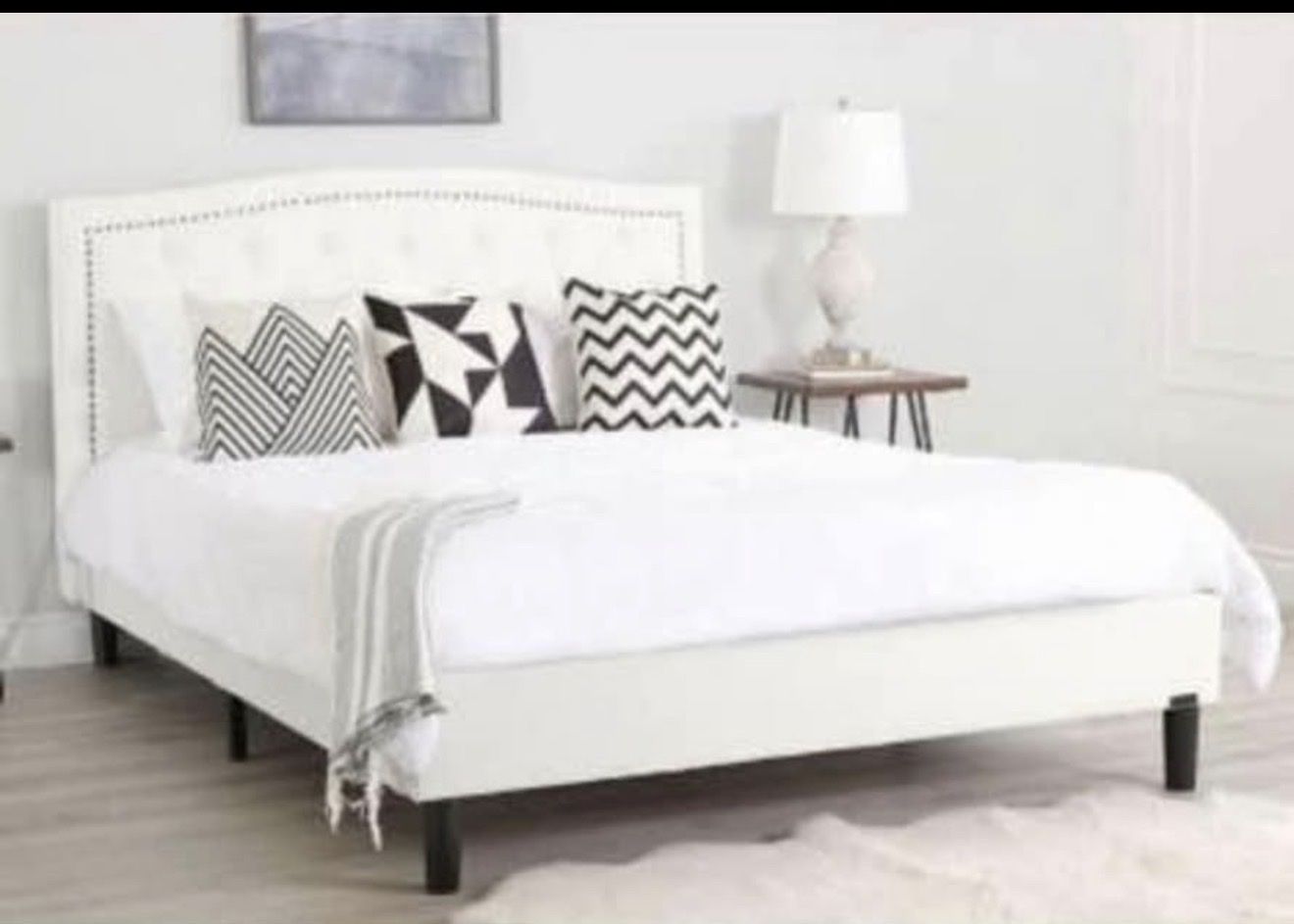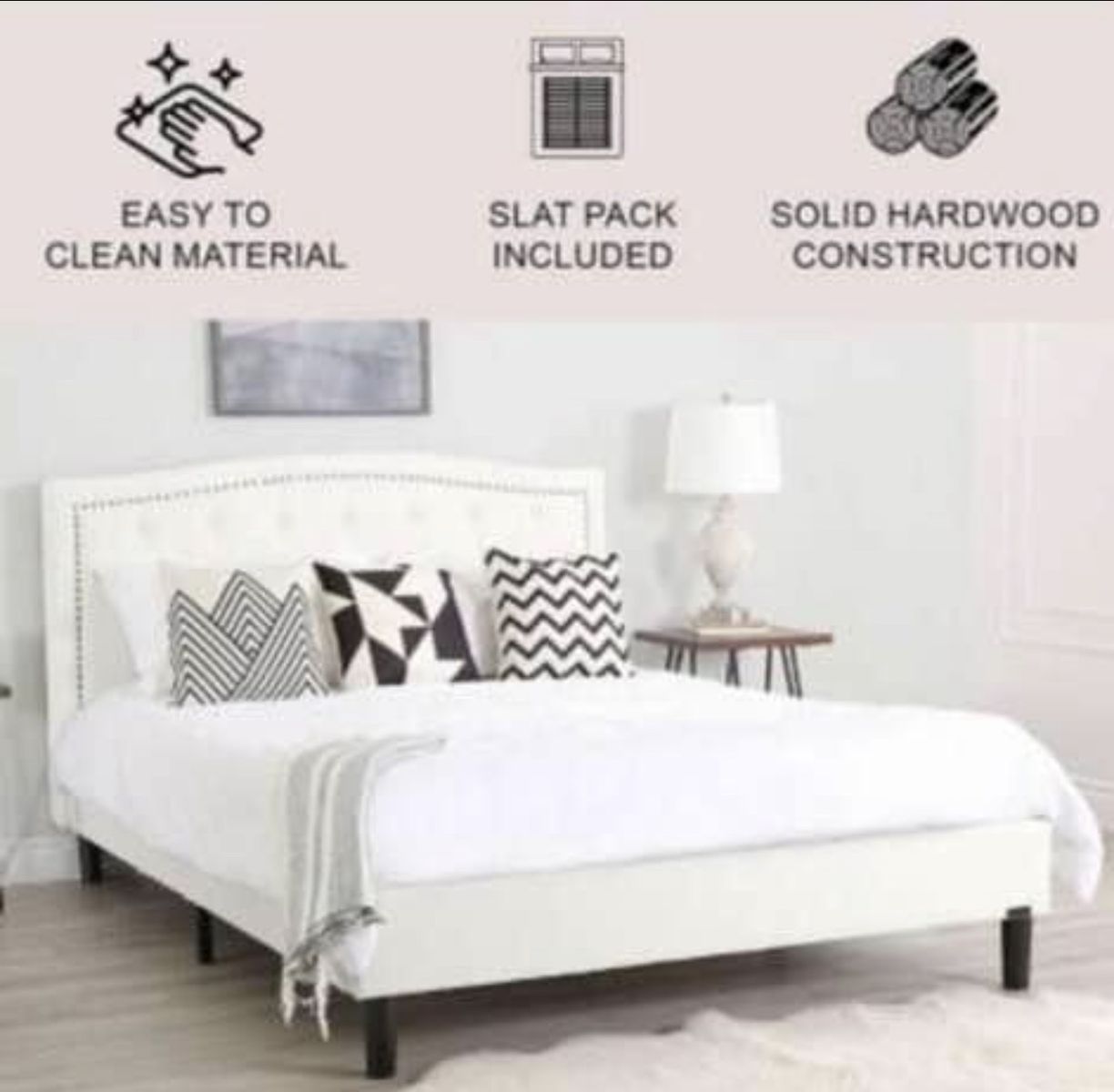 This listing is for the Juliette Queen Tufted Platform Bed Upgrade your bedroom with the Juliette Queen Tufted Platform Bed. , a warm neutral Ivory color. Nailheads are trimmed along the headboard for a touch of glam. This charming bed features durable upholstery and solid wood construction that offers long-lasting durability. The Juliette can be used with or without a box spring since a complete slat pack is included with the bed frame offering optimal support for your mattress. Set includes: Headboard, footboard, rails, legs and slats Materials: Linen fabric and wood Frame Construction: Solid wood and plywood Upholstery Material: 100% polyester