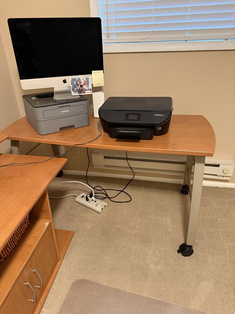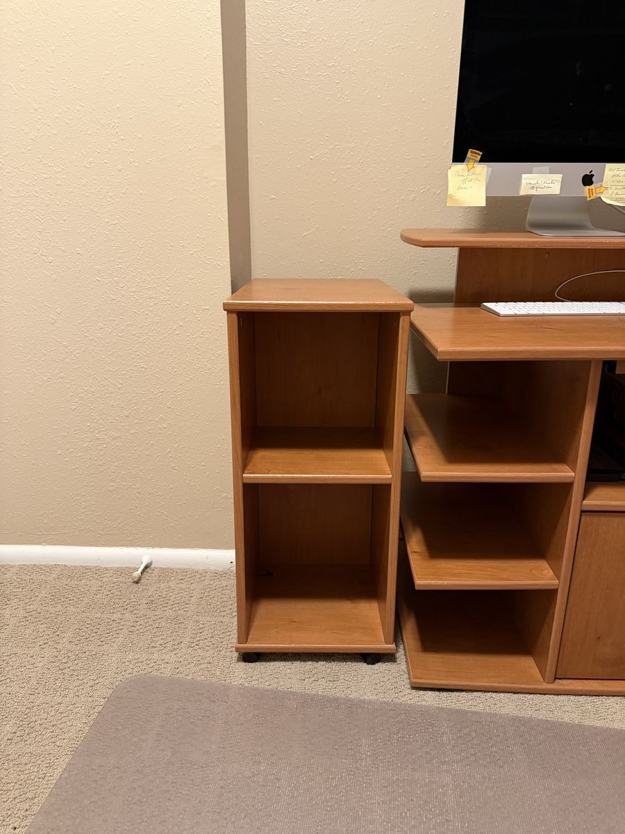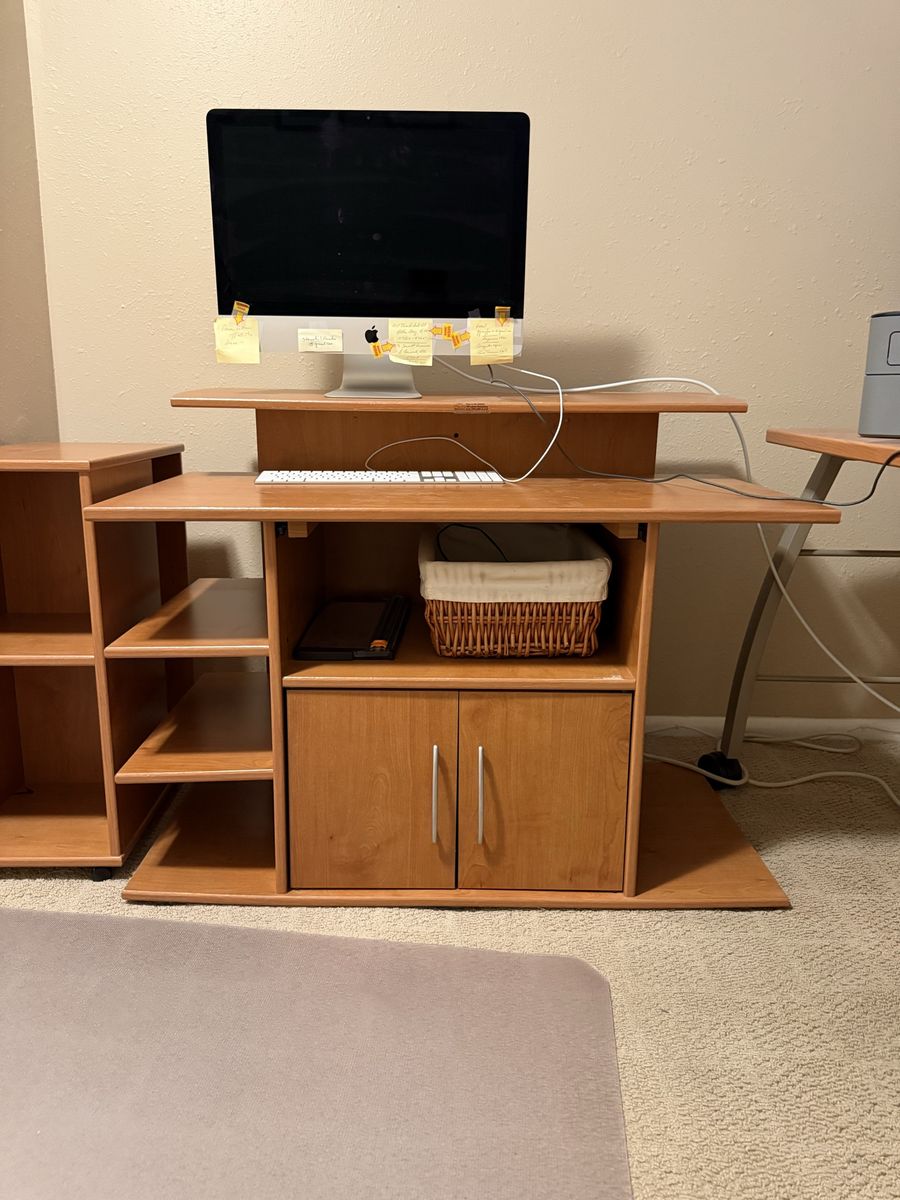 The desk and the side cabinet are on wheels. It is durable and easy to use. Always been kept in a smoke and pet free home. Let me know if interested.