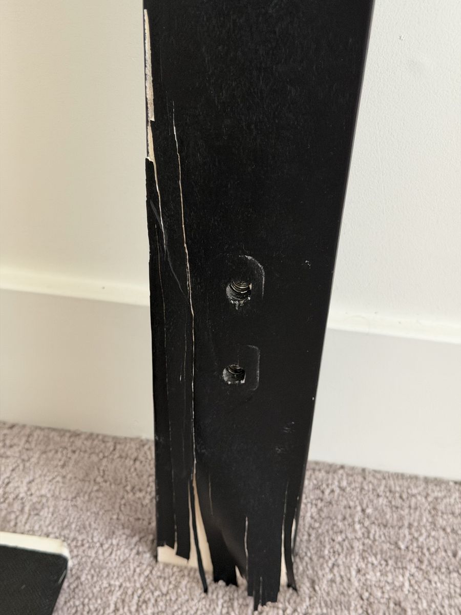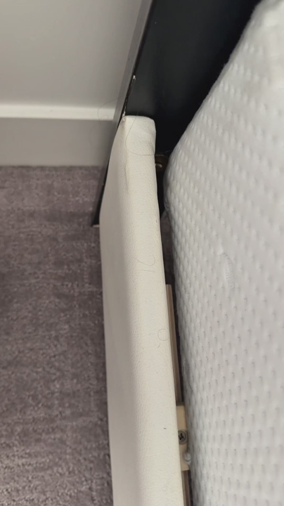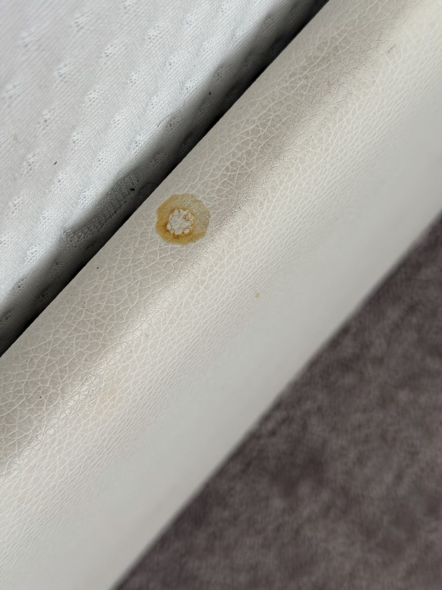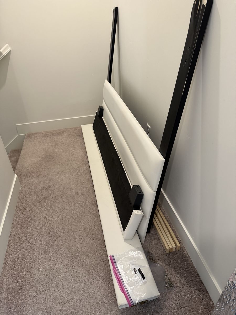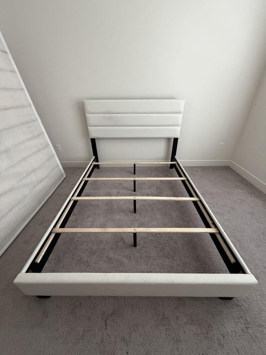 VenmoWhite Upholstered headboard, comes with all the screws in a small bag and disassembled for easy transport, needs a bit of cleaning, has been peeling on a side (see picture). This is only the frame, no mattress and no box spring.