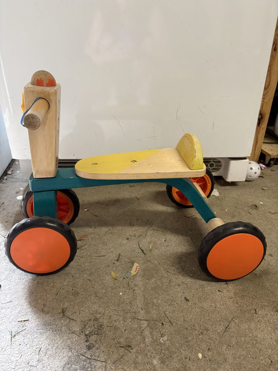 VenmoB. Toys brand wooden toddler bike. This bike is super sturdy and a great beginning before a strider or balance bike.