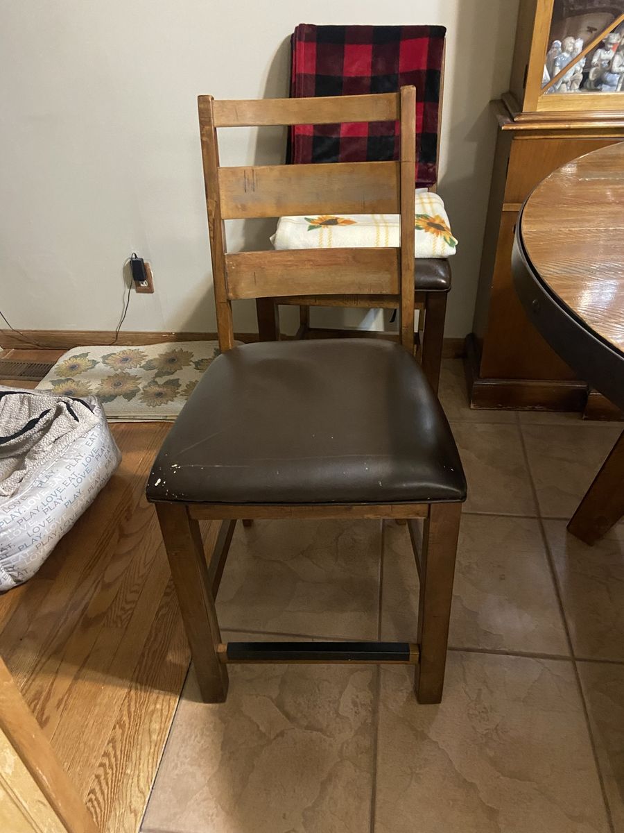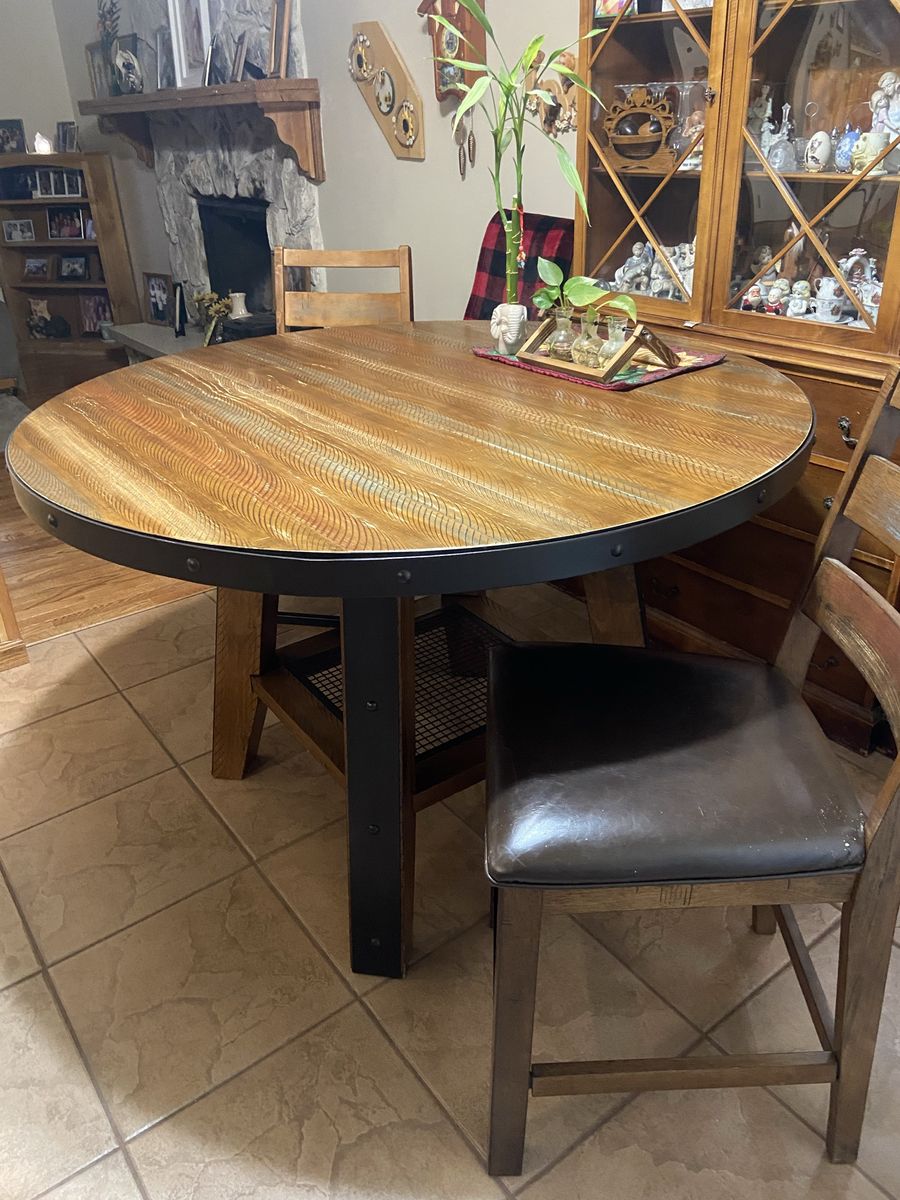 54” diameter 36” tall 8 padded chairs $300 obo This is my mom’s dining table. It’s too tall for her and my dad now. They need to replace it with a shorter one they can actually use. There isn’t anything wrong with it besides general wear and tear from it sitting in their dining area.