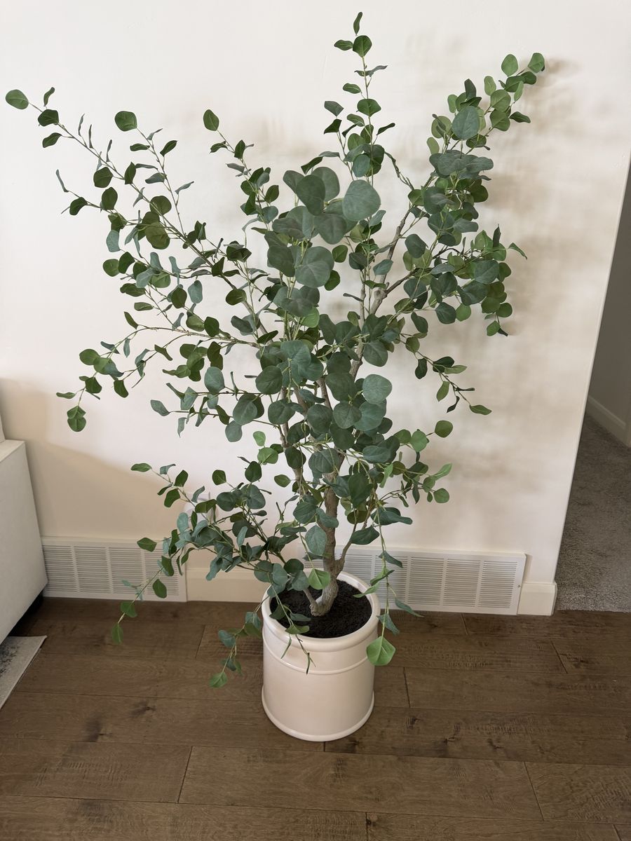 Venmo6’ Artificial Silver Dollar Eucalyptus Tree in Artisan Planter Bring a fresh, airy feel to your home with this stunning Silver Dollar Eucalyptus. Perfectly designed to mimic the "silvery-blue" hues of a real tree, this high-quality faux botanical offers a modern, sophisticated look without the maintenance. Its leggy, architectural branches and signature rounded leaves make it a perfect statement piece for a living room, entryway, or bedroom corner. Product Features: • Realistic Foliage: Dense, coin-shaped leaves with a matte, dusty-green finish for a lifelike appearance. • Customizable Shape: Sturdy, wired branches allow you to "fluff" and bend the tree to fit your specific space—keep it narrow for corners or spread it wide for a fuller look. • Premium Planter: Comes pre-potted in a heavy, cream-colored artisan ceramic-style pot that provides a stable, high-end foundation. • Maintenance-Free: No watering, sunlight, or pruning required. Stays vibrant and full year-round. Specifications: • Height: Approximately 6 feet • Style: Modern Farmhouse / Transitional / Minimalist • Condition: Excellent