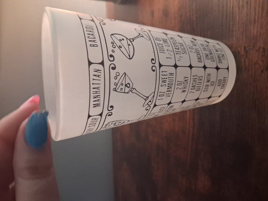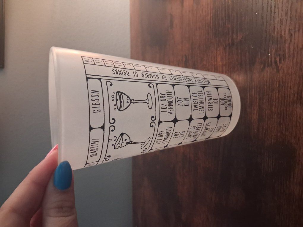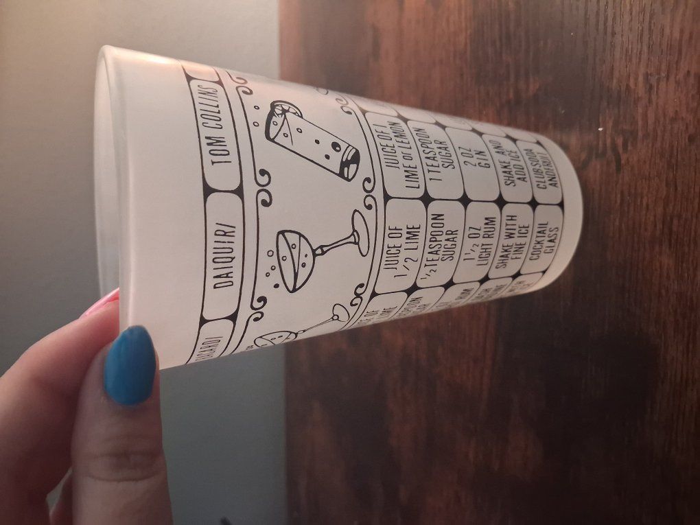 VenmoThis vintage Federal glass features a variety of classic mixed drink recipes such as the Martini, Daiquiri, Gibson, Daiquiri, Bacardi, Manhattan, whisky sour and Tom Collins, printed in bold black and white graphics. The glass provides easy-to-follow instructions, making it perfect for crafting cocktails at home. Though it doesn’t come with a lid, it serves as a functional mixing glass or a decorative addition to your vintage barware collection. Ideal for vintage enthusiasts, home bartenders, or anyone looking to add a retro touch to their bar setup!