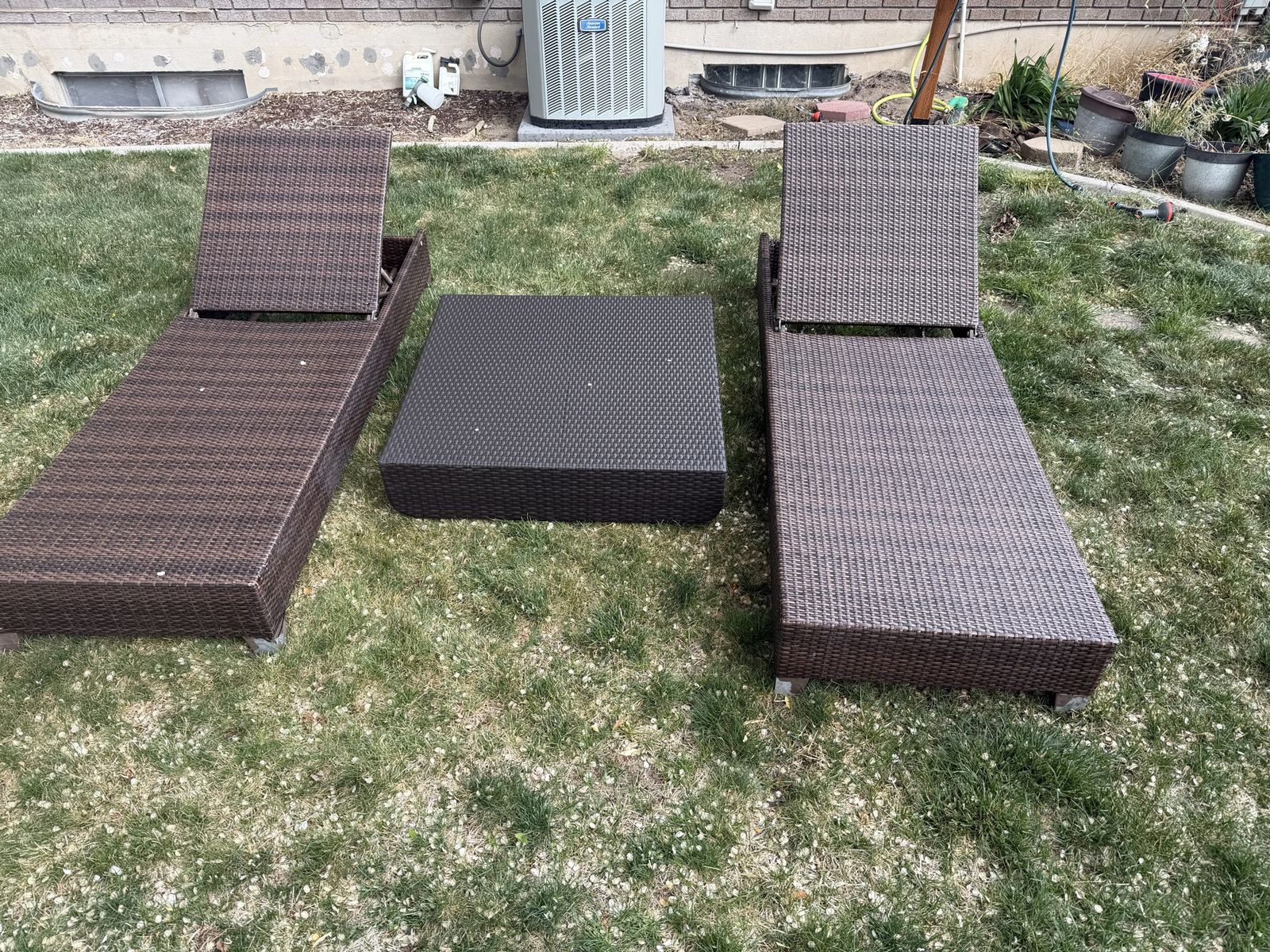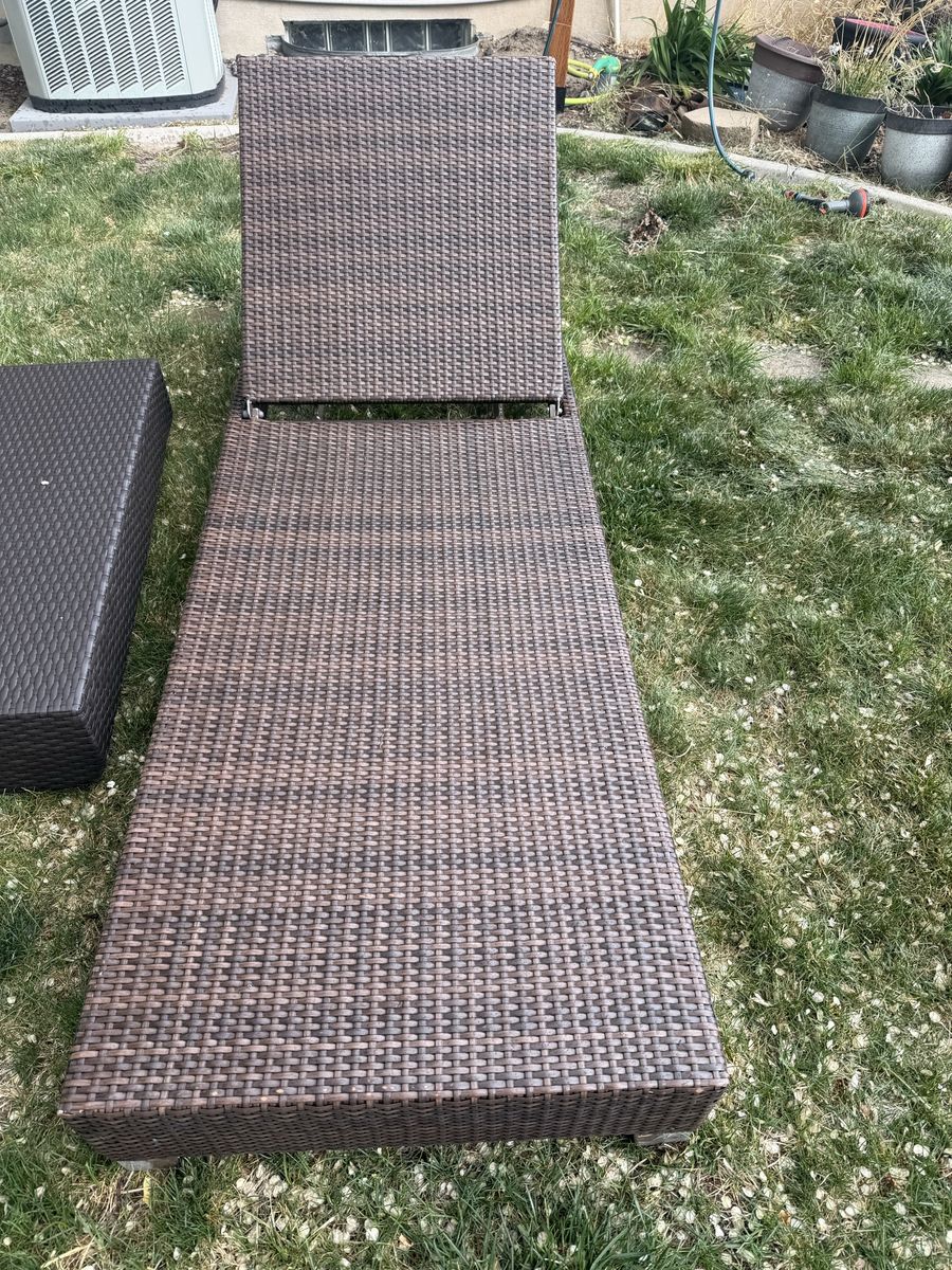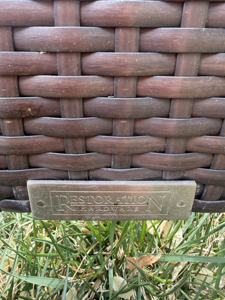 VenmoSet of two Restoration Hardware wicker chaise loungers and side table/ottoman. Loungers approx: 80”W x 28”D x 10”H Table/ottoman approx: 36”W x 36”D x 10”H