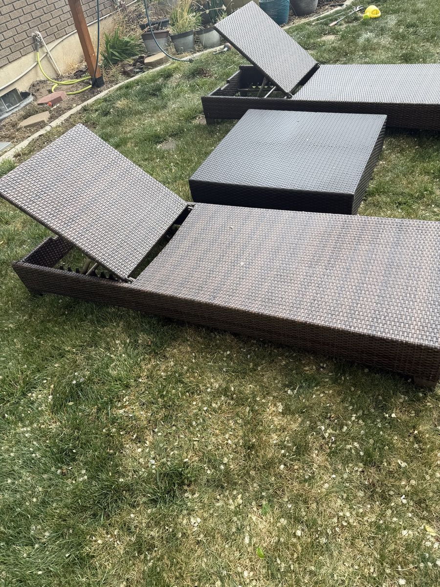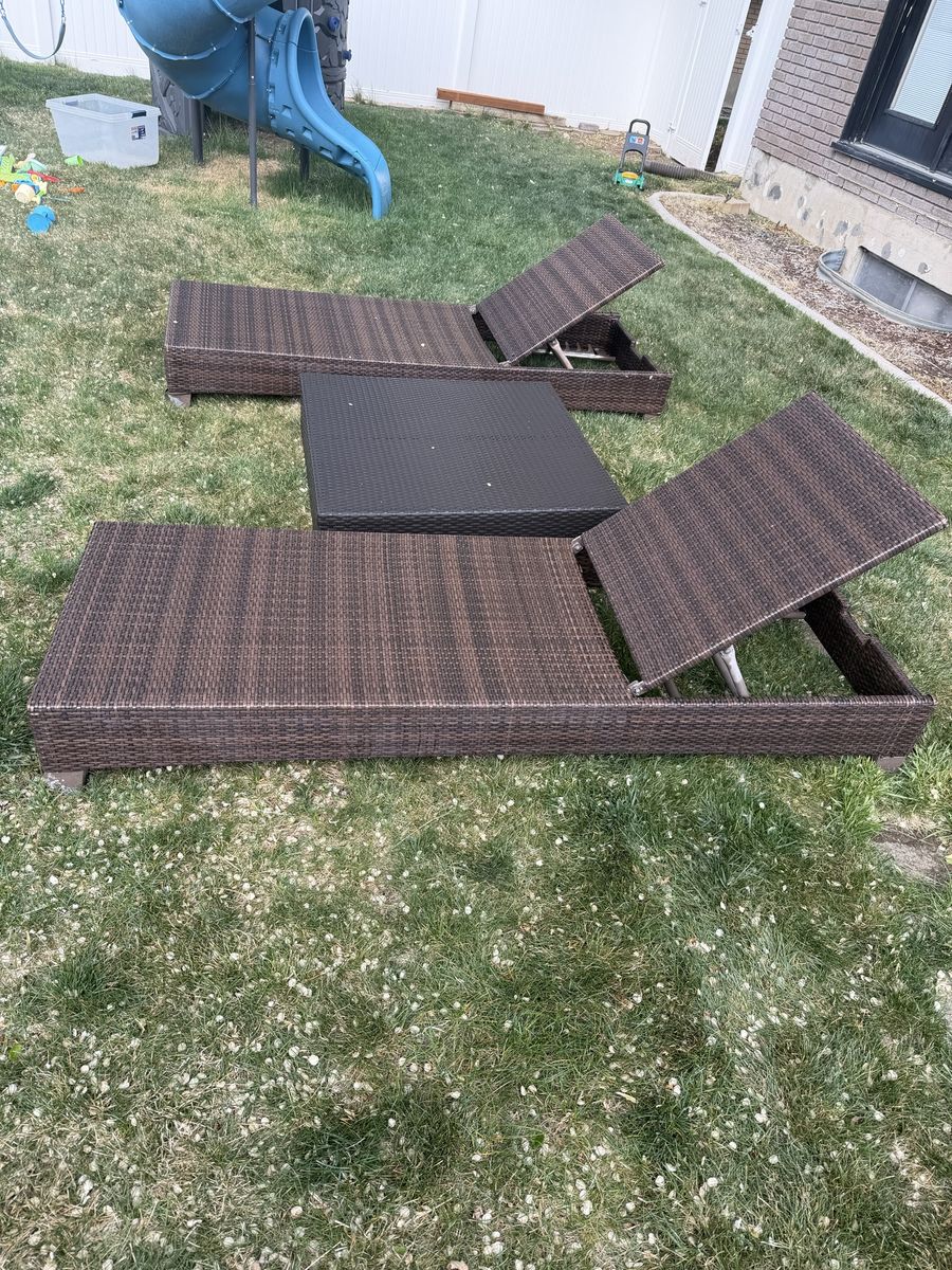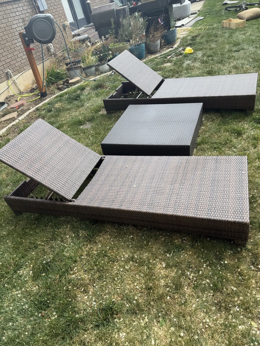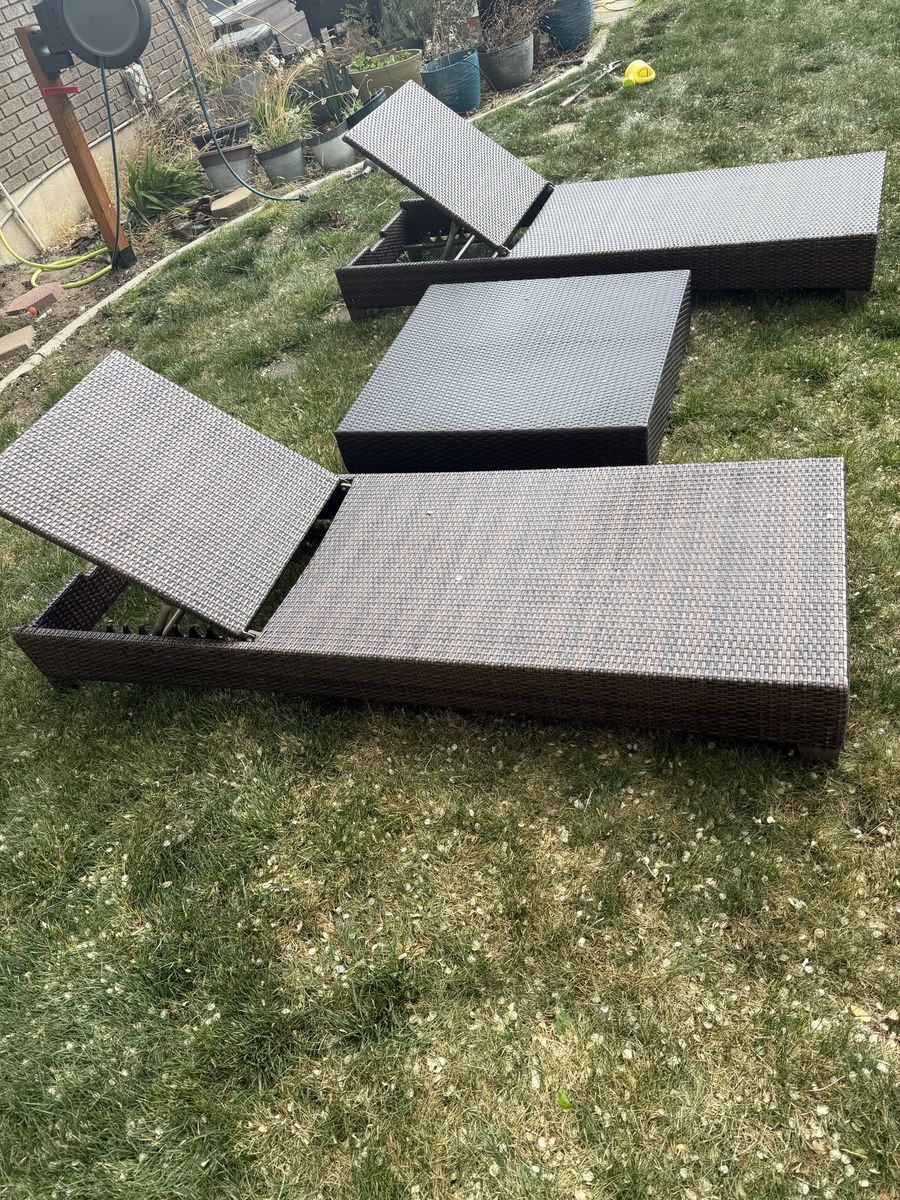 VenmoSet of two Restoration Hardware wicker chaise loungers and side table/ottoman. Loungers approx: 80”W x 28”D x 10”H Table/ottoman approx: 36”W x 36”D x 10”H