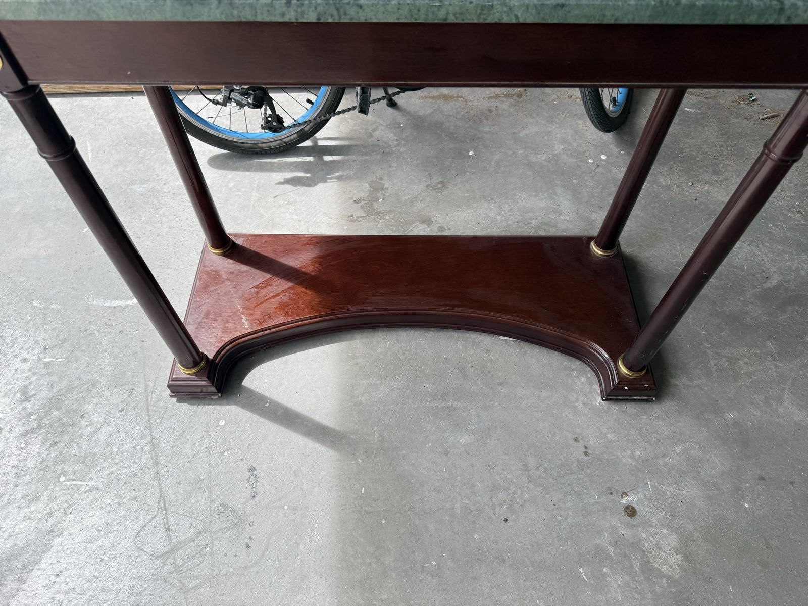 VenmoWood entry table with green marble top and gold accents. 15” deep, 35” wide, 30” high.