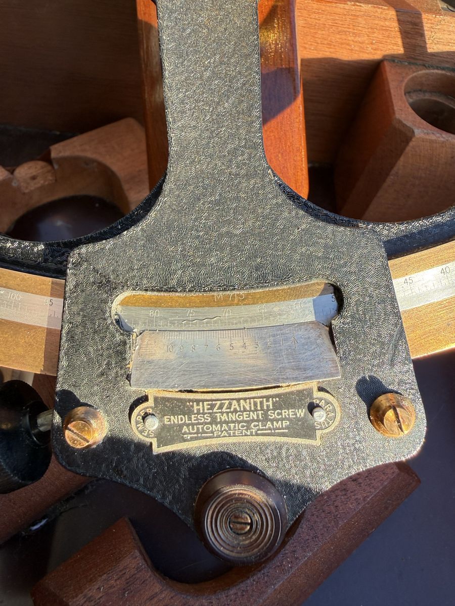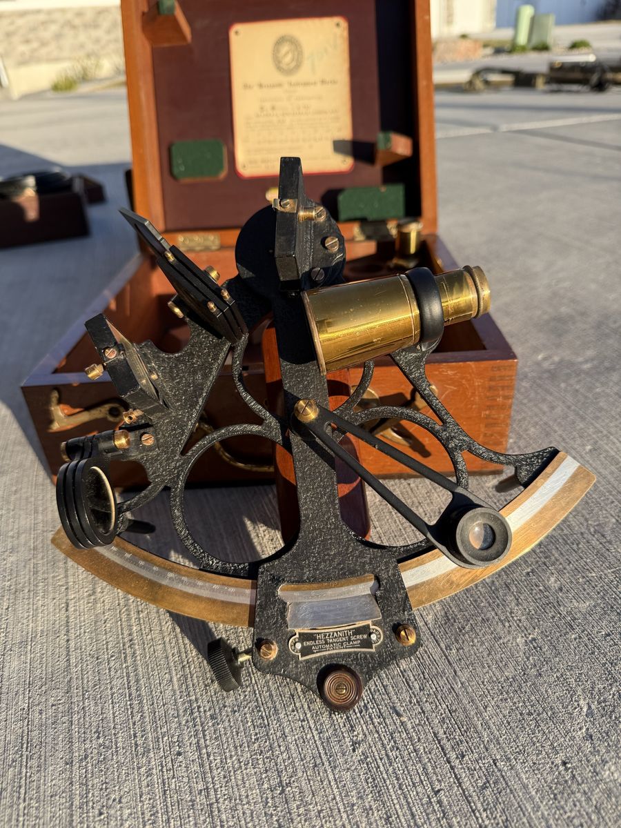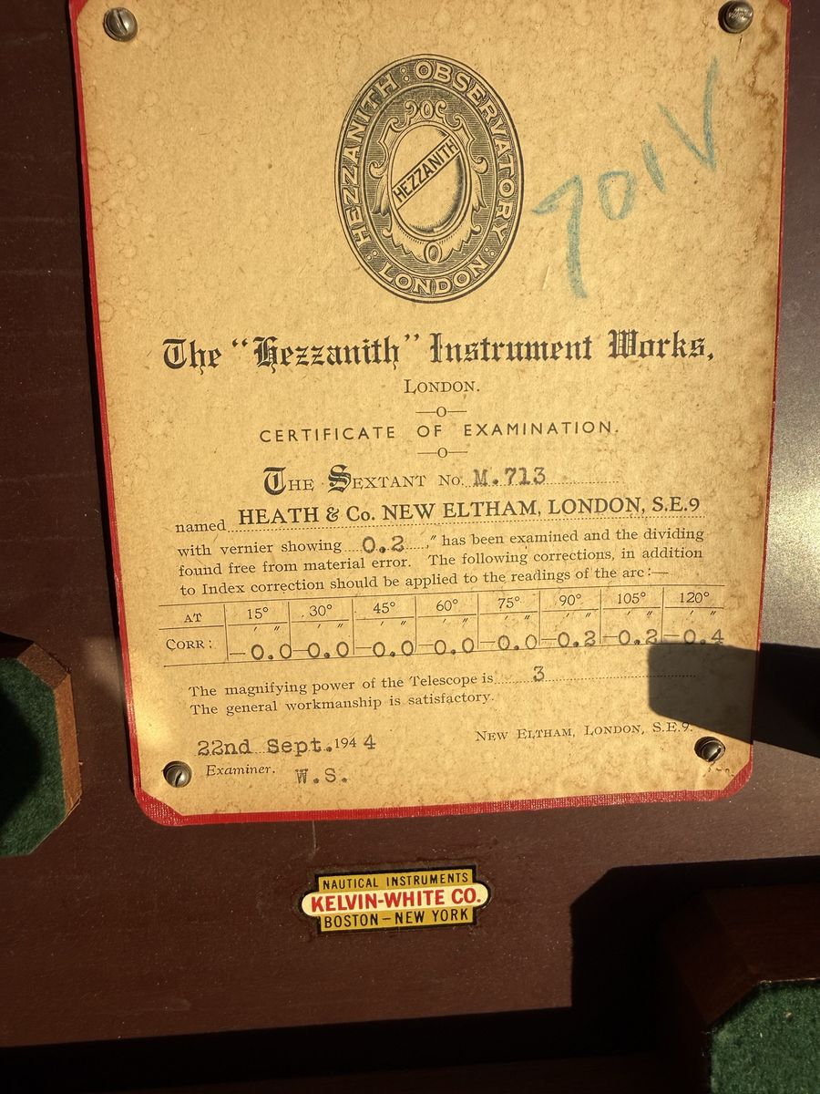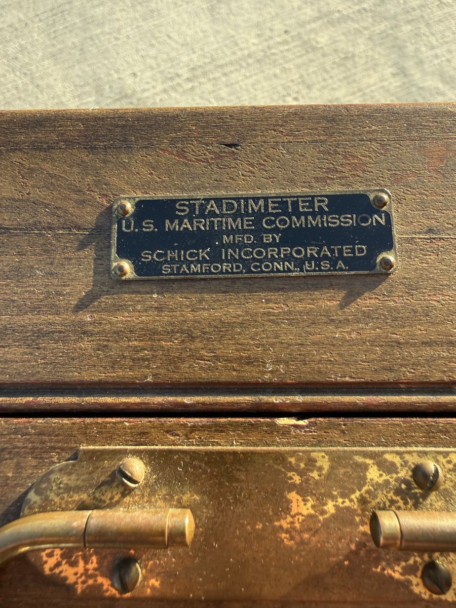Exceptional grouping of original World War II-era maritime navigation instruments, all housed in their original fitted wooden cases. This set includes a 1944 Hezzanith London marine sextant (No. M.713) with original Certificate of Examination, a U.S. Maritime Commission stadimeter manufactured by Schick Inc. (1942), and a gimbaled marine compass in fitted box. Together, these represent the core toolkit of a mid-20th century ship’s navigator prior to the adoption of radar and electronic navigation.