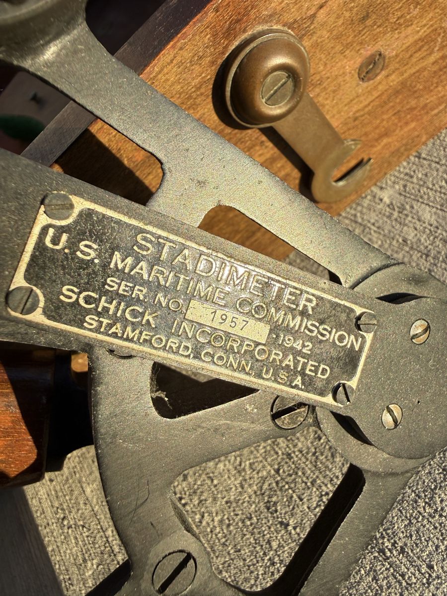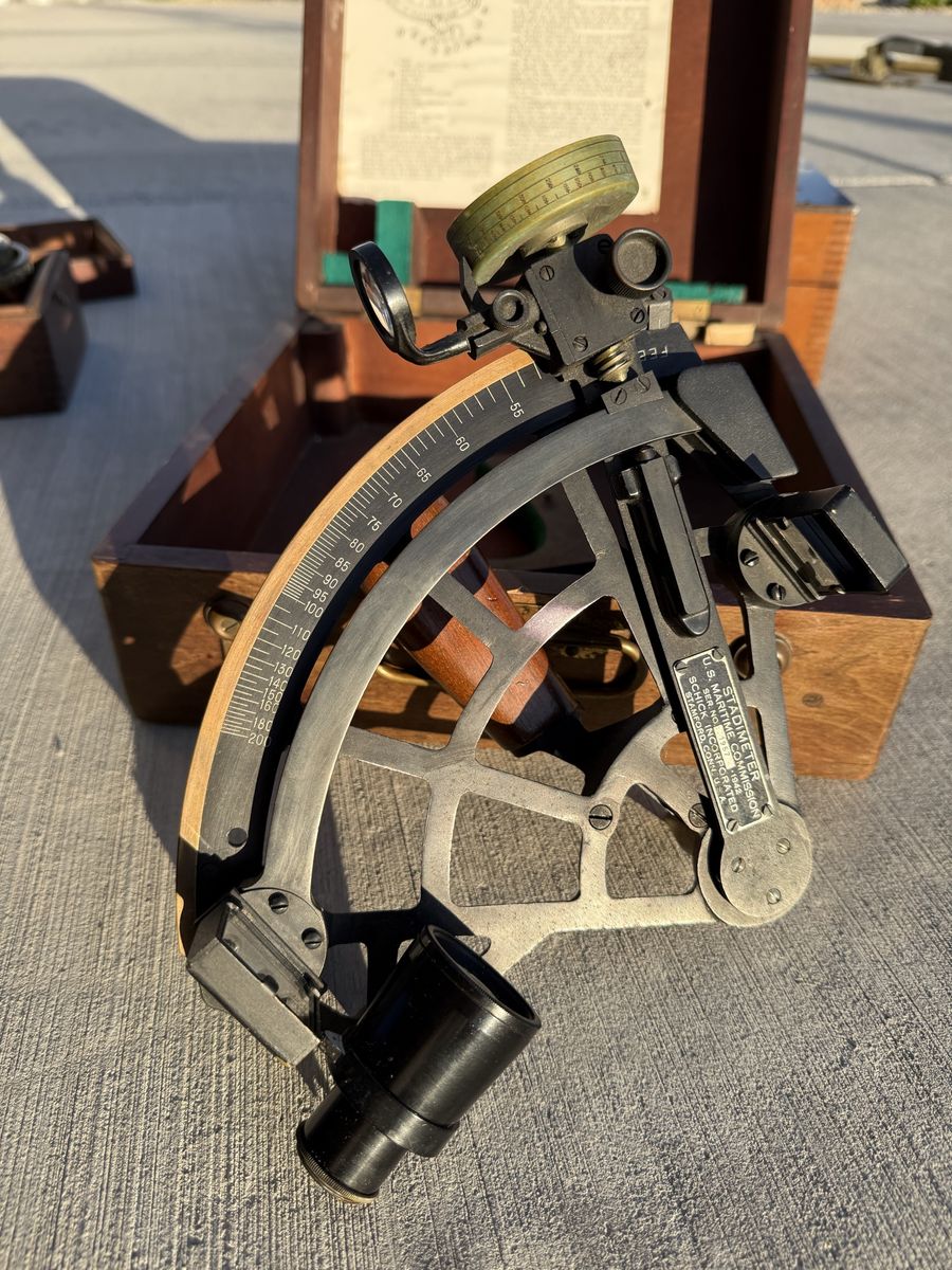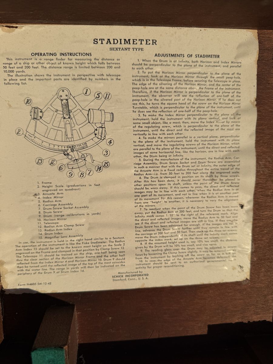 The sextant retains its original inspection certificate, optics, and fittings, with clean arc graduations and well-preserved components. The stadimeter is clearly marked with U.S. Maritime Commission provenance and serial number, and includes its original instruction sheet inside the lid. The compass features a classic floating card and gimbal mount, designed for stability at sea. All three pieces show honest age while remaining highly presentable, making this a rare and cohesive display set.