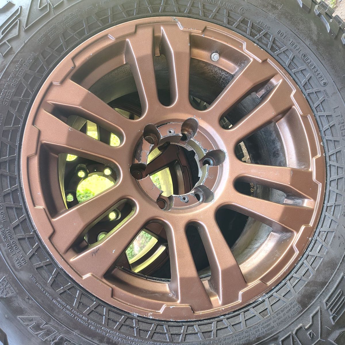 Venmo4 wheels and tires at 7-11/32nds uneven wear some cupping. Dot 2021 and 2022. 3 center caps included no lug nuts. Have Toyota tpms sensors but not sure if they work. Will fit many other 6 lug vehicles with 6x5.5 and 6x139.7 lug pattern. First come First serve.