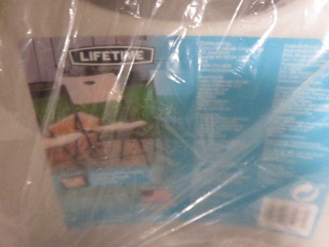 As the pictures show, these two Lifetime chairs are absolutely brand new and still wrapped in their clear plastic covers with their original labeling inside.