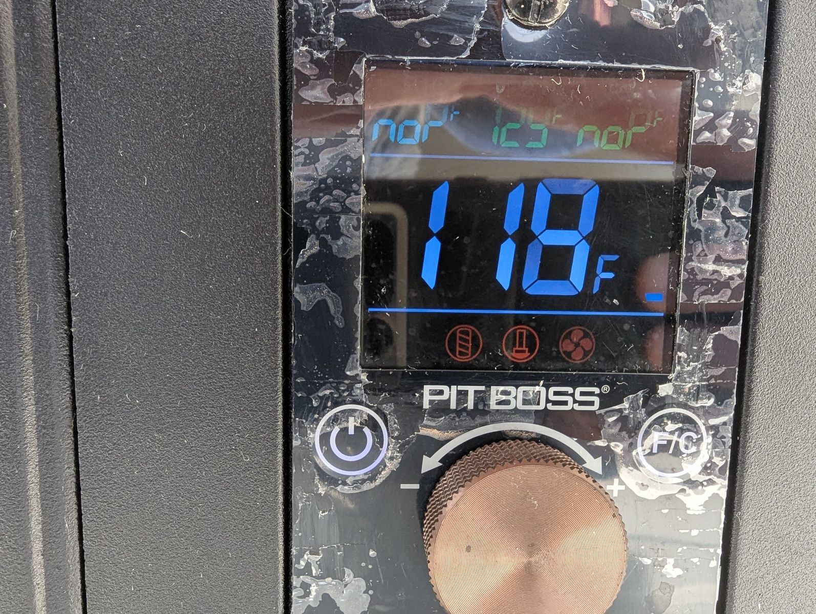 Good condition. The unit is missing four of the original five smoking racks. There is deteriorating protective film on the digital control board display.