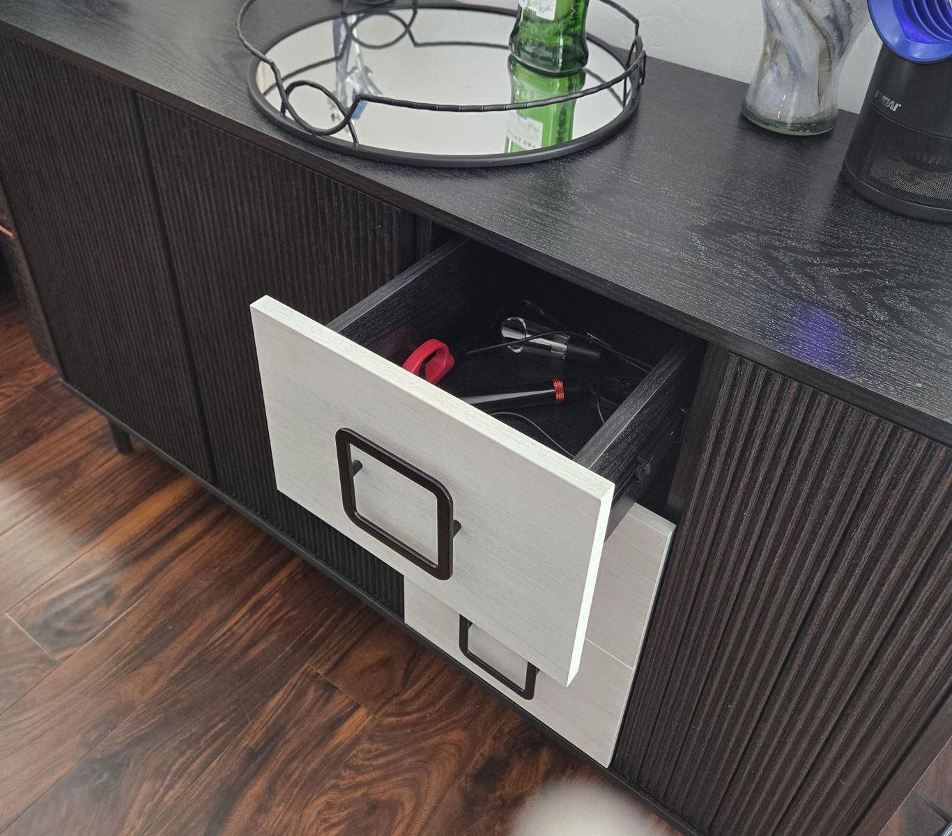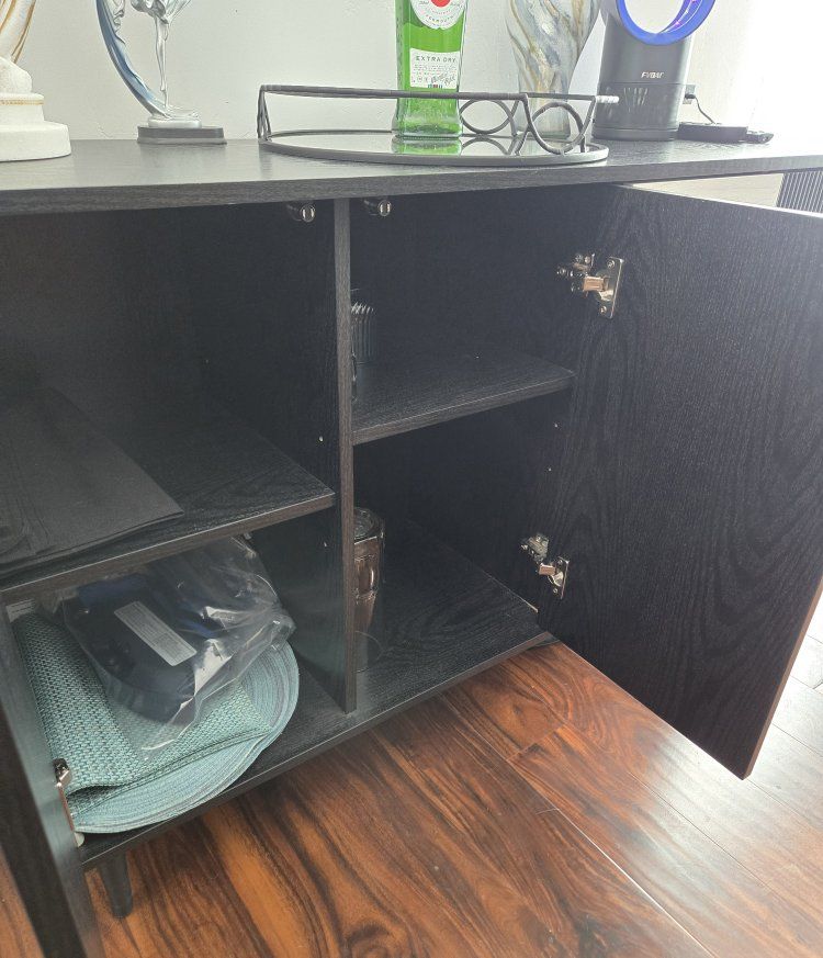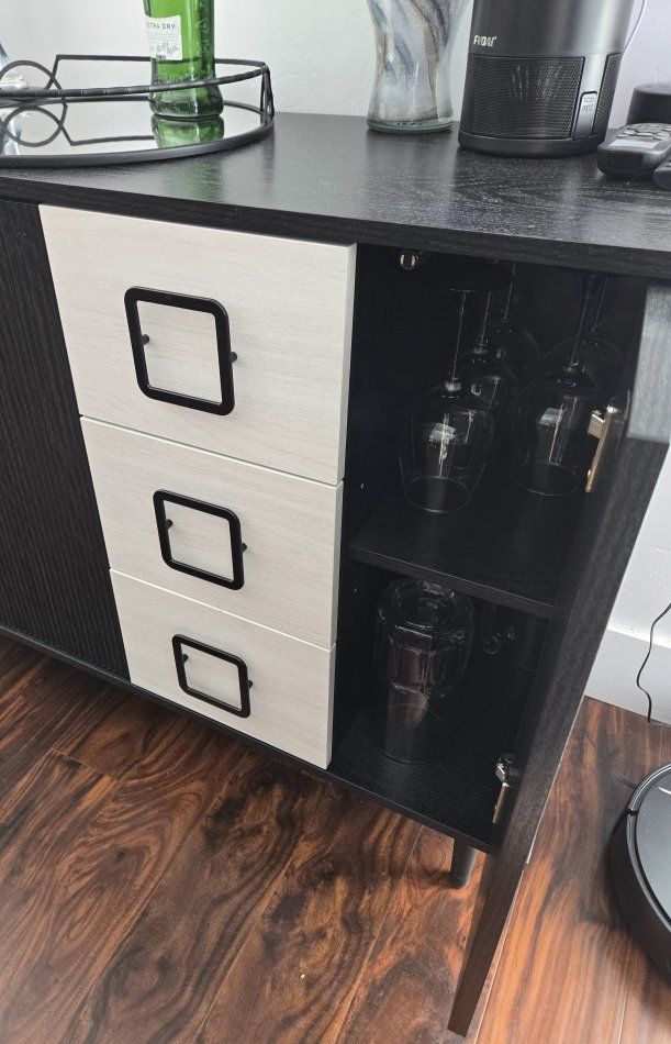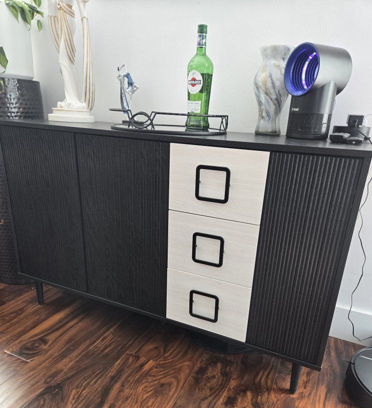 VenmoStylish black and white sideboard. Has cool fluted doors and three light wood drawers. Two cabinets with shelves and one side has perfect shelves for wine glasses. Great for storage or as a bar. 48" x 15.75" x 30"
