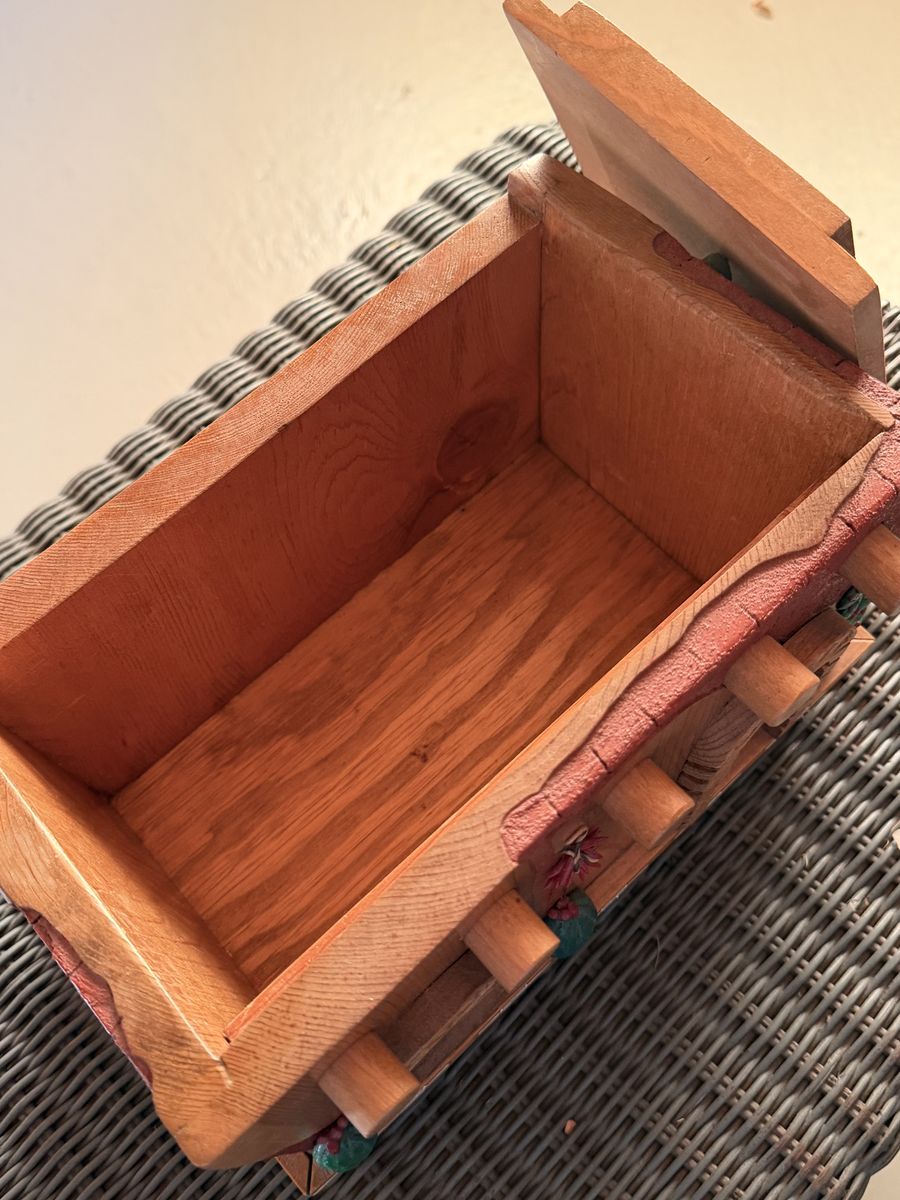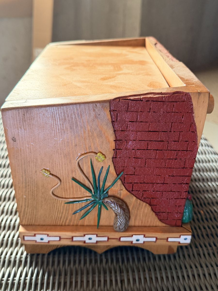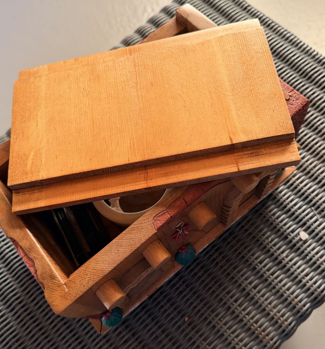 Crafted from wood with carved details and colorful accents. The top lifts off to reveal an open storage area. Can be used for small plants, as keepsake boxes, or as miniature village collectibles.