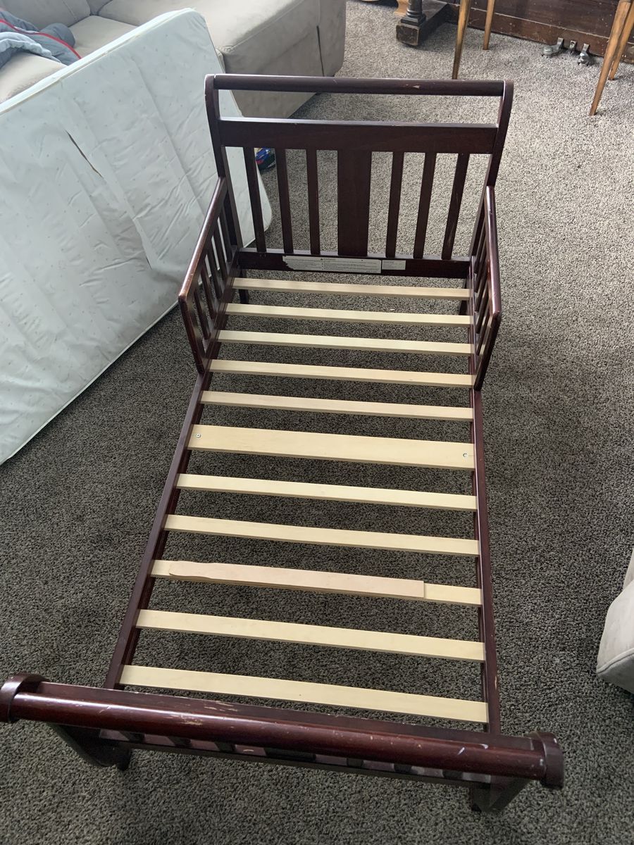 Good toddler bed, just outgrew it. One of the slats is cracked (just realized that after removing the mattress). Can be easily splinted and glued as has been done on one of the other slats.