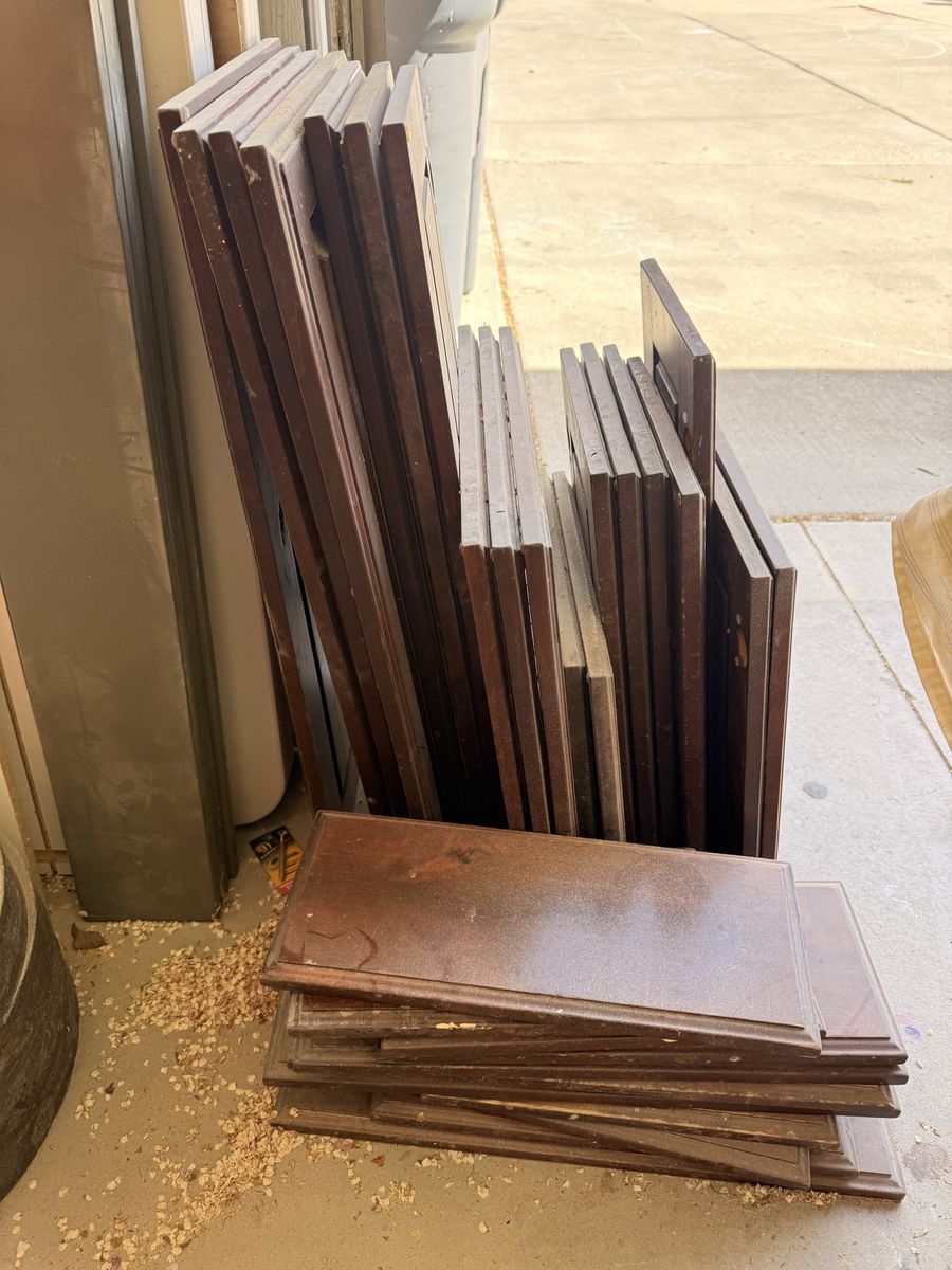 Naughty Alder, solid wood, cherry stained cabinet doors and drawer fronts. Various sizes. All in great condition. Can need to be re-stained or painted to match colors. Located in MAPLETON. First come first serve and no holds please. 19 cabinet doors and 11 drawer fronts. FREE.