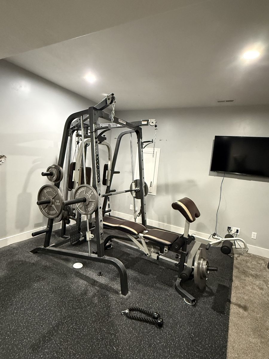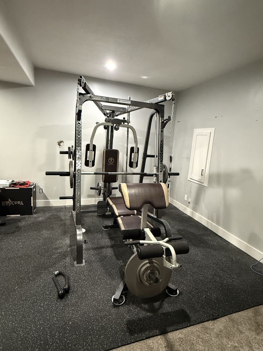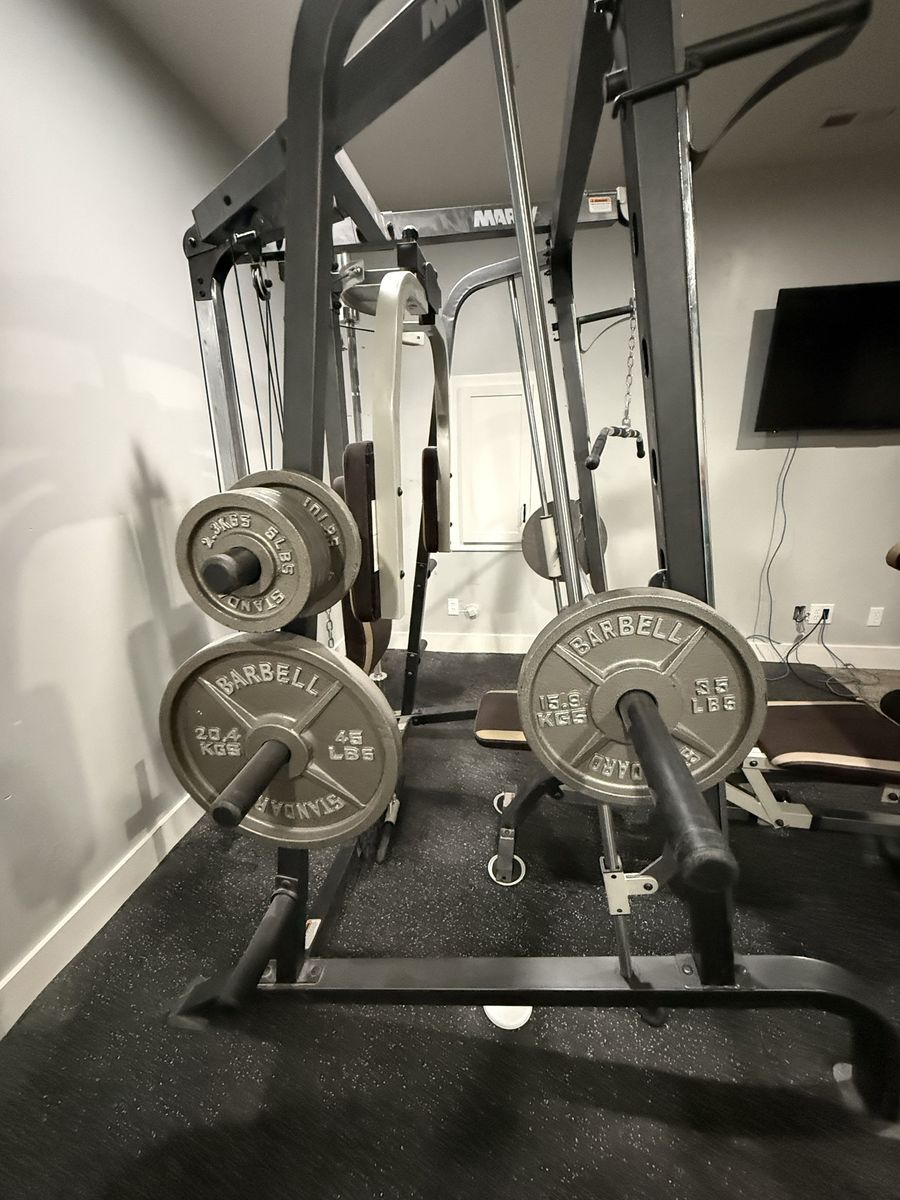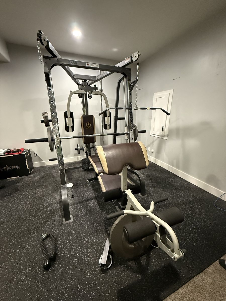 Only a couple years old, and rarely used. Marcy Diamond Elite workout tower (retails at $1300). Plus we have purchased all the weights to go with it, one Olympic bar, and the floor mats. Two 45 lb weights Two 35 lb weights Two 25 lb weights Two 10 lb weights Four 5 lb weights Two 2.5 weights Cash or Venmo only. Pick up in Riverton, but must bring people to help dismantle and carry weights upstairs. My husband will help.