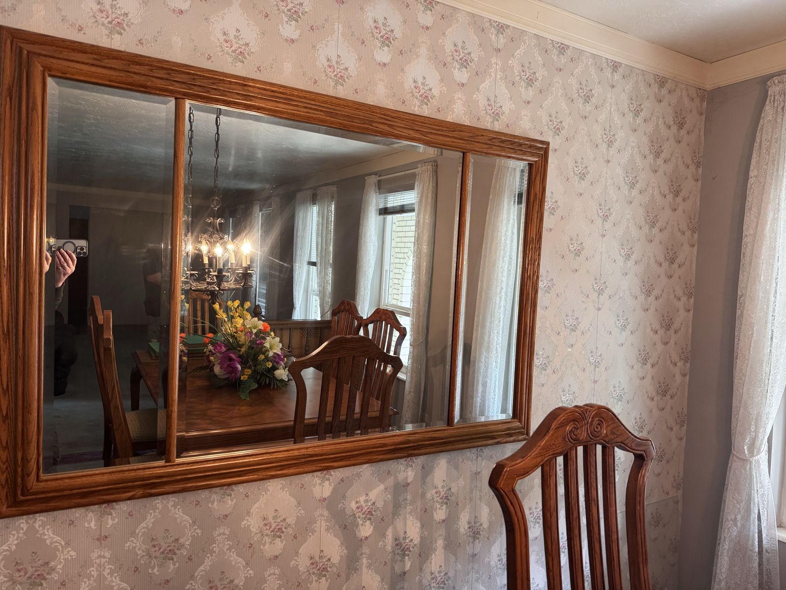 VenmoTri Panel Mirror 39 in high x 52 in long. Oak frame matches dining room table in photo. (Also posted). Pick up in Sandy.