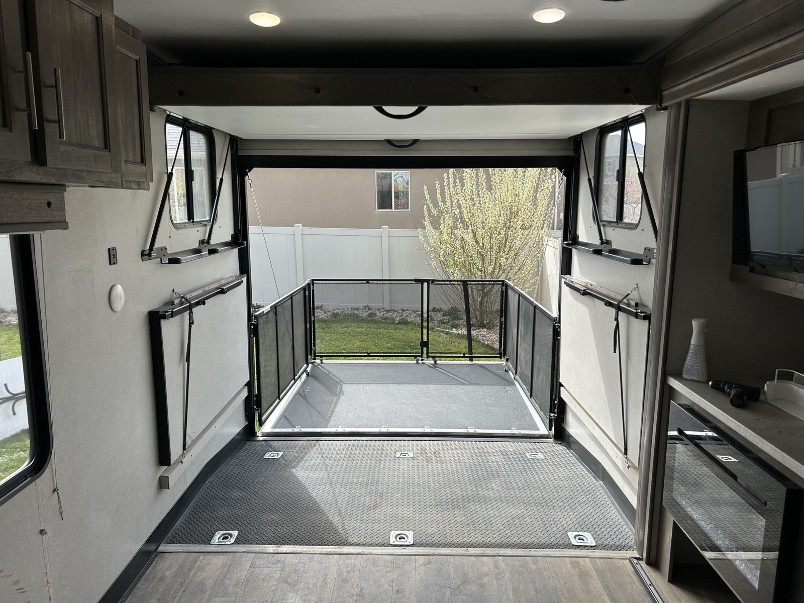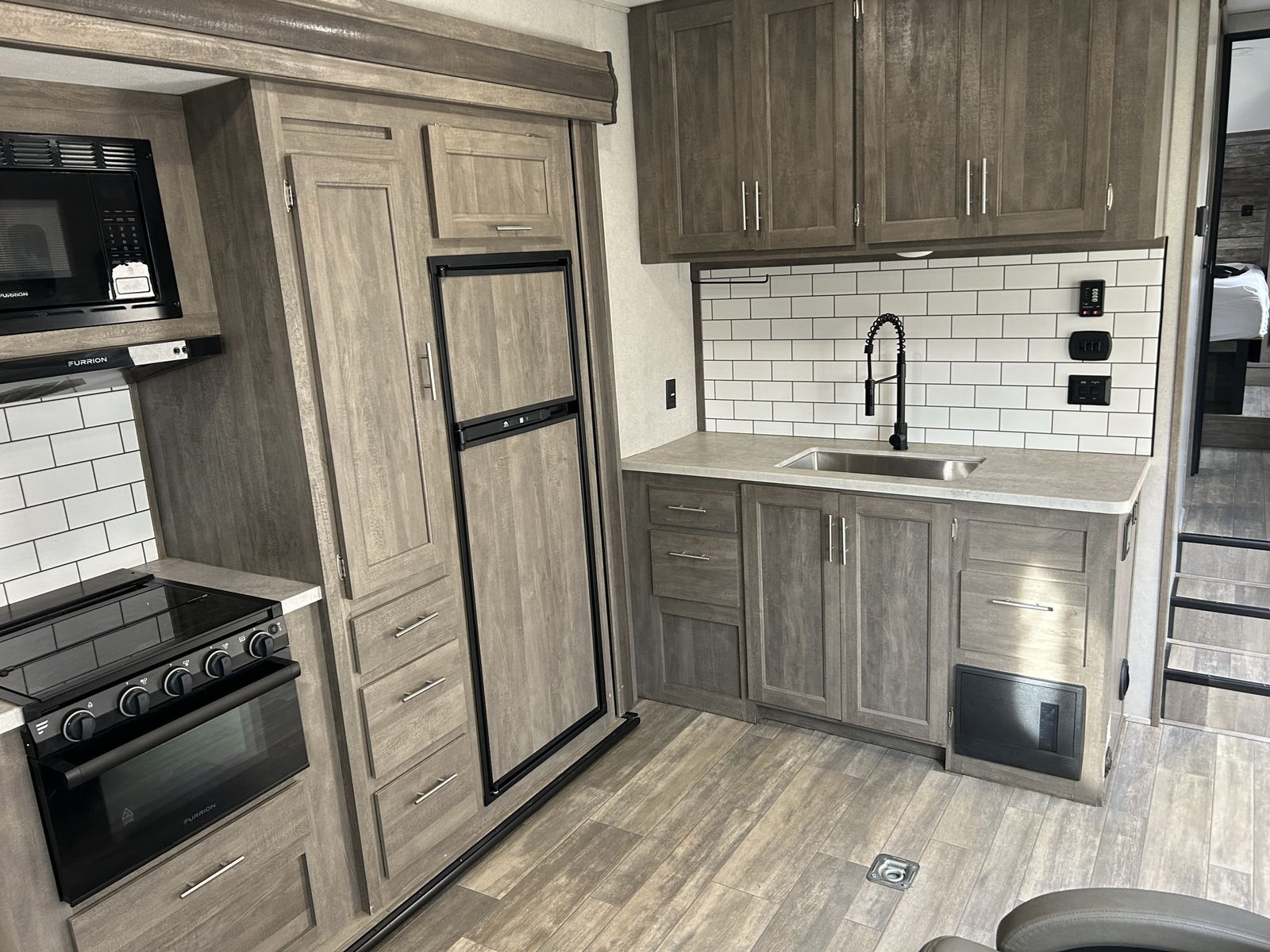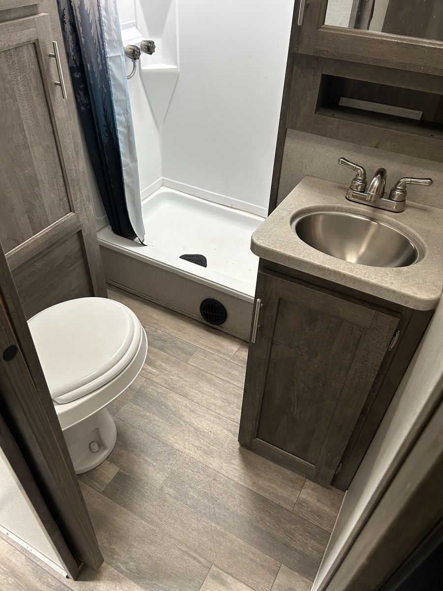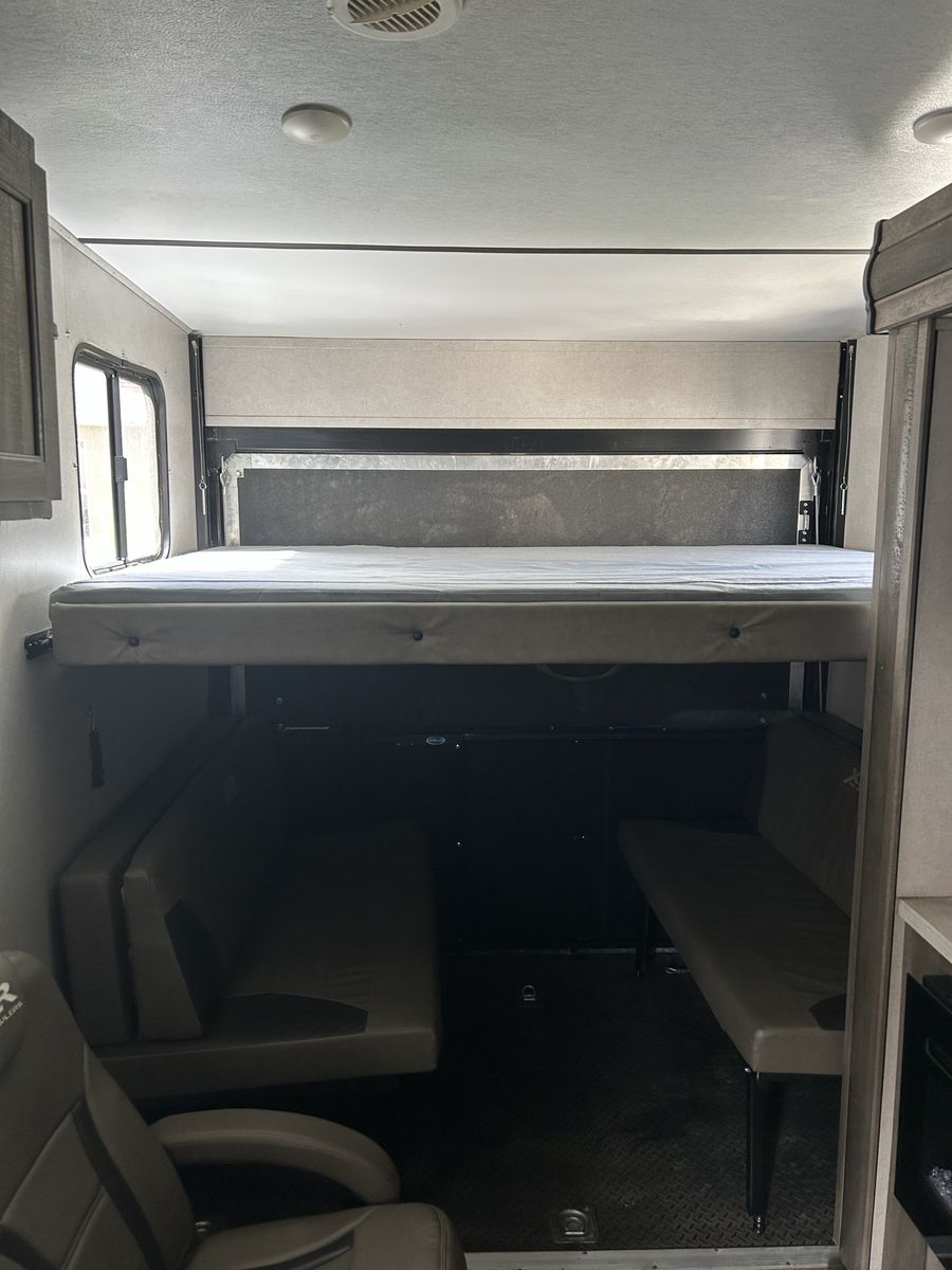 Features EXTERIOR 13.5K Main A/C w/ Ducted Roof Vents Friction Hinge Main Entry Door w/ Large Grab Handle Smooth Metal Front Color Metal Bands On Sidewall Body Armor Enclosed & Insulated Underbelly Heated Underbelly Enclosed Holding Tanks Extra Large 1 1/2" Fresh Water Drain Valve Seamless PVC Roof System Premium Electric Coated or Powder Coated Frames Digital TV Antenna Marine Grade External Speakers Moisture Barrier Floor Enclosure Pet Leash 15’ Power Awning w/ LED Lighting 5" Radius Wood Framed Roof Laminated Aluminum Framed Weather Proof Ramp Door Insulated Storage Doors Oversized Tank Capacities Battery Disconnect Switch High Capacity Water Pump 20# LP Bottles (2) w/ Cover Radius Safety Glass Windows Full Sized Spare Tire Black Tank Flush Back Up Camera Prep Roof Solar 200 watt with controller Rear LED Strip Lighting Over Door Black Steel Wheels w/ brand new good year endurance Tires 5,000 lb. D-Rings RVQ Quick Connect LP No Wheel Wells Diamond Plate Front Rock Guard 50AMP Service Detachable Marine Grade Power Cord Upgraded Main Entry Step Walk on Roof Oil and Gas Resistant Residential Linoleum Power Tongue Jack or Landing Gear