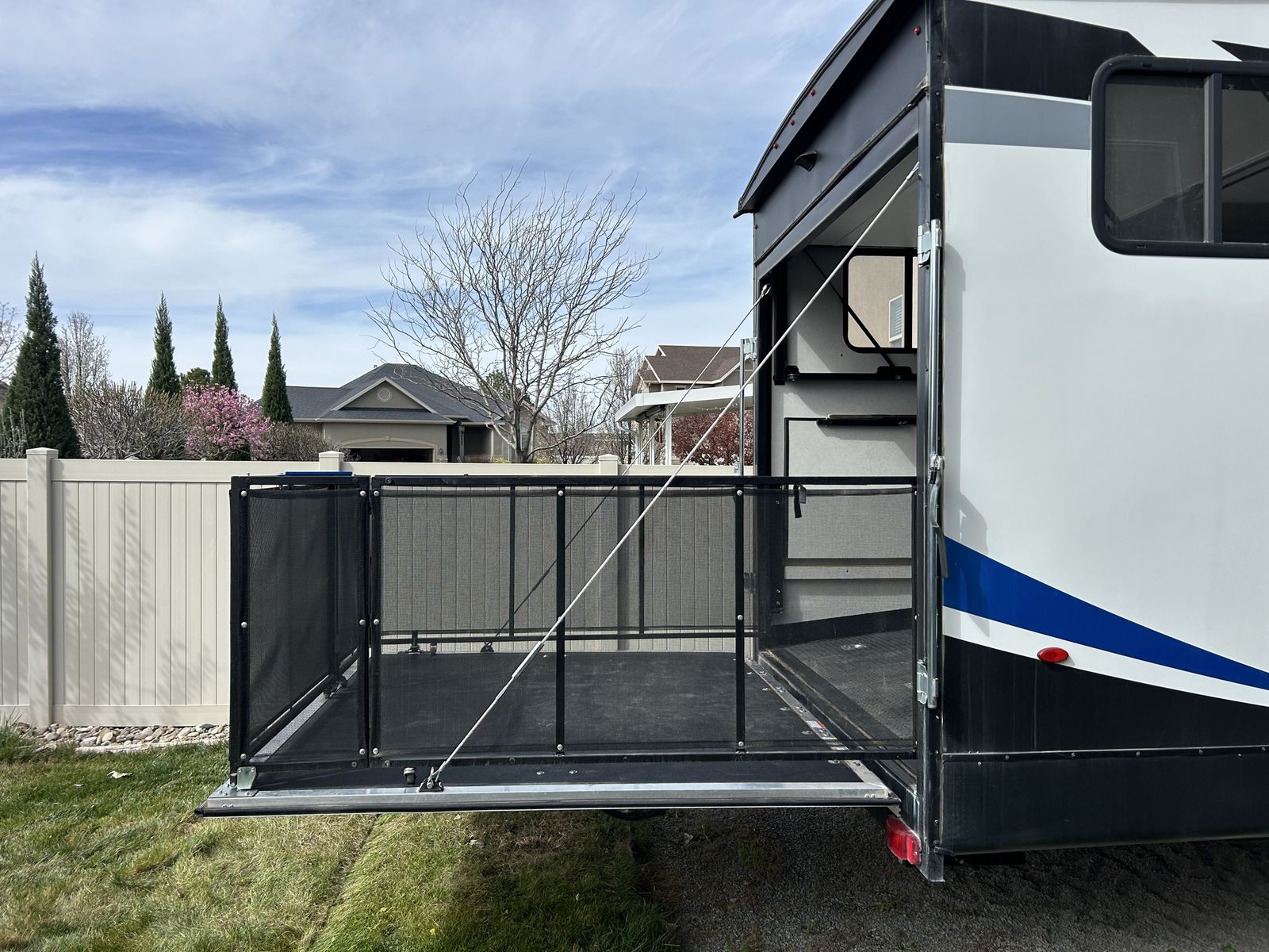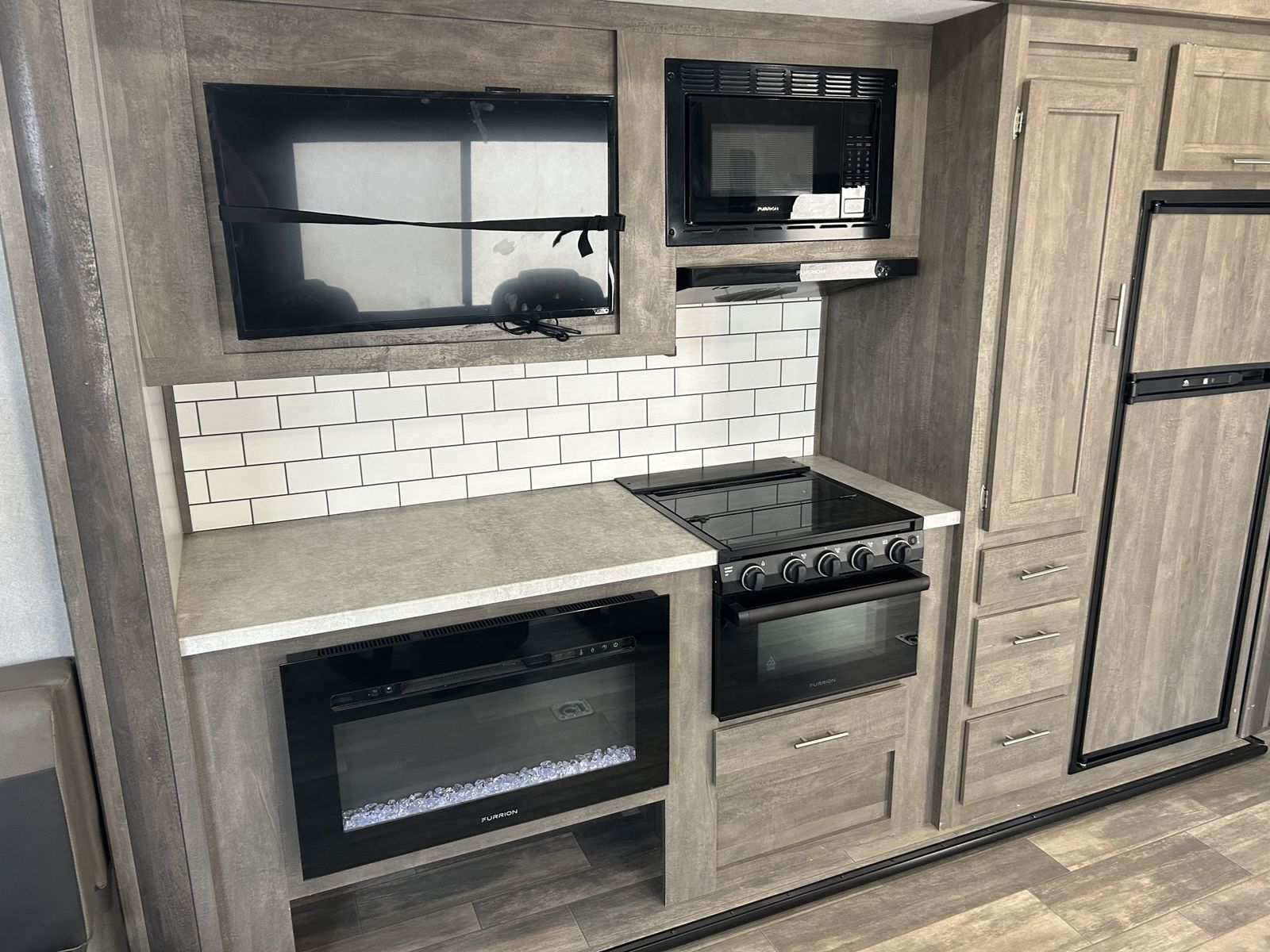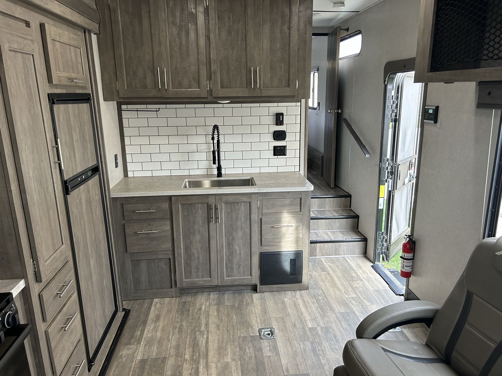 Features EXTERIOR 13.5K Main A/C w/ Ducted Roof Vents Friction Hinge Main Entry Door w/ Large Grab Handle Smooth Metal Front Color Metal Bands On Sidewall Body Armor Enclosed & Insulated Underbelly Heated Underbelly Enclosed Holding Tanks Extra Large 1 1/2" Fresh Water Drain Valve Seamless PVC Roof System Premium Electric Coated or Powder Coated Frames Digital TV Antenna Marine Grade External Speakers Moisture Barrier Floor Enclosure Pet Leash 15’ Power Awning w/ LED Lighting 5" Radius Wood Framed Roof Laminated Aluminum Framed Weather Proof Ramp Door Insulated Storage Doors Oversized Tank Capacities Battery Disconnect Switch High Capacity Water Pump 20# LP Bottles (2) w/ Cover Radius Safety Glass Windows Full Sized Spare Tire Black Tank Flush Back Up Camera Prep Roof Solar 200 watt with controller Rear LED Strip Lighting Over Door Black Steel Wheels w/ brand new good year endurance Tires 5,000 lb. D-Rings RVQ Quick Connect LP No Wheel Wells Diamond Plate Front Rock Guard 50AMP Service Detachable Marine Grade Power Cord Upgraded Main Entry Step Walk on Roof Oil and Gas Resistant Residential Linoleum Power Tongue Jack or Landing Gear