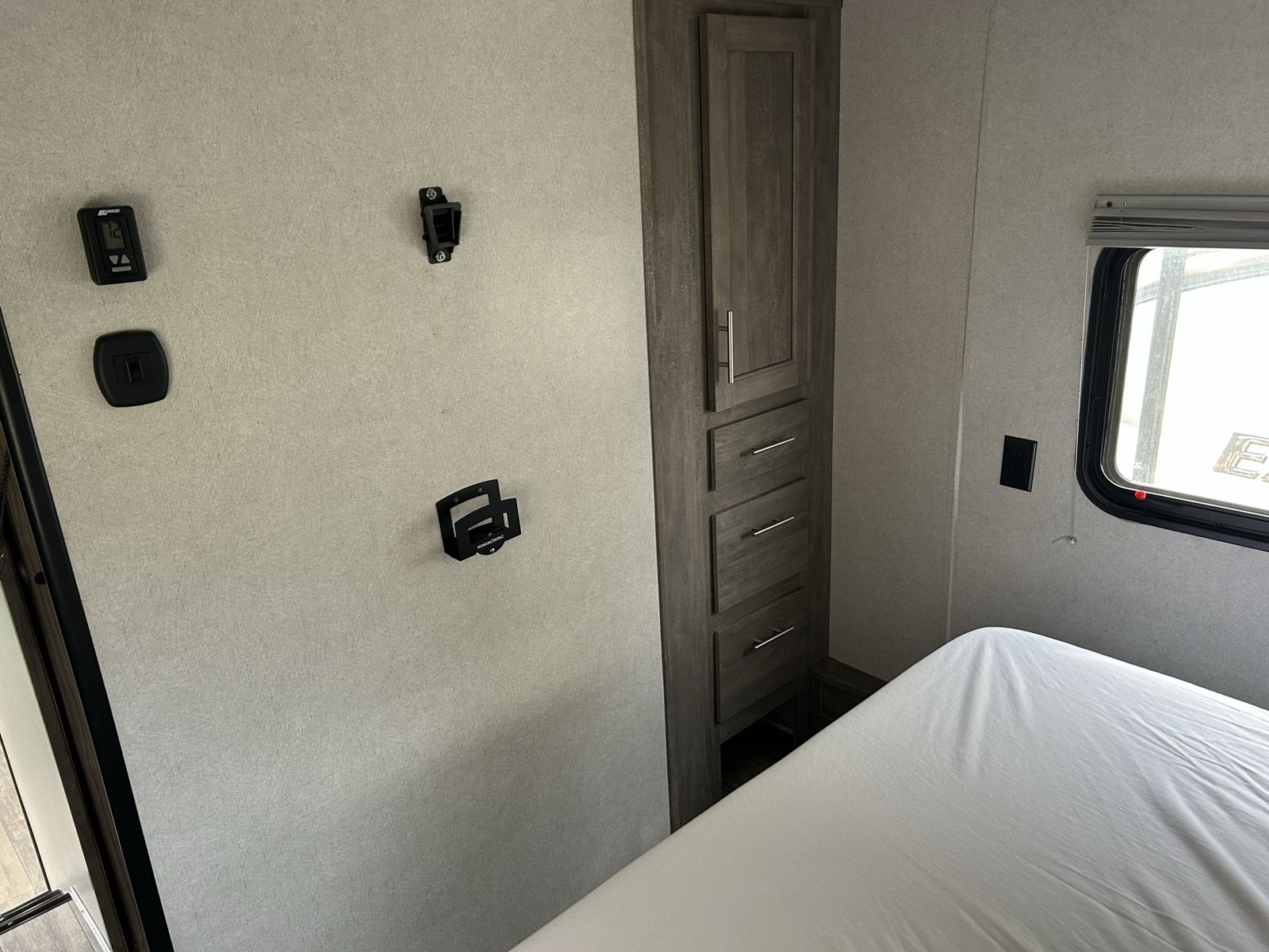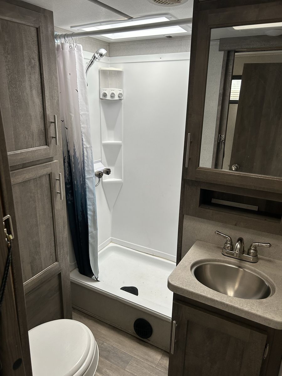 INTERIOR Dual Zone / HDMI / BT / 2 Zone / APP 2 Interior Speakers 17" Black Oven w/ Glass Cooktop LED Lighting .9 Black Microwave Propane and 12VDC Refrigerator/freezer 20,000 BTU Forced Air Ducted Furnace Deep Seated Stainless Steel Kitchen Sink Oval Residential Stainless Steel Lavy Sink Residential Seamless Countertops Ball Bearing Extension Drawer Guides Pre-drilled and Screwed Cabinetry Solid Core Cabinet LED Interior Lighting Quick Recovery Water Heater Skylight Over Shower Power Vent Fan Medicine Cabinet With Mirror Foot Flush Toilet Residential Walk In Showers Night Stands / Bedside Shelves USB Chargers Master Suite RV Queen Bed Outside TV Brackets Sat and Cable Prep Magnetic Screen Wall Large Panoramic Windows Upgraded Residential Furniture Residential Decorative Sheet Solid Interior Passage Doors