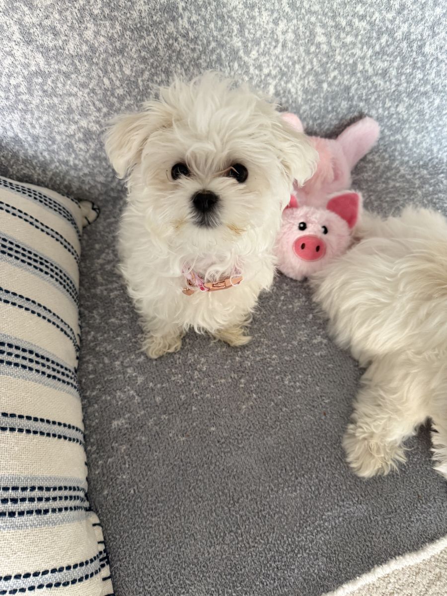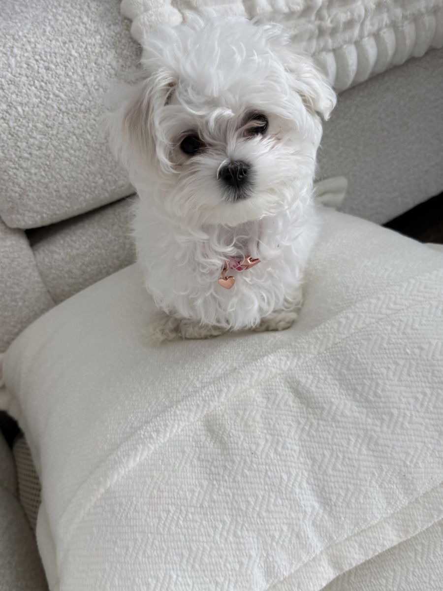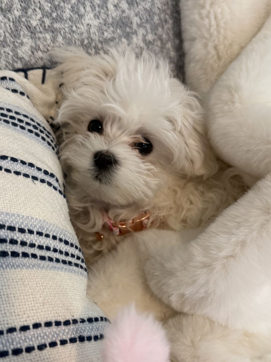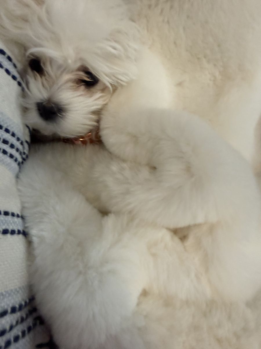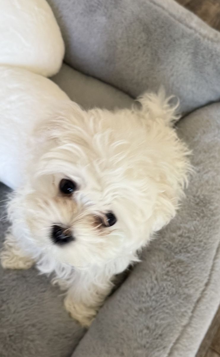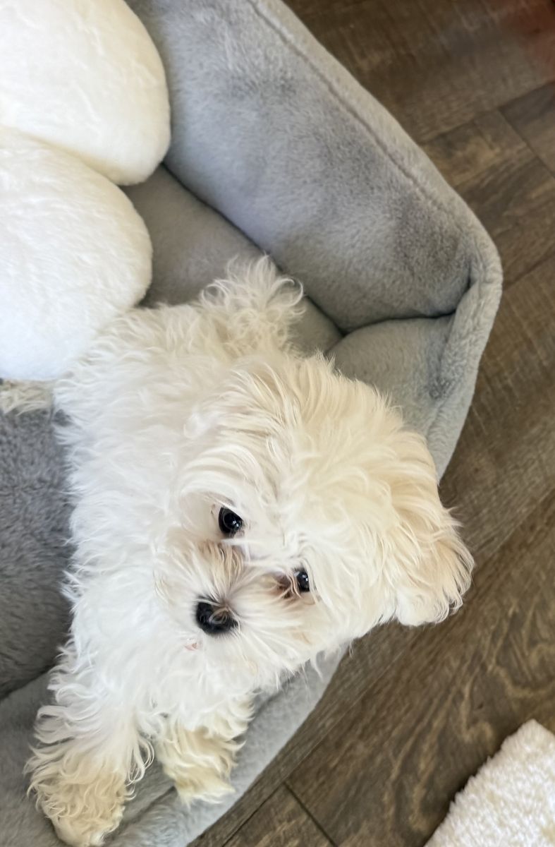 She’s a Maltipoo (approximately 3/4 Maltese, 1/4 Poodle) and is expected to stay very small — around 4 lbs when she’s fully grown.