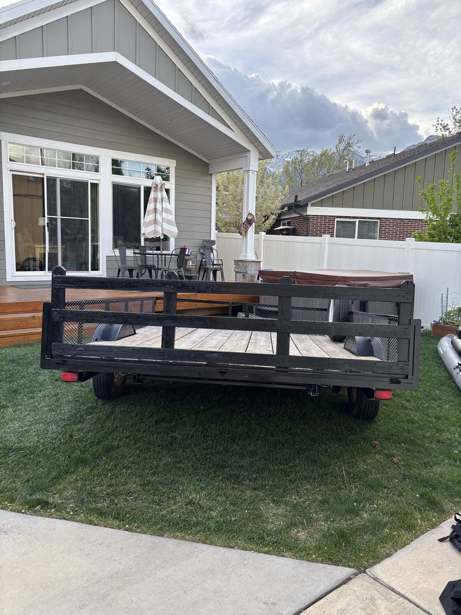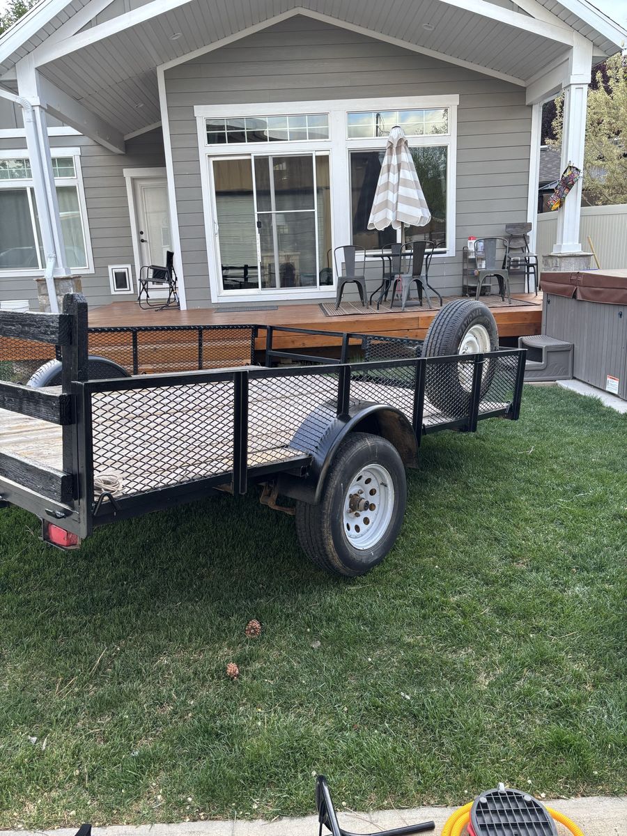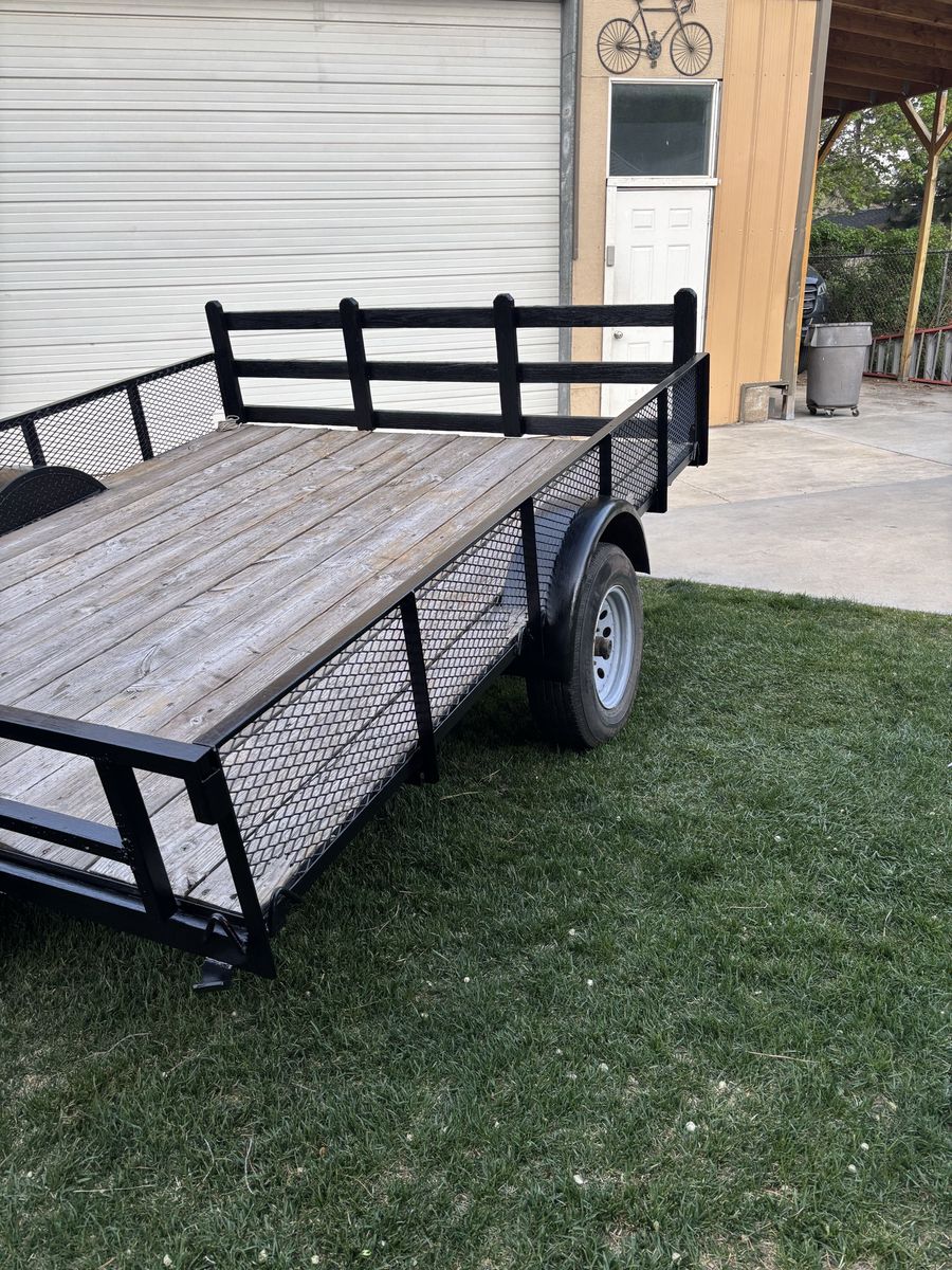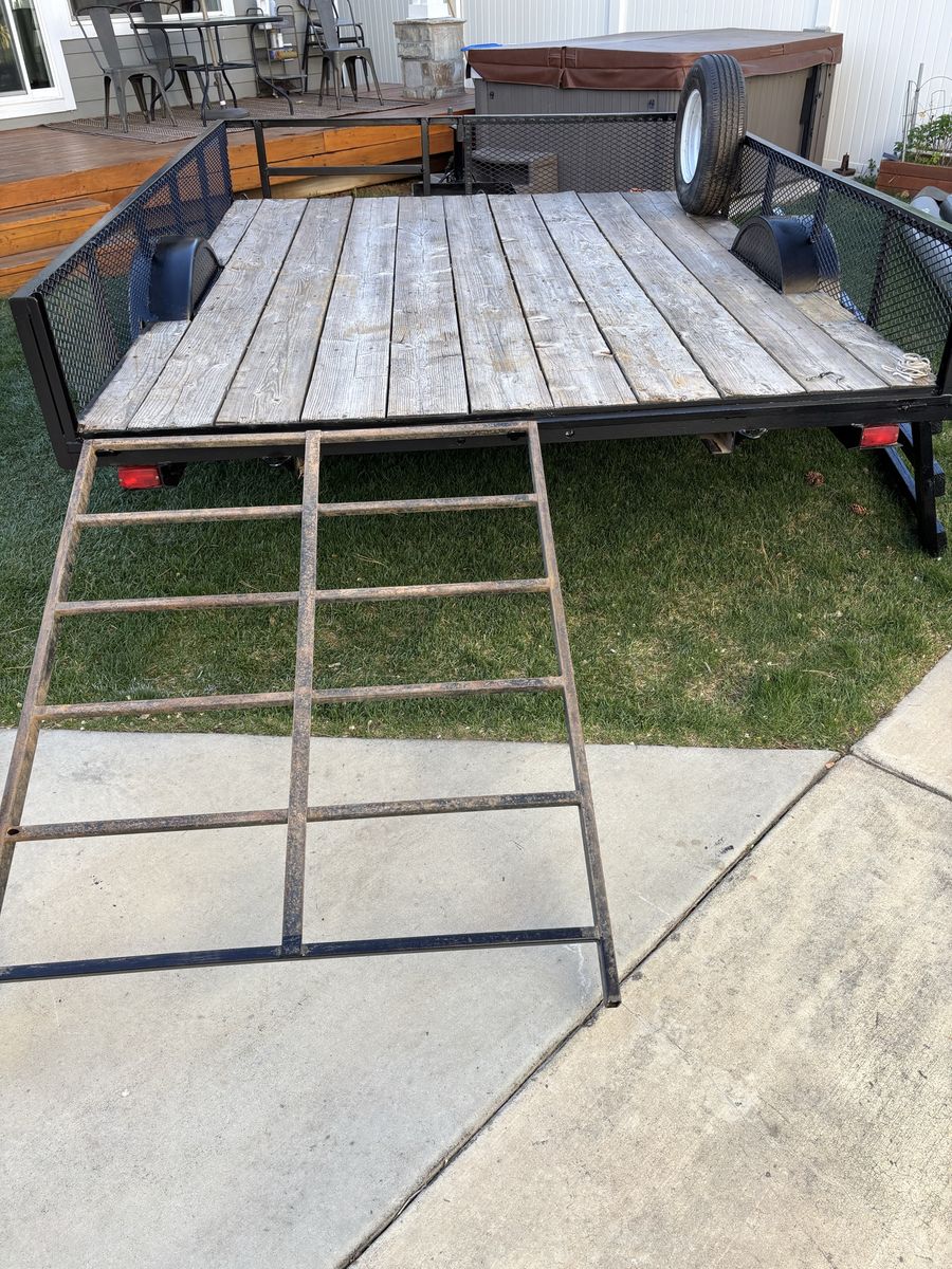 Venmo8 x 10 utility trailer. Heavy duty with metal mesh on the sides. 2 x 10 wood decking. Also, the front railing on the left side can be removed to accommodate long boards. Includes an ATV ramp which can attach to either the right or left side of the rear of the trailer. Has been well maintained and is in good condition.