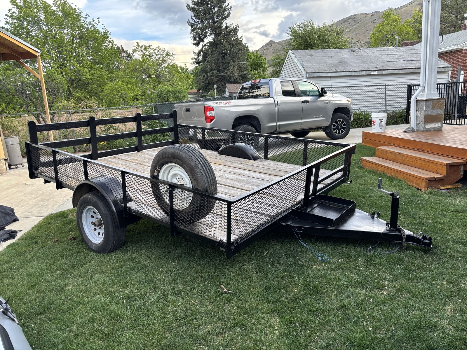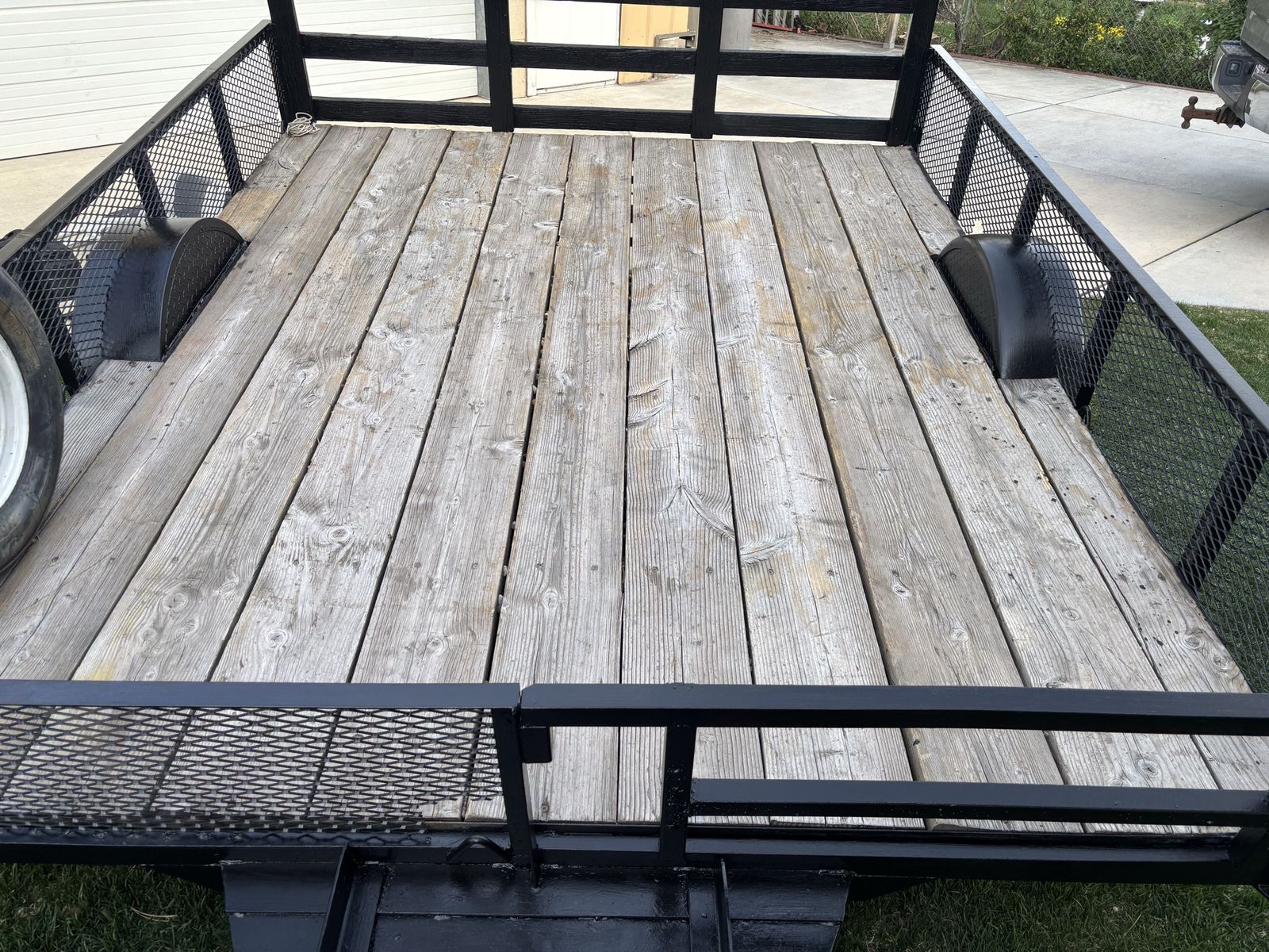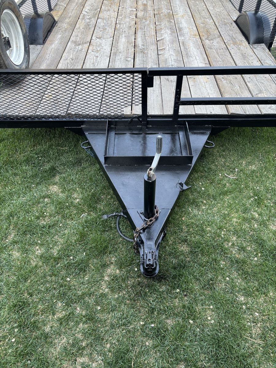 Venmo8 x 10 utility trailer. Heavy duty with metal mesh on the sides. 2 x 10 wood decking. Also, the front railing on the left side can be removed to accommodate long boards. Includes an ATV ramp which can attach to either the right or left side of the rear of the trailer. Has been well maintained and is in good condition.