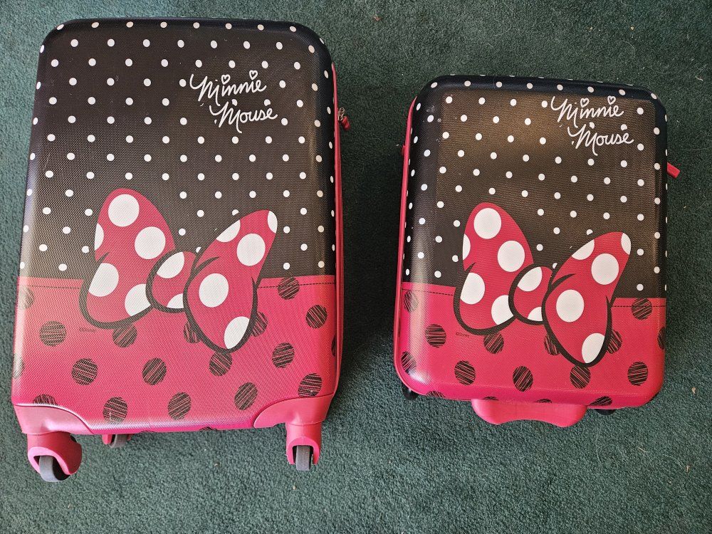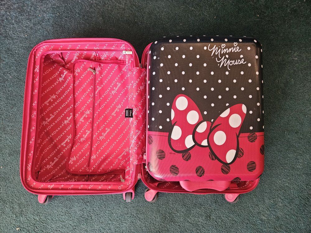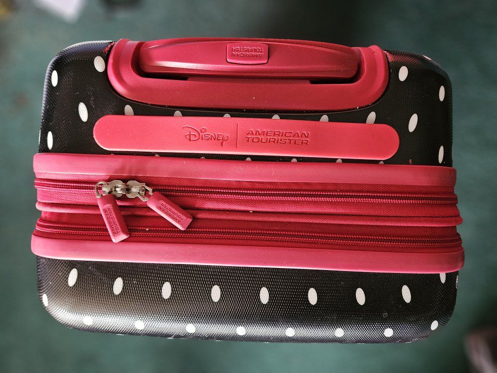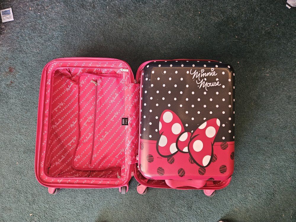 American Tourister Minnie Mouse hardside carry-on luggage set. The smaller "under seater" suitcase has never been used and nestles inside the larger 20 inch carry-on suitcase. Everything works perfectly and is very clean, we just don't use these anymore.