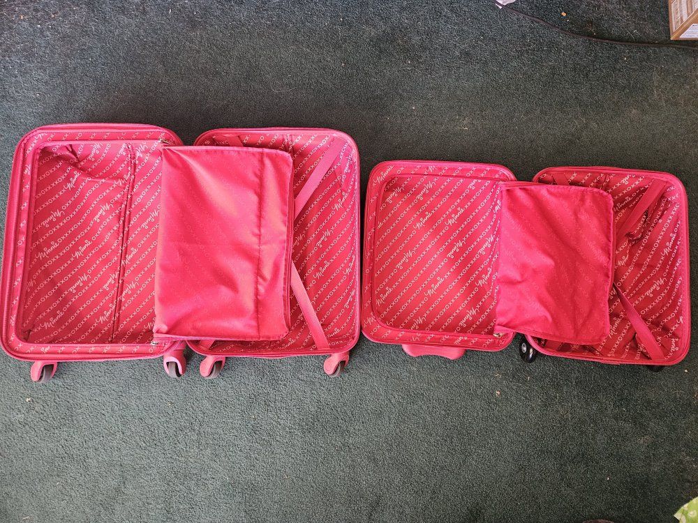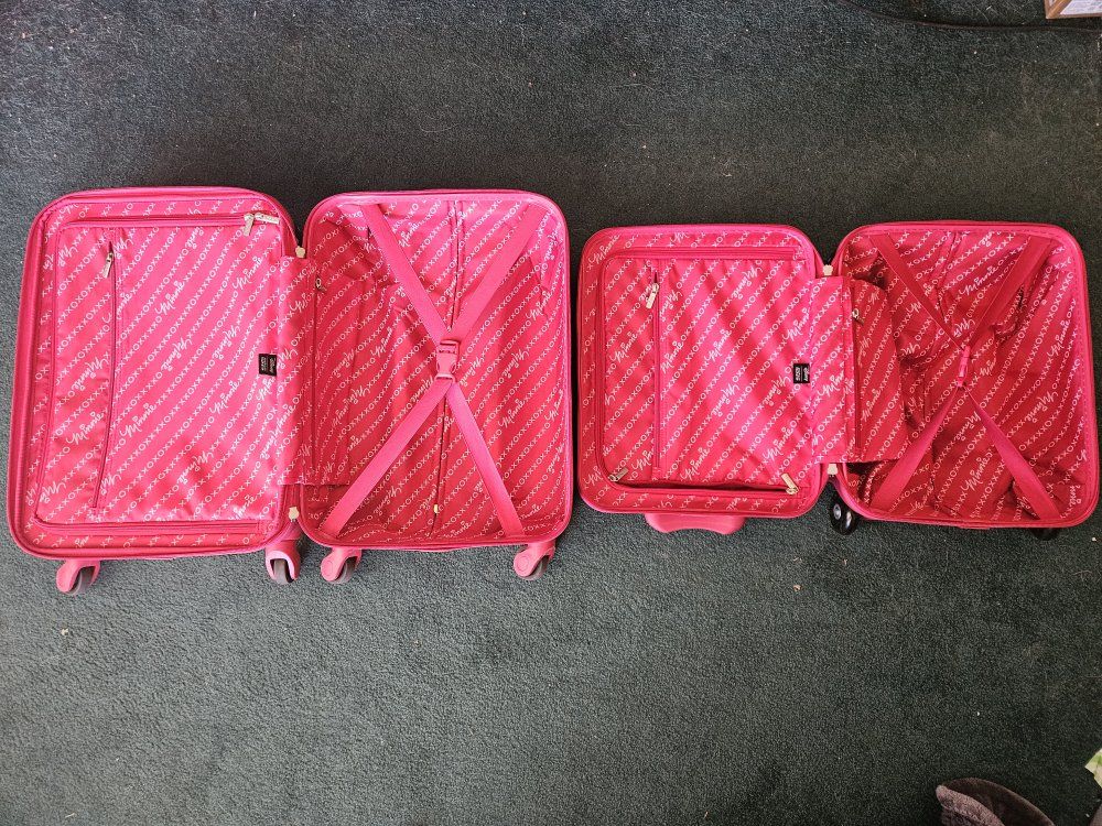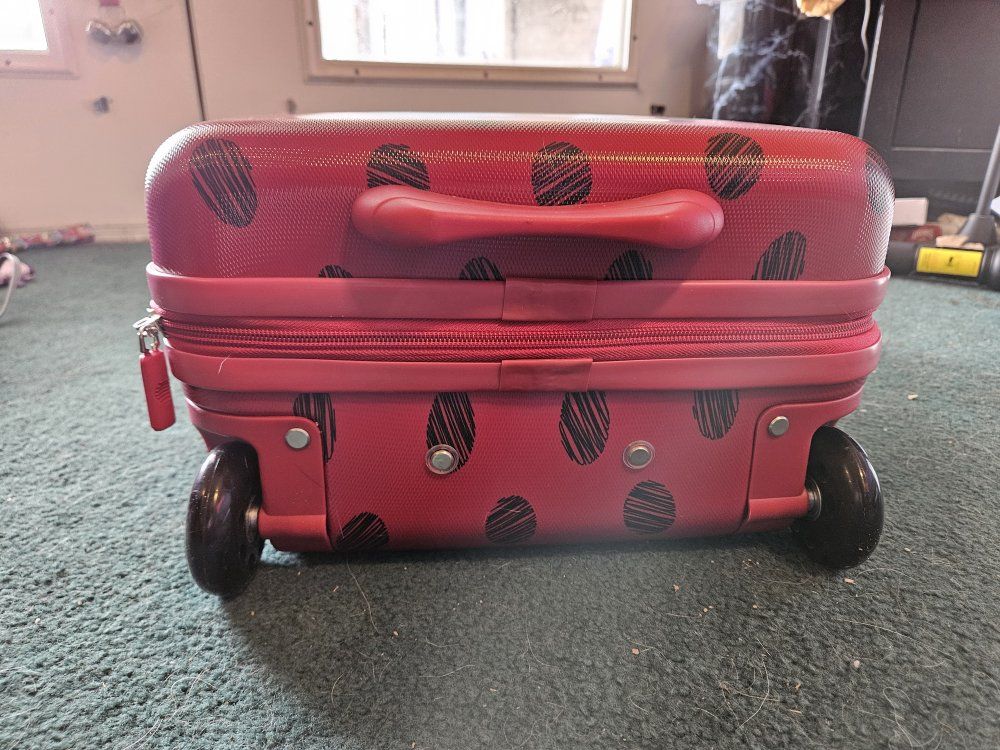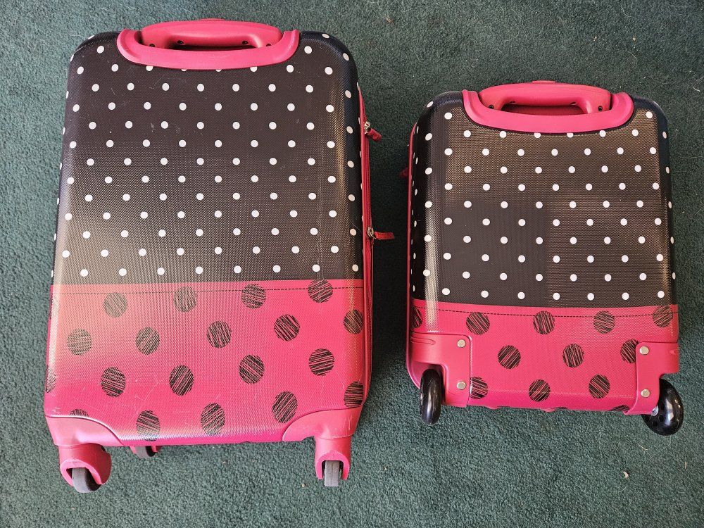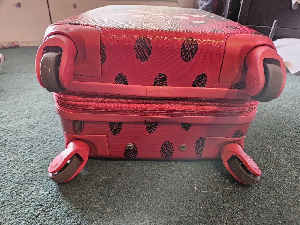American Tourister Minnie Mouse hardside carry-on luggage set. The smaller "under seater" suitcase has never been used and nestles inside the larger 20 inch carry-on suitcase. Everything works perfectly and is very clean, we just don't use these anymore.