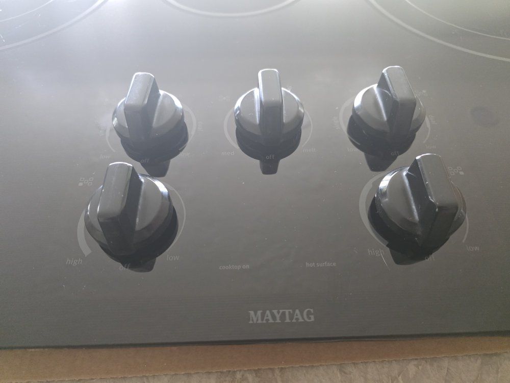 VenmoMaytag 36-inch Wide Electric Cooktop with Dual-Choice Elements. There are 5 burners, with the dual choice on two of them. The dual choice allows you to select from two different sizes of elements on a single burner. There are some minor scratches, but overall is in great shape. Uses 220volt and the power cord is attached. It's hard to get a good picture because of reflections from the ceiling and arms/camera. We've loved the cooktop, but needed a smaller one with a kitchen renovation. Model number is MEC9536BB00