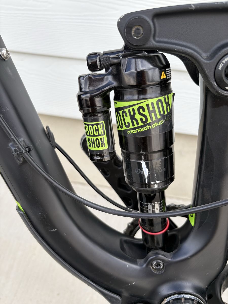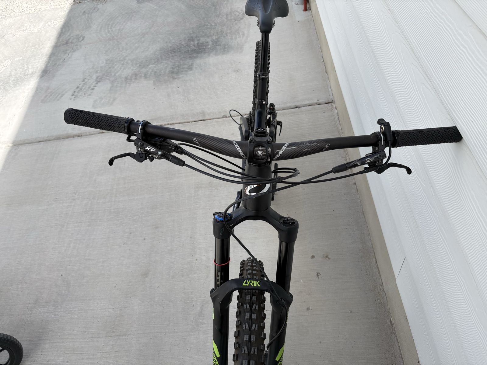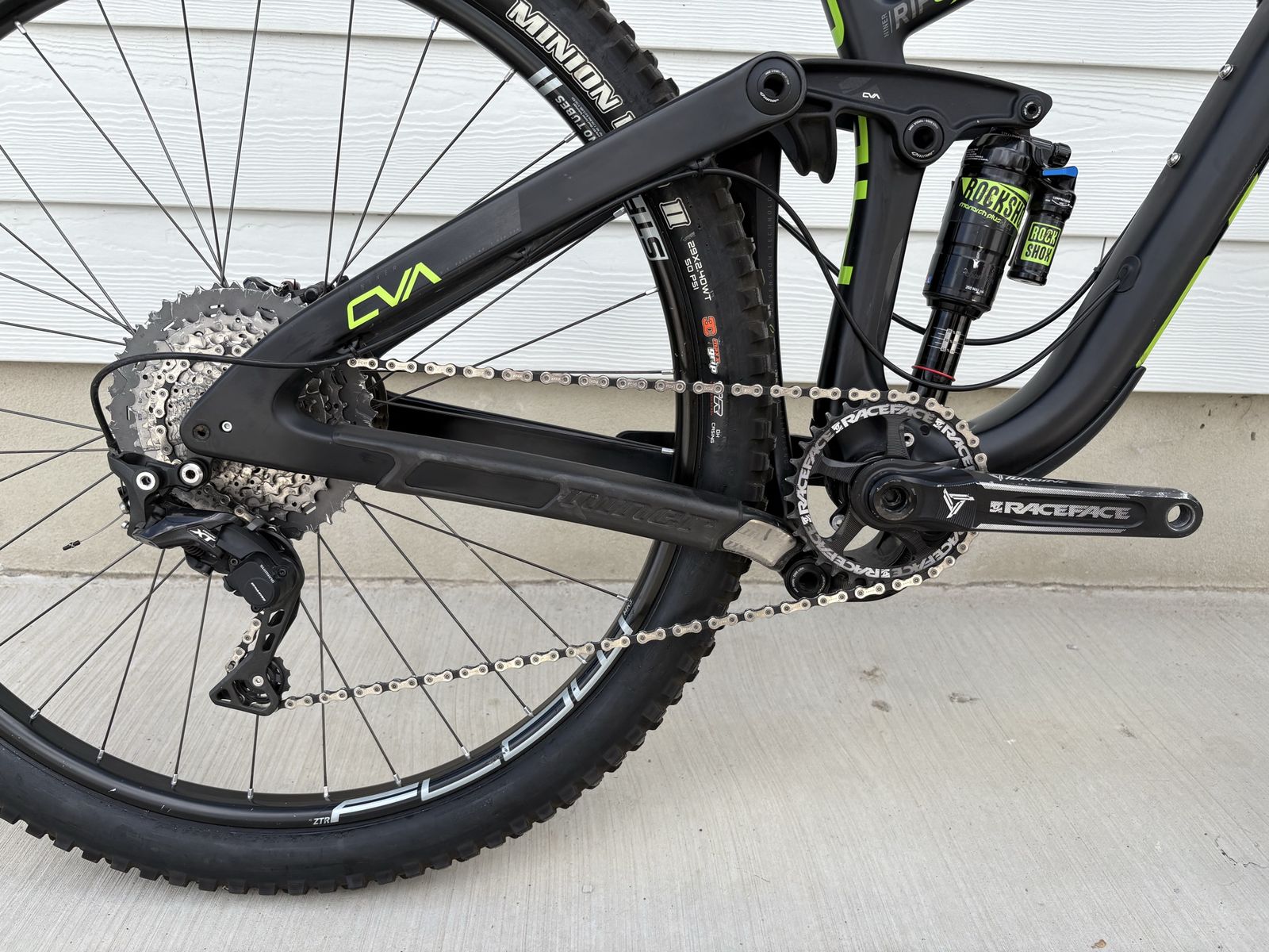 VenmoCarbon fiber full suspension mountain bike has a matte black frame with neon green accents. This 2016 Niner RIP 9 RDO features a RockShox Lyrik fork and RockShox Monarch Plus rear shock. It is equipped with a Shimano XT 1x11 drivetrain, RaceFace Turbine cranks, and Shimano XT hydraulic disc brakes. The 29-inch wheels are Stans NoTubes ZTR Flow MK3 with Maxxis Minion DHF and DHR II tires. It includes a dropper seatpost and RaceFace handlebars.