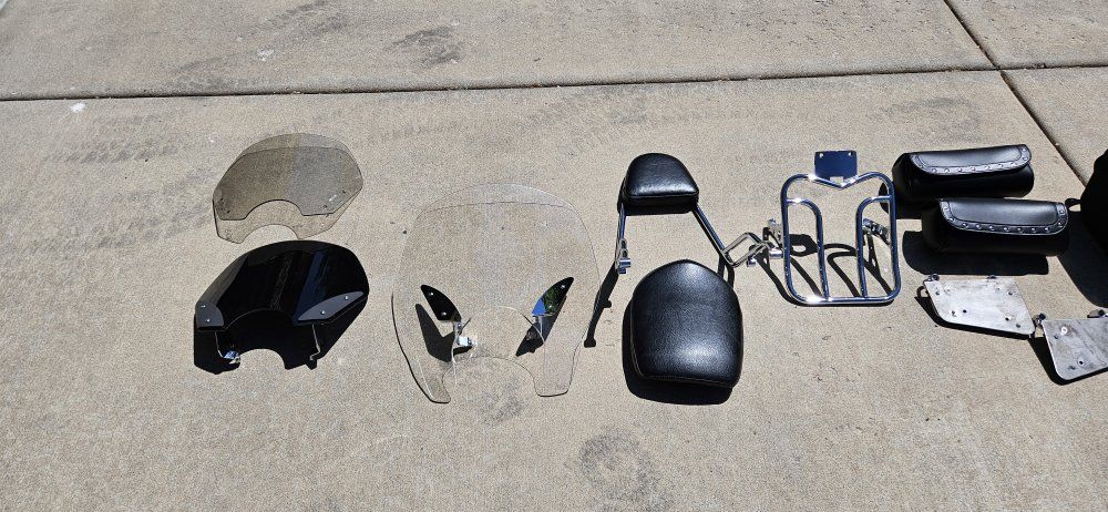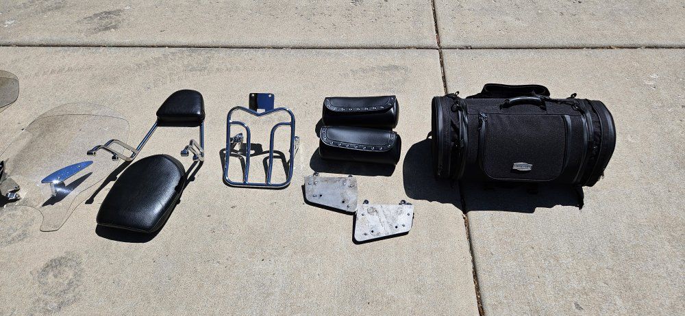 INCLUDED ITEMS WITH ASKING PRICE *MC Enterprises Sissy Bar (P/N 291-33) *MC Enterprises Luggage Rack(P/N 150-38) *MC Enterprises Saddle Bag Guards (P/N 140-33) *MC Enterprises Additional Hardware Kit (P/N 140-38AK) *1 Yamaha Star Accessory Boulevard Windshield *2 Medium 19" Clearview Windshields with Blvd. Brackets (P/N YAM-RWDM) *Yamaha Roadstar Warrior Cover *Kuryakyn Classic Tour Bag (P/N 4144) *Bungee Nuts Rear Fender Stays 8mm x 1.25 *Harbor Freight Motorcycle Dolley *Lots of other misc. Items as well.