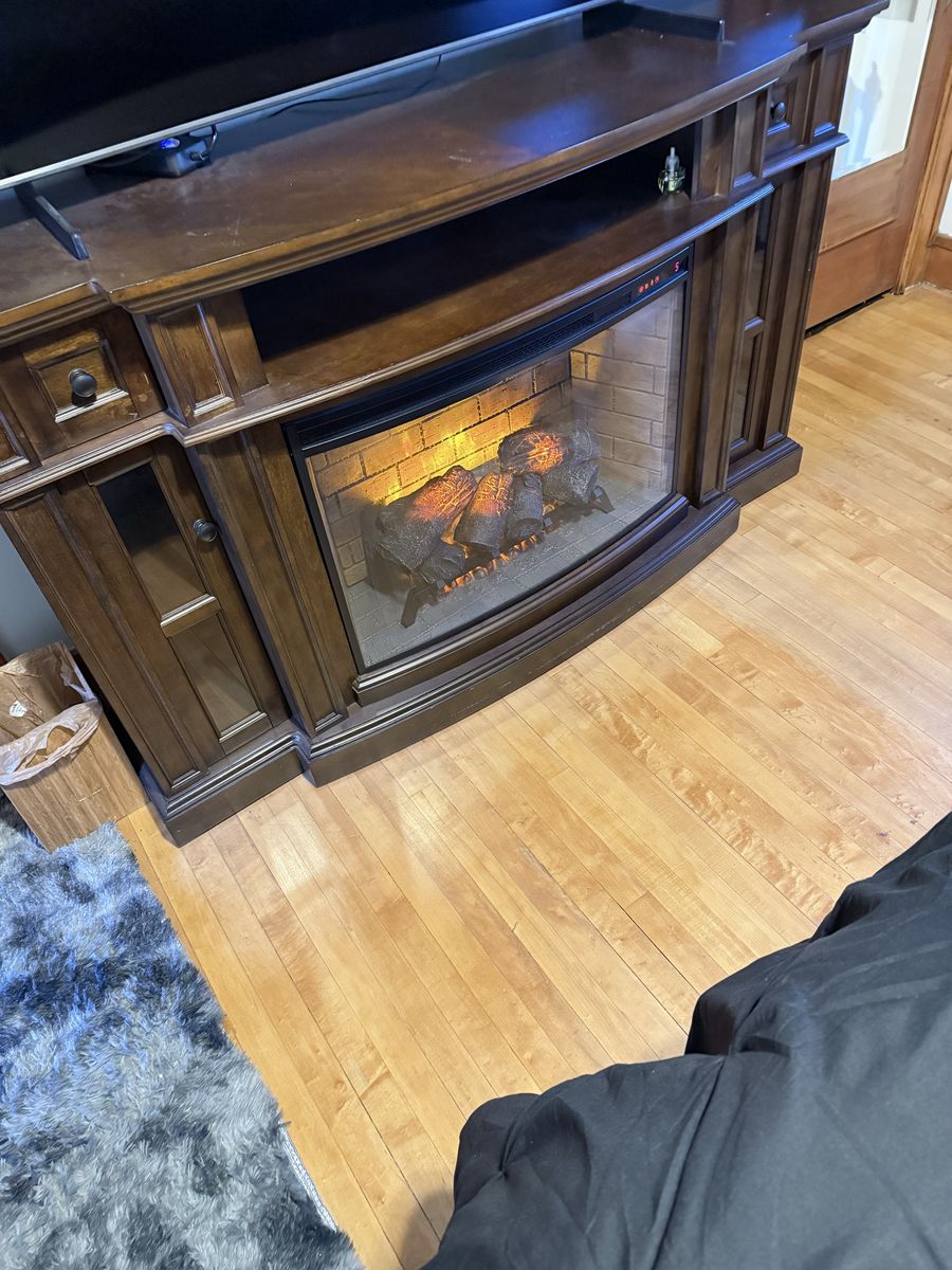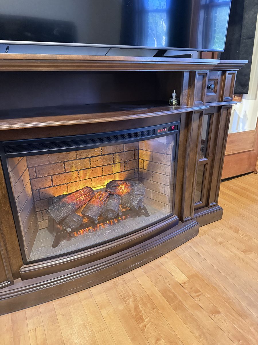 I don’t have the exact dimensions but it holds an 85” TV fine. Electric fire place is nice for those cold nights or just the ambience of a fireplace.