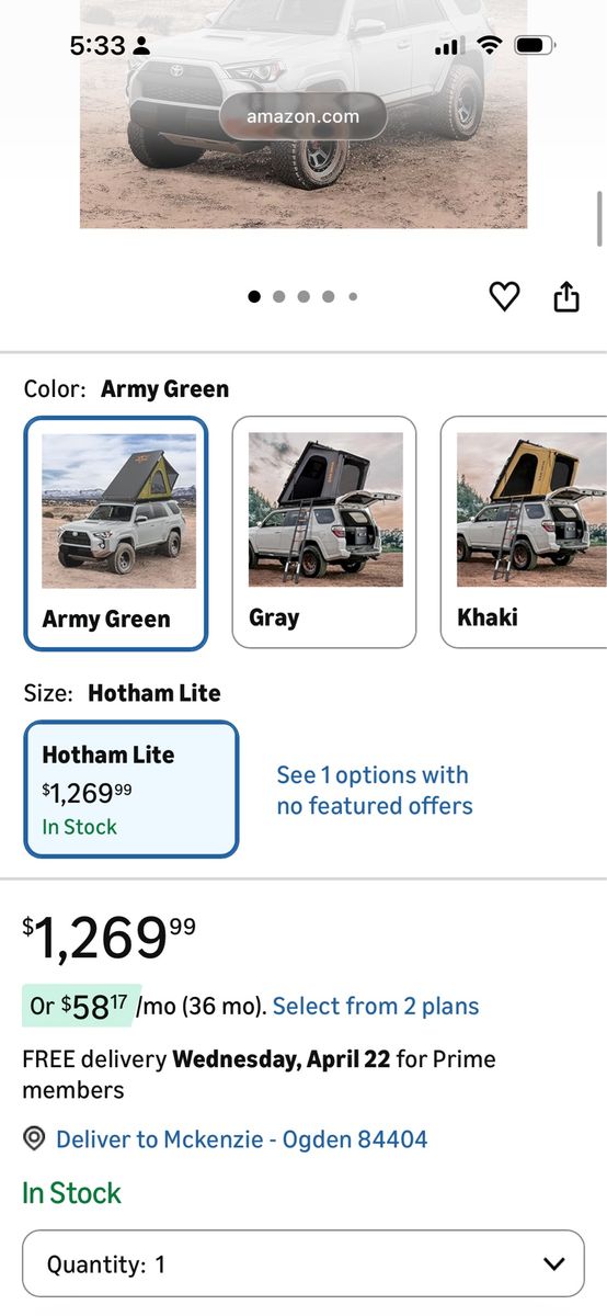Only used once and ended up not needing it anymore after the first use. Brand new condition, no issues and it worked great! Traveled well with no issues attached to the roof rack. Below is the link for Amazon.com. I bought for $1269.99, not including tax. Looking for $1000 obo.