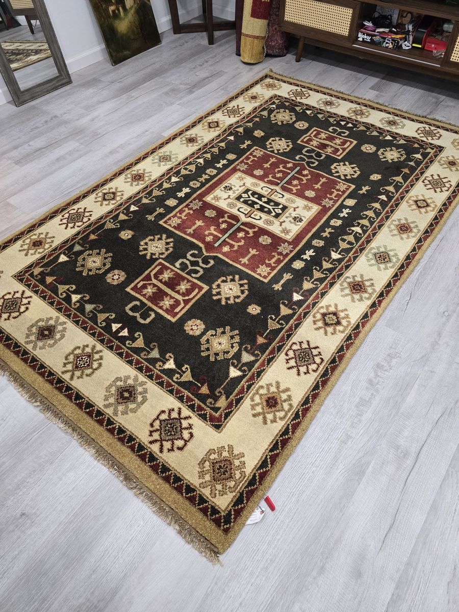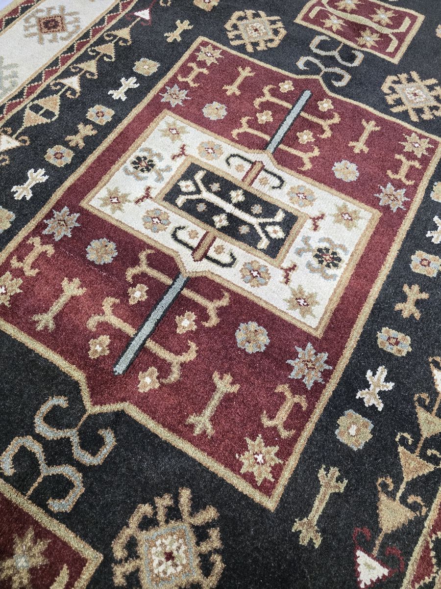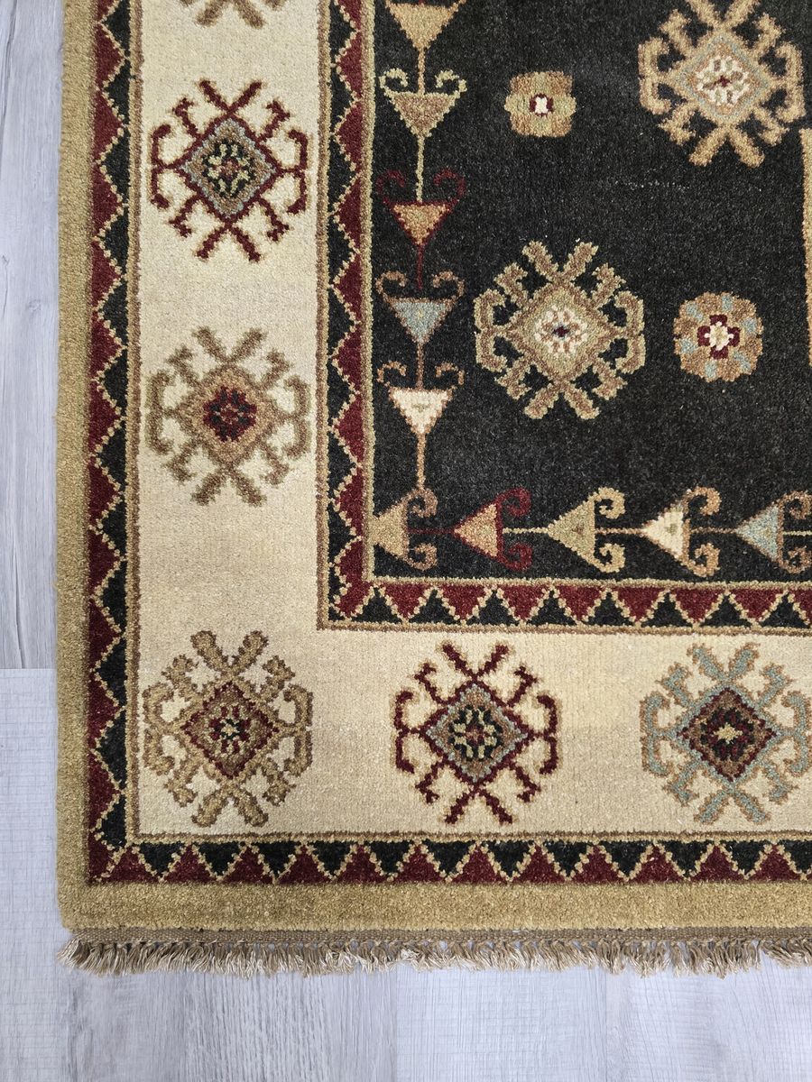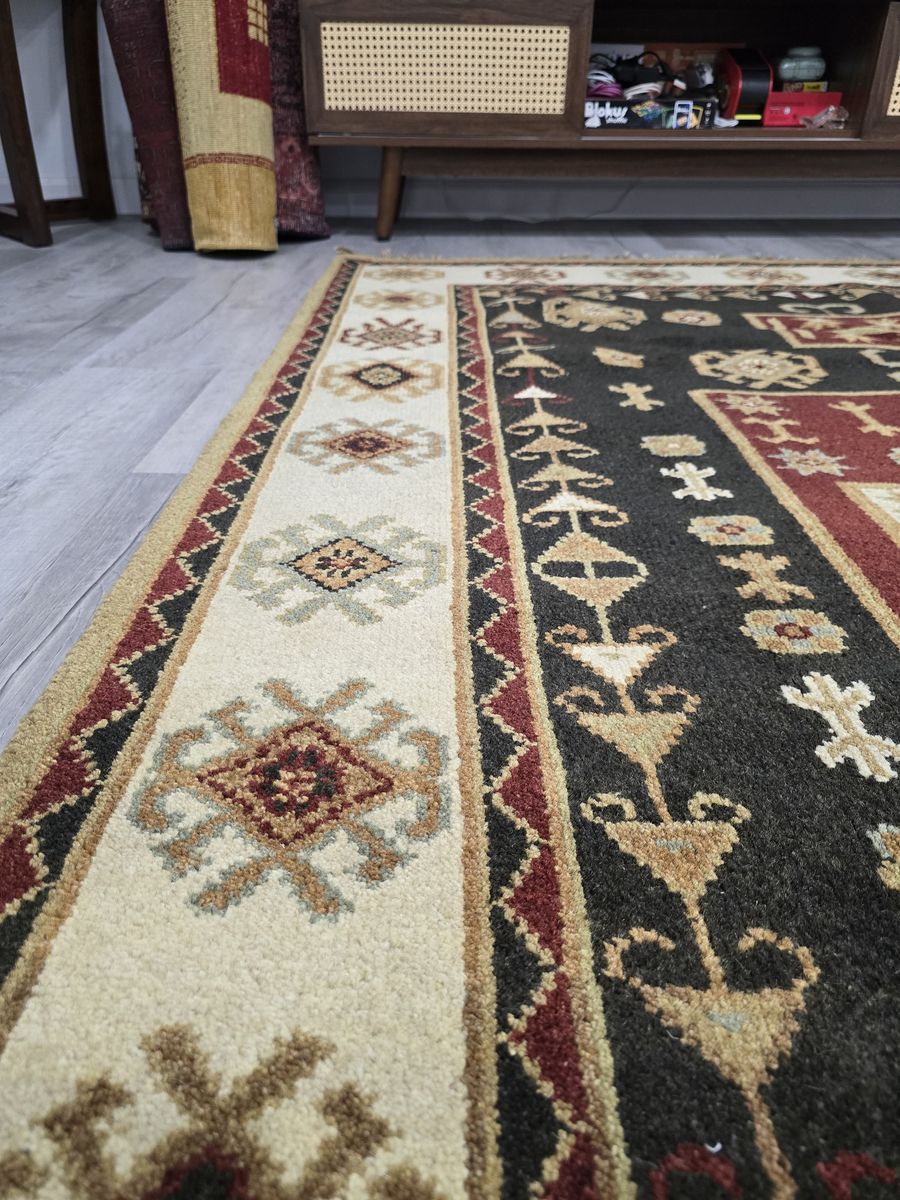VenmoWhere bold geometry meets cozy charm. This Kazak features a black field with patterns in rich reds, golds, and earthy tones that instantly add personality. It is mainly geometrical, but nice hints of floral motifs. The size is also versatile--it can work for a living room or even a hallway. It is durable, timeless, and easy on the eyes.