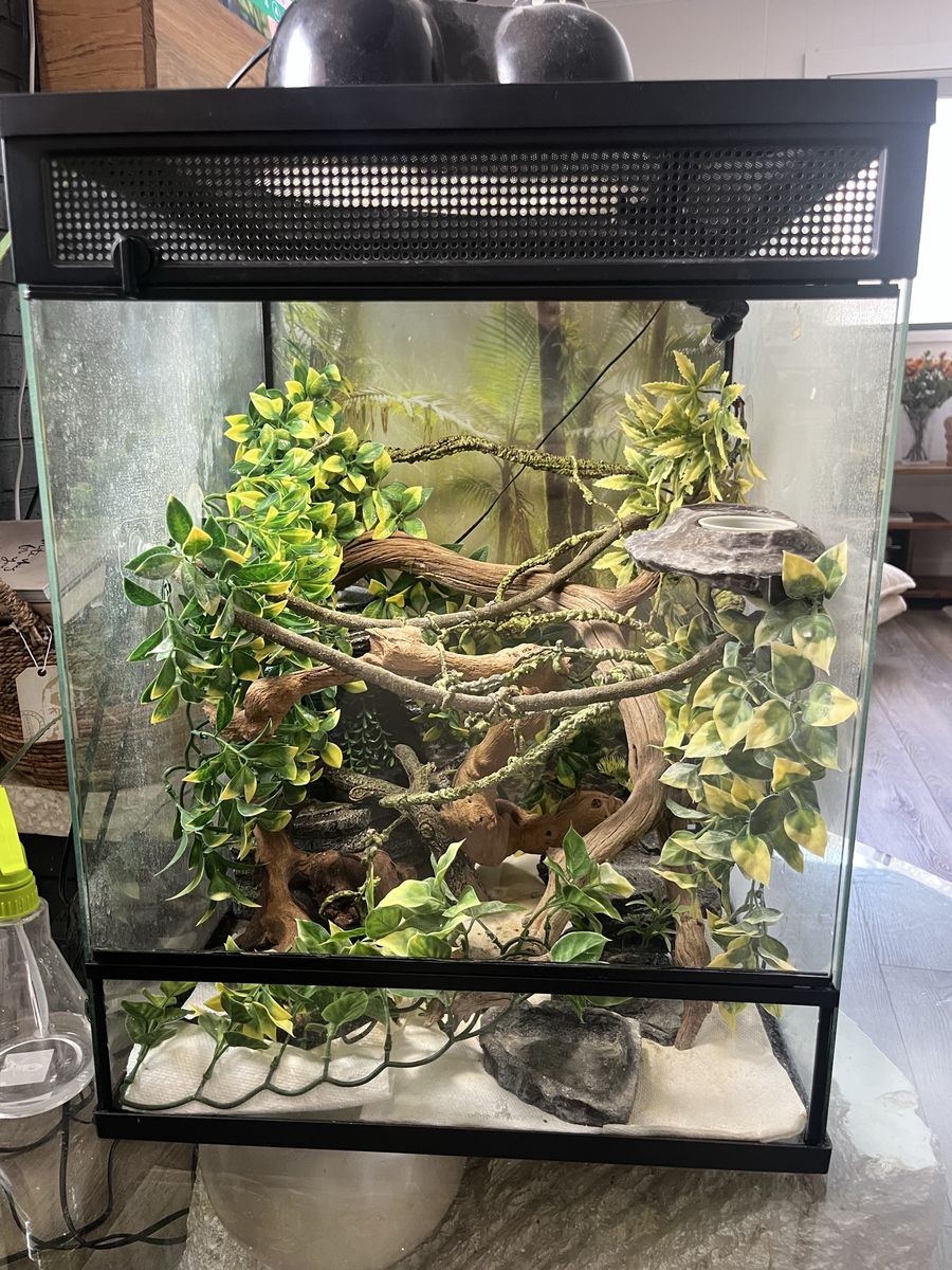 ApplePayReptile tank I kept my Pygmy lizard in but he’s getting an upgrade so I don’t need this tank anymore. The back has a nice backdrop to add the rainforest feel, the sides have some water on it but you can clean it off to have it look better and the front is perfectly clean.