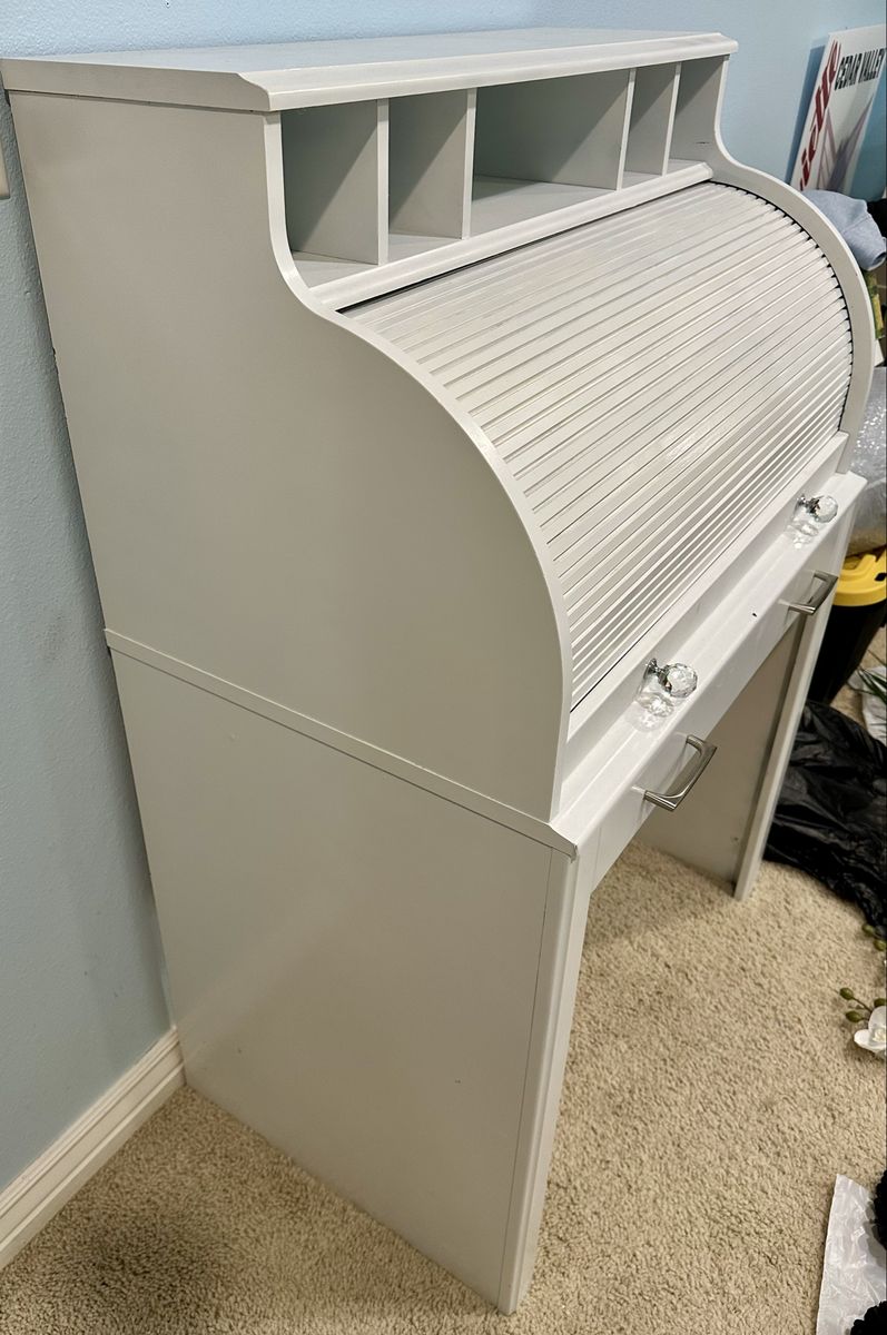 ApplePaySmall roll top desk perfect for a small bedroom. The dimensions of the desk are: 32” wide, 20” deep and 46” tall at its tallest point.