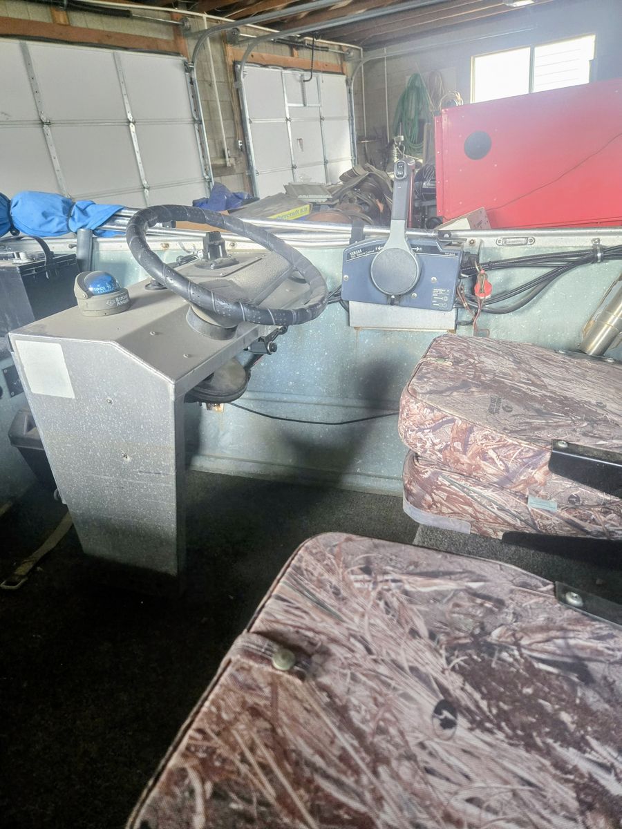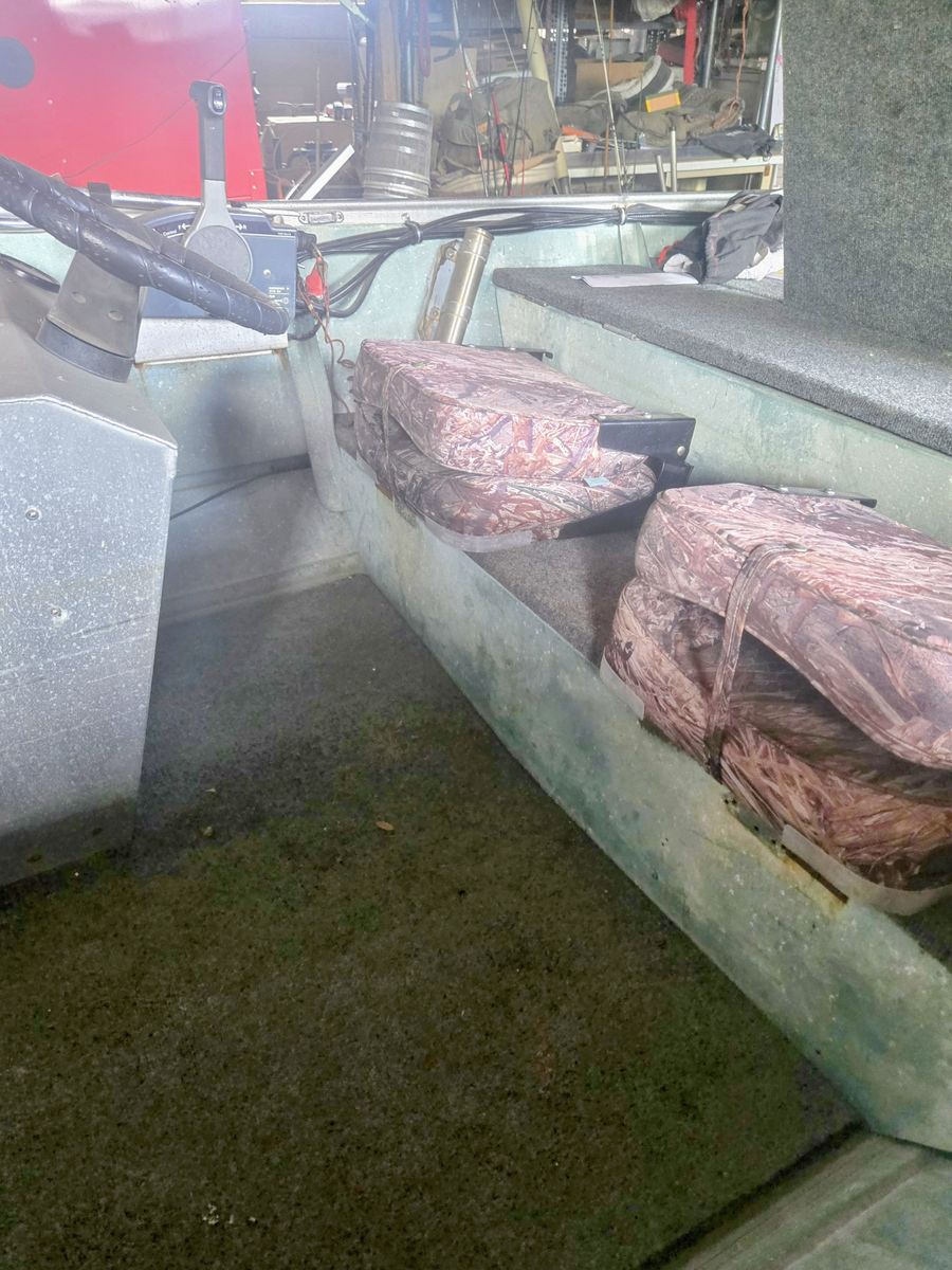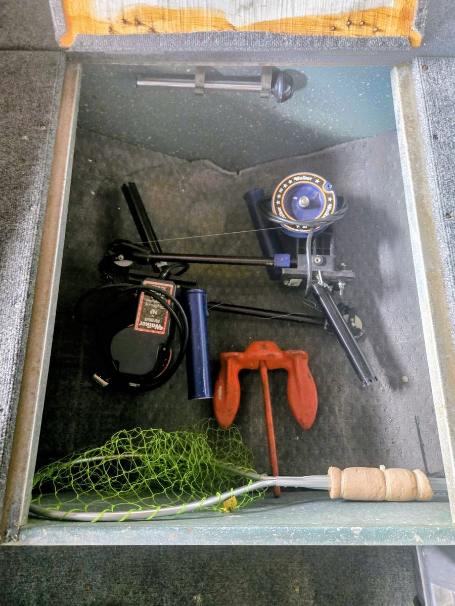 There is a large live well just behind the seats for quick and easy access, several storage areas both stern and aft, as well as under the seats. Light posts both stern and aft with secure storage for both when not in use, has easy drop swivel mount aft for easily lowering the anchor and a full bimini shade cover. New boat cover (which can be used while traveling) fish net, anchor, paddle and fire extinguisher included. Also has horn, compass, a lighter (in case you want to plug something else into the boat while fishing Boat is fully carpeted with marine grade high quality carpet. I'm sure I'm missing something you will see when you check it out!