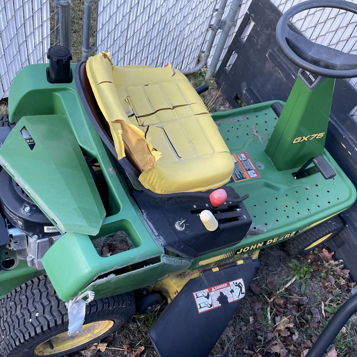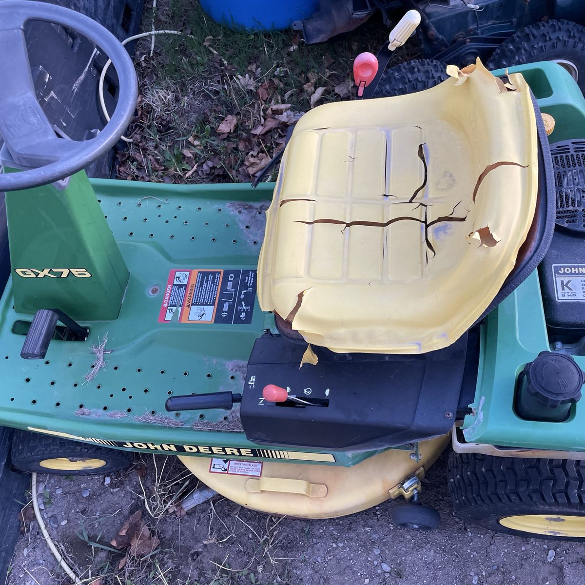 VenmoThis is a John Deere GX75 riding lawn mower. It is older, but was working up until last summer. Aesthetically it is in rough shape. Several of the green plastics pieces are cracked, as well as the seat (as pictured). The biggest issues are that the gas tank is cracked and needs to be replaced, and the battery also needs to be replaced. It was running fine last year. I haven’t put gas in it this year because of the cracked tank.