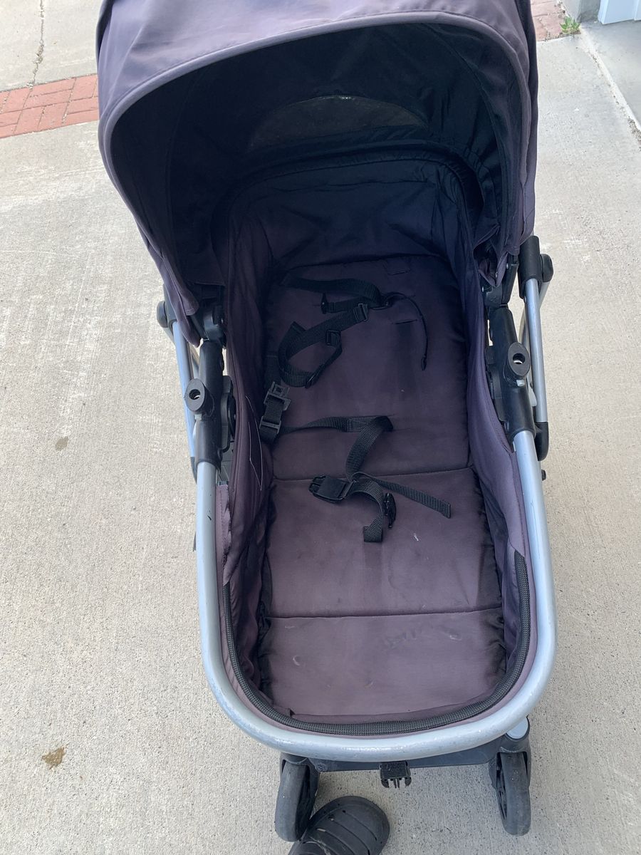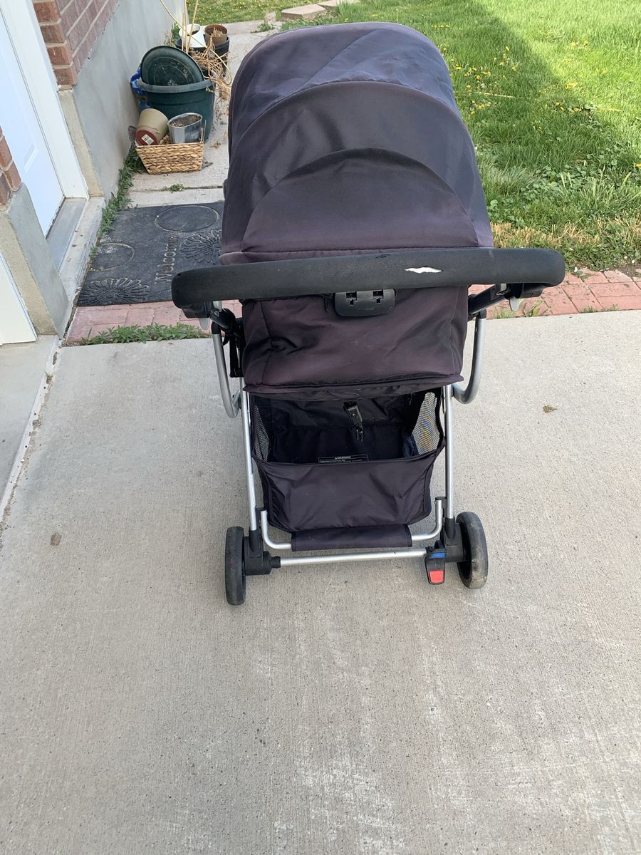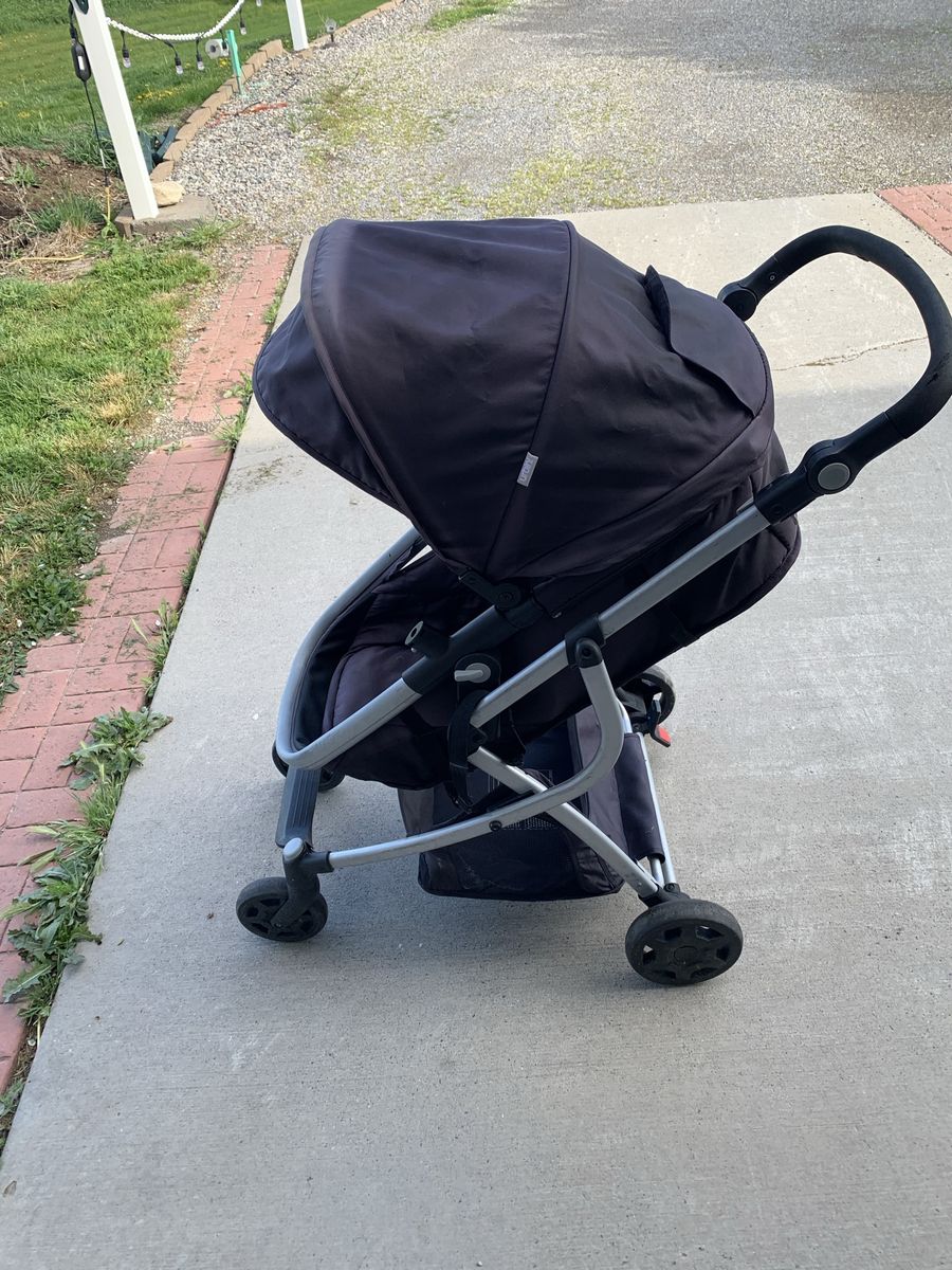 Folds with or without seat on. Seat adjusts to into bassinet and fully reclines. Pick up is at Logan Walmart.