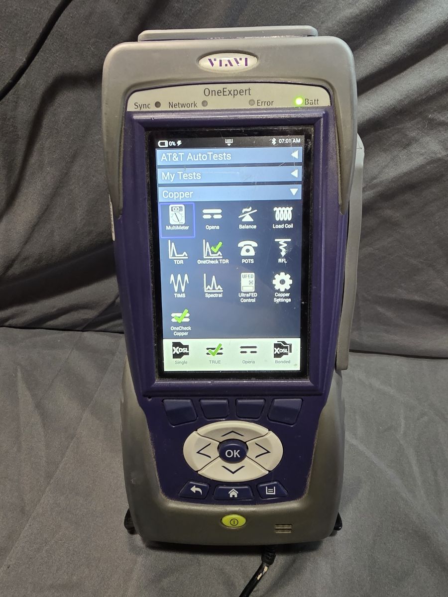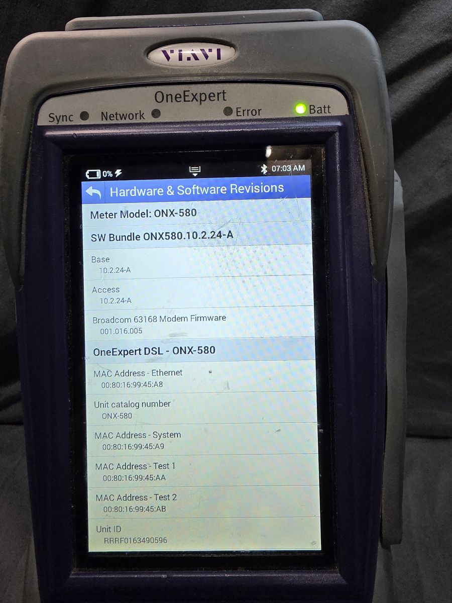 VenmoUp for sale is a VIAVI (formerly JDSU) ONX-580 OneExpert DSL tester with the Broadcom 63168 Annex-A Bonded Modem module installed. This unit was sourced from an auction. It has been powered on and confirmed to boot fully to the operating interface.