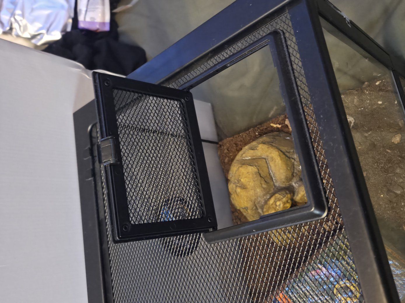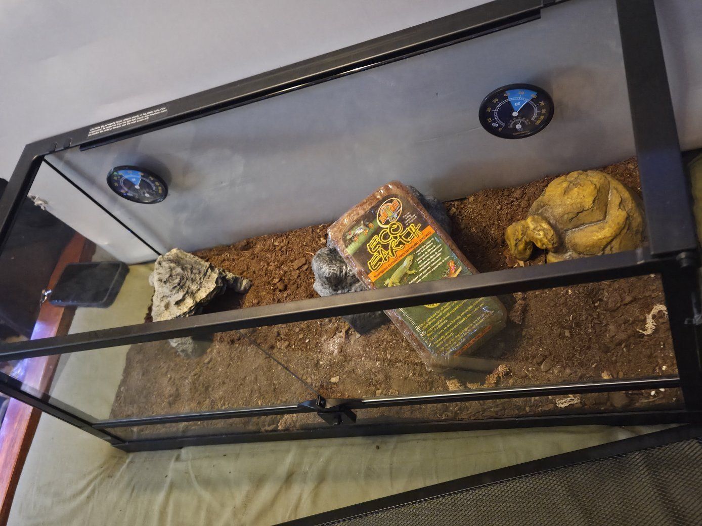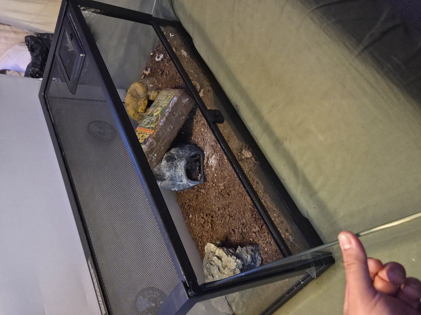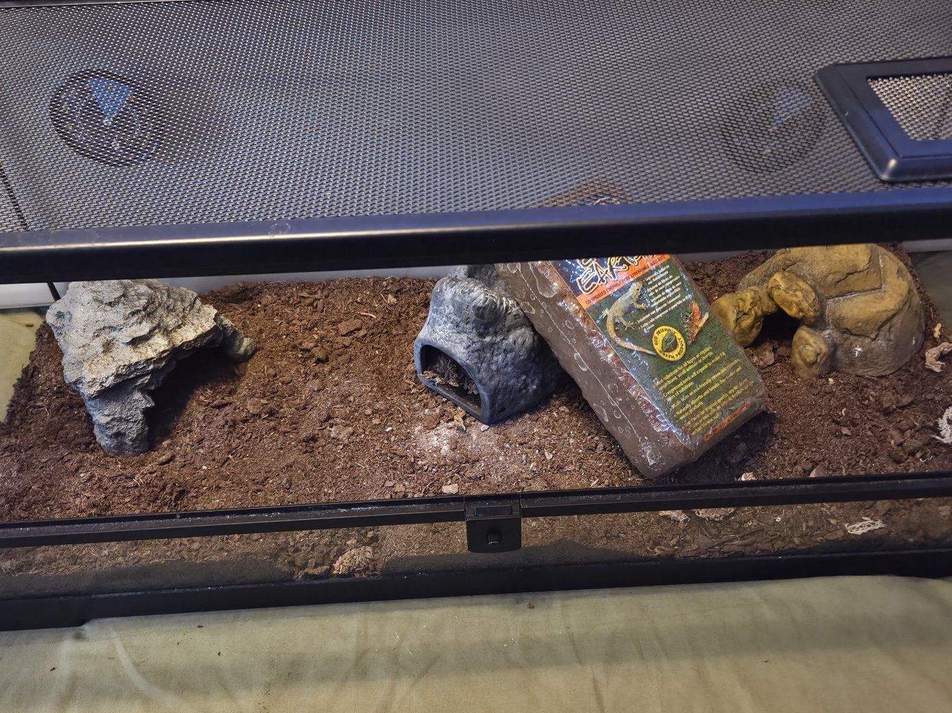 Venmowe just upgraded our tank and we won't be needing this one anymore everything is in perfect condition we've only had this for about 8 months old we left the substraight in because it is bioactive. Accessories comes with EcoEarth coco bedding and 3 hides, 2, 5.5 Deep Light Domes, 1 heating bulb 75w, 2 ZooMed heating bulbs 40W, 1 UBV bulb.